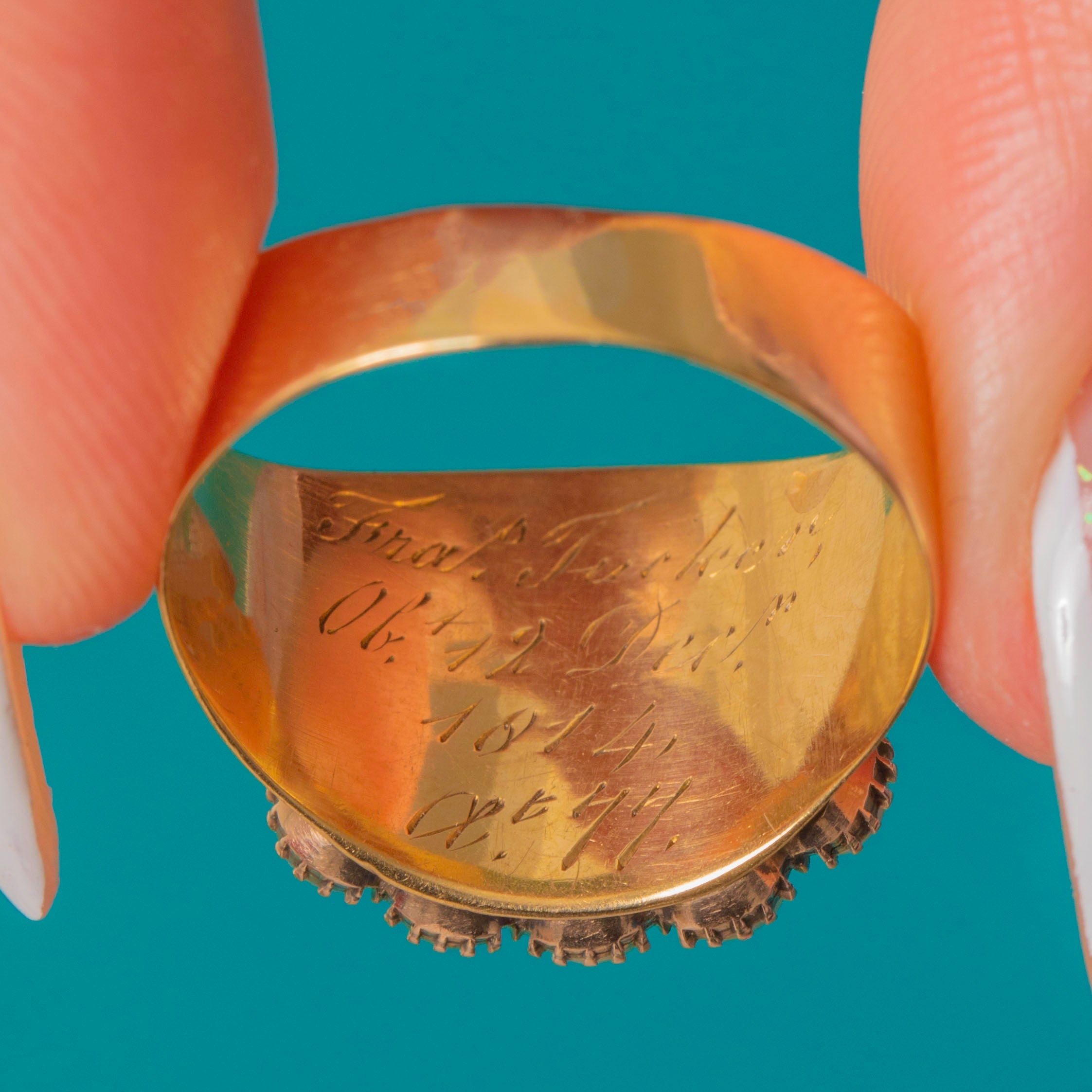 This Georgian 18ct Gold Garnet & Pearl cluster ring will make a striking statement. The ring boasts a brightly saturated 18ct Gold band with a high-shine polish that gleams in the light, and the inside is engraved with the inscription "Fra Tucker, OB: 12 Dec 1814, Age 77", adding to the ring's historical intrigue.