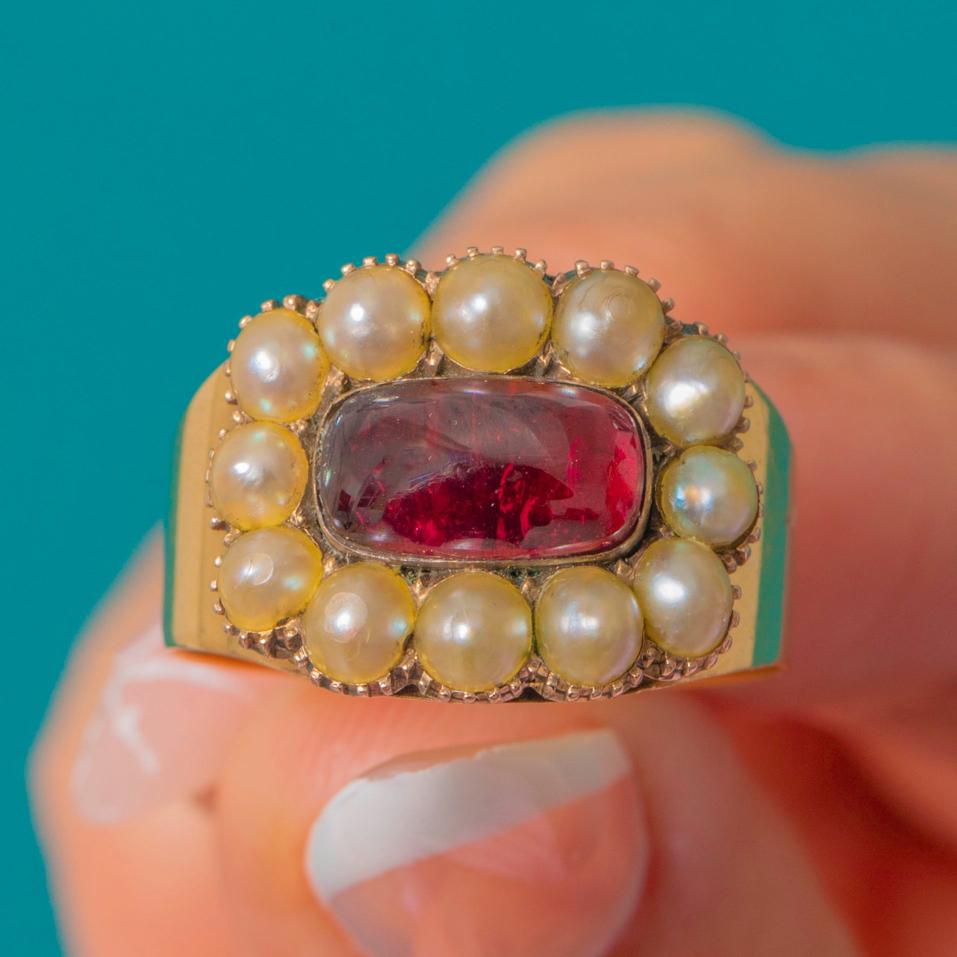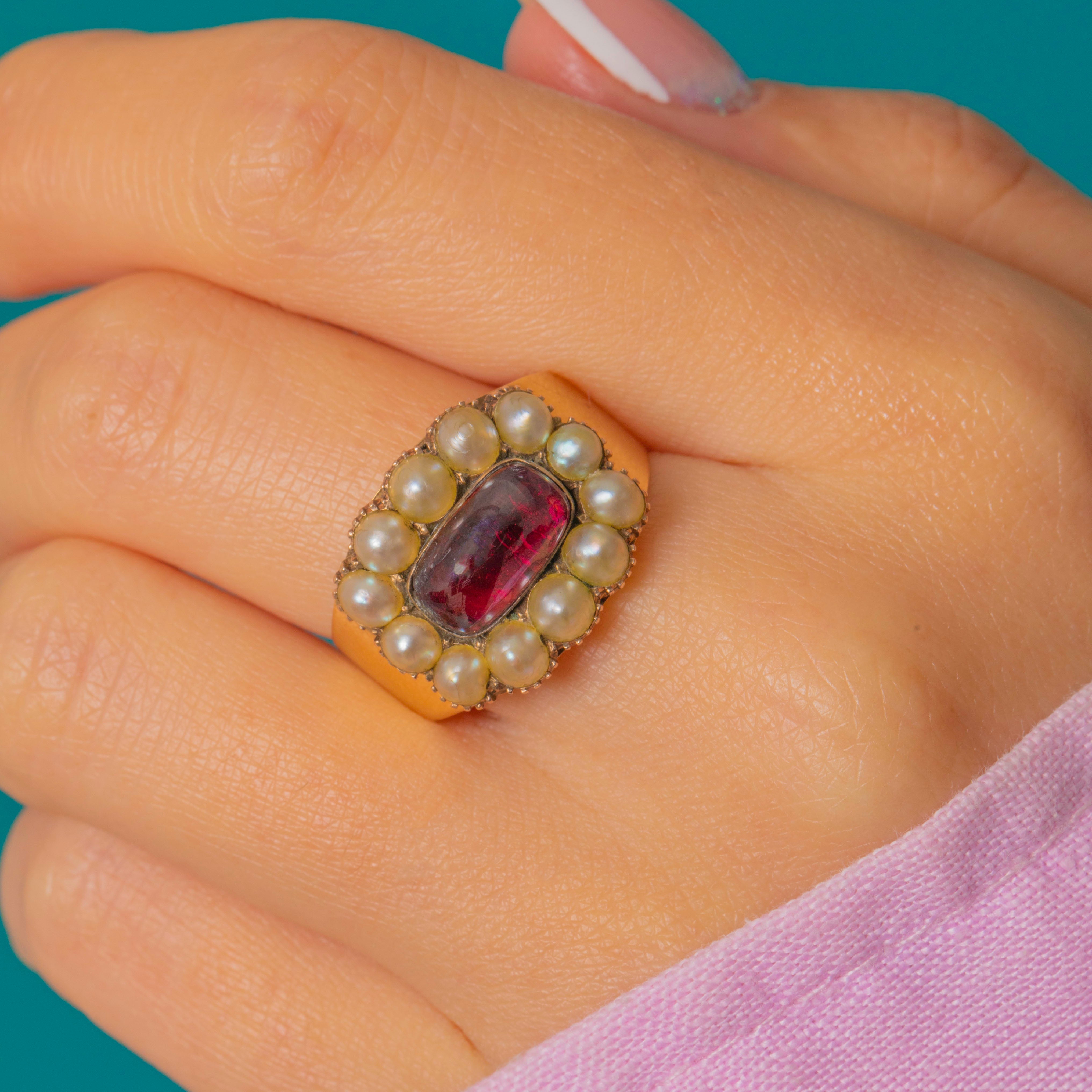 VERY GOOD: This Georgian 18ct Gold Garnet & Pearl cluster ring is in very good condition. The Gold is bright and smooth, with only minor surface wear, and feels comfortable on the finger. The Garnet has a mild scratch on its surface and some of the Pearls show signs of surface wear, but considering this ring is over two centuries old, this can easily be forgiven. The gems are all securely set and the wide band feels robust, allowing you to wear this antique Garnet & Pearl cluster ring with absolute confidence!