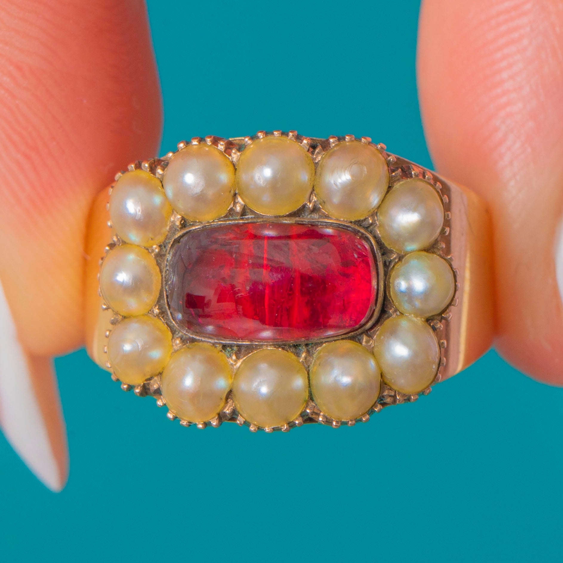 18ct Gold Georgian Garnet Cabochon Pearl Cluster Ring 1.60ct, c.1814 Item added