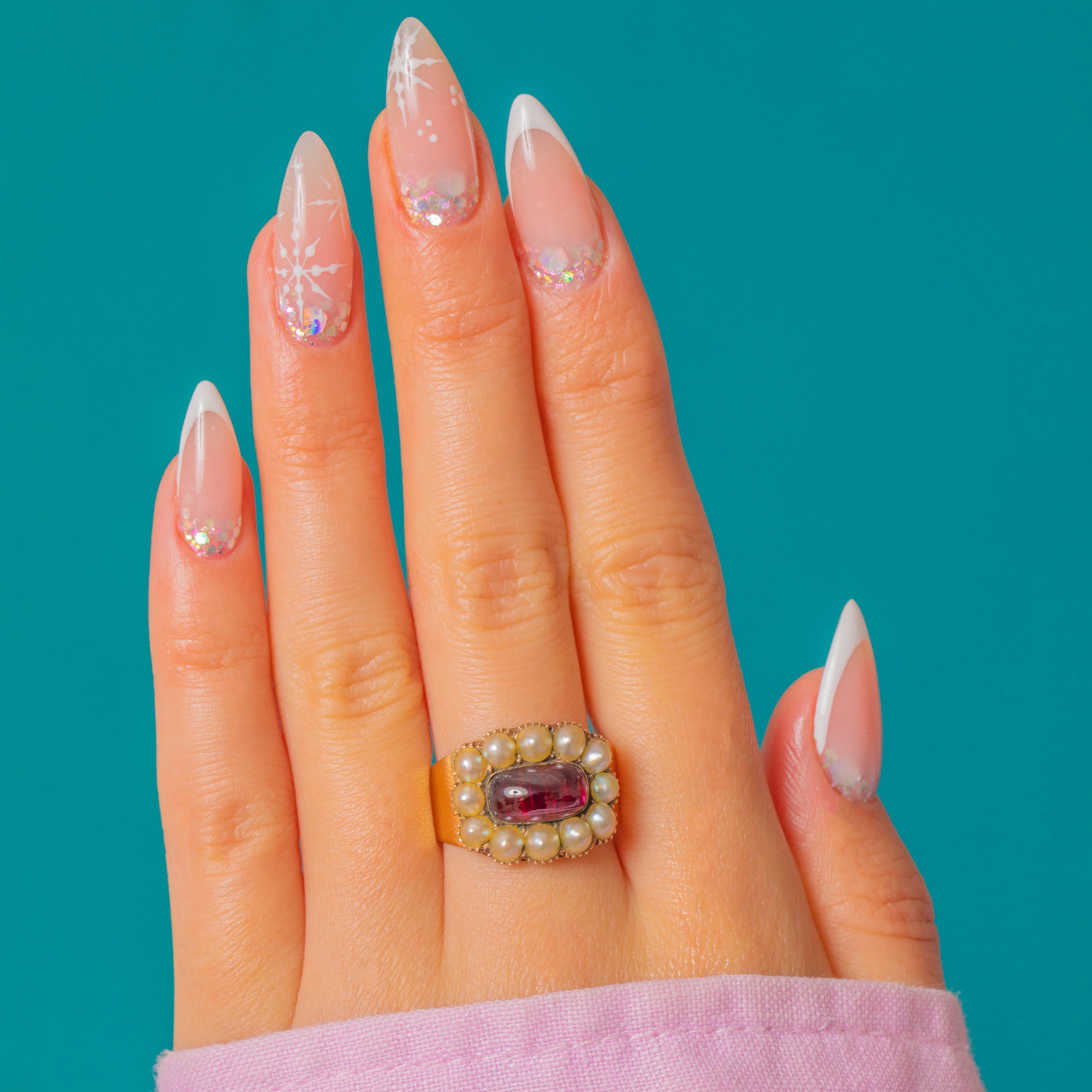 The impressive gemstone cluster will instantly grab your attention, with its large crimson 1.60ct Garnet cabochon and plump silvery Pearls making quite the statement. The Pearls are embraced by classically Georgian piecrust settings that add a lovely decorative finish.