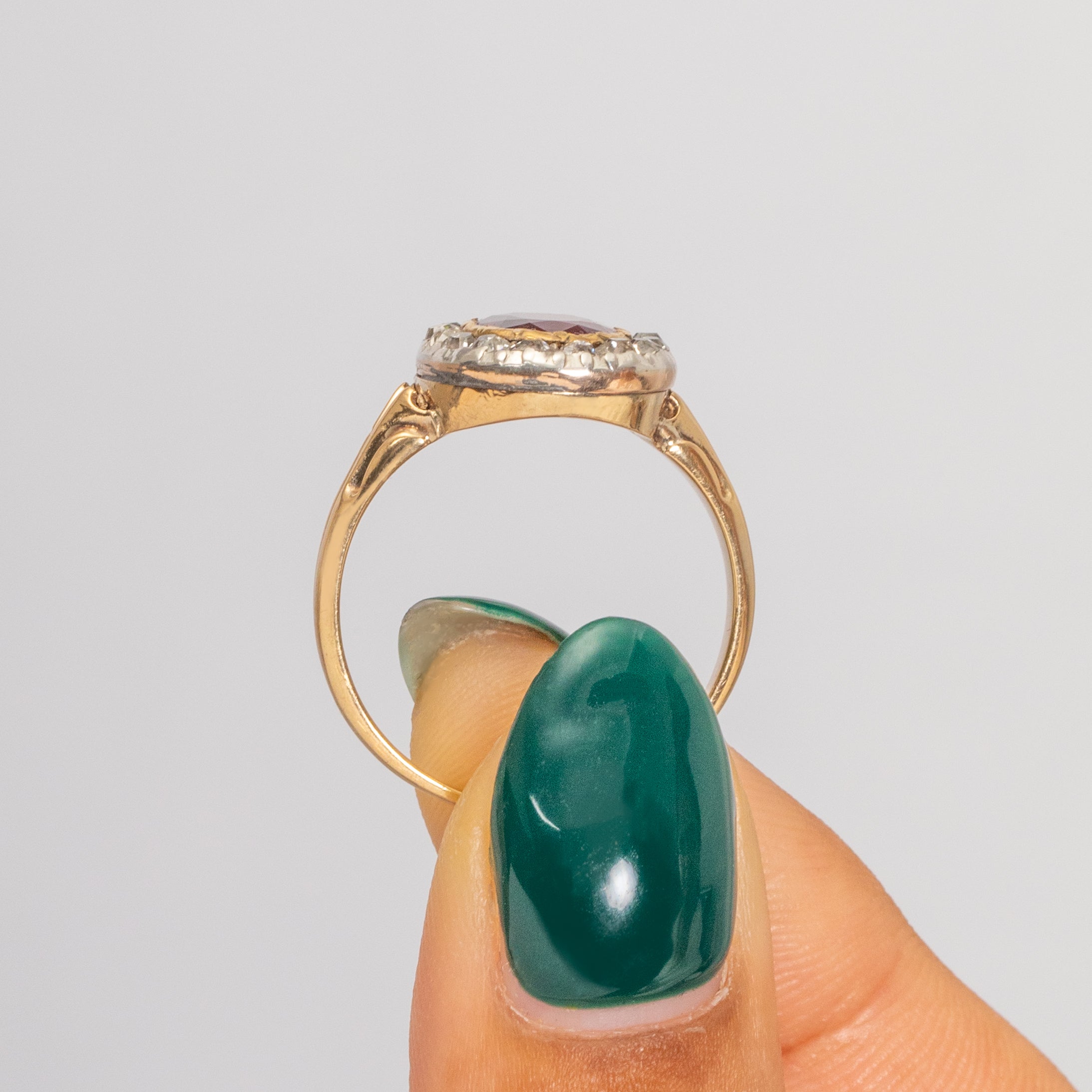 VERY GOOD TO EXCELLENT. This Georgian 18ct Gold Ruby Diamond cluster ring is in fabulous antique condition. The Ruby has a crisp set of facets and is securely held within its setting, free from nibbles or abrasions. The Diamonds are all present and free form fleabites, their Silver settings have worn slightly over time, yet hold each Diamond securely in place. The 18ct Gold is brightly saturated and the band is robust with no dings to note. With proper care and maintenance, this ring will last for generations to come!