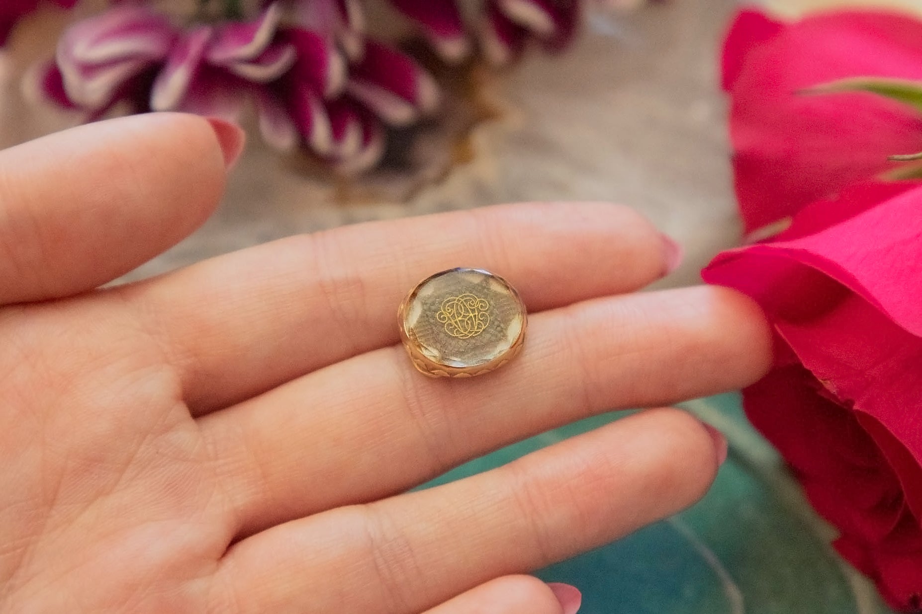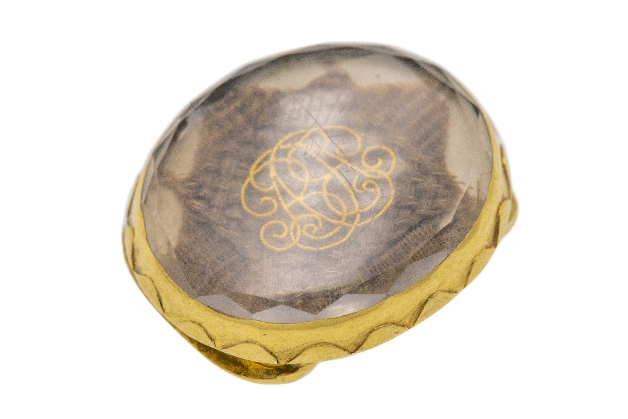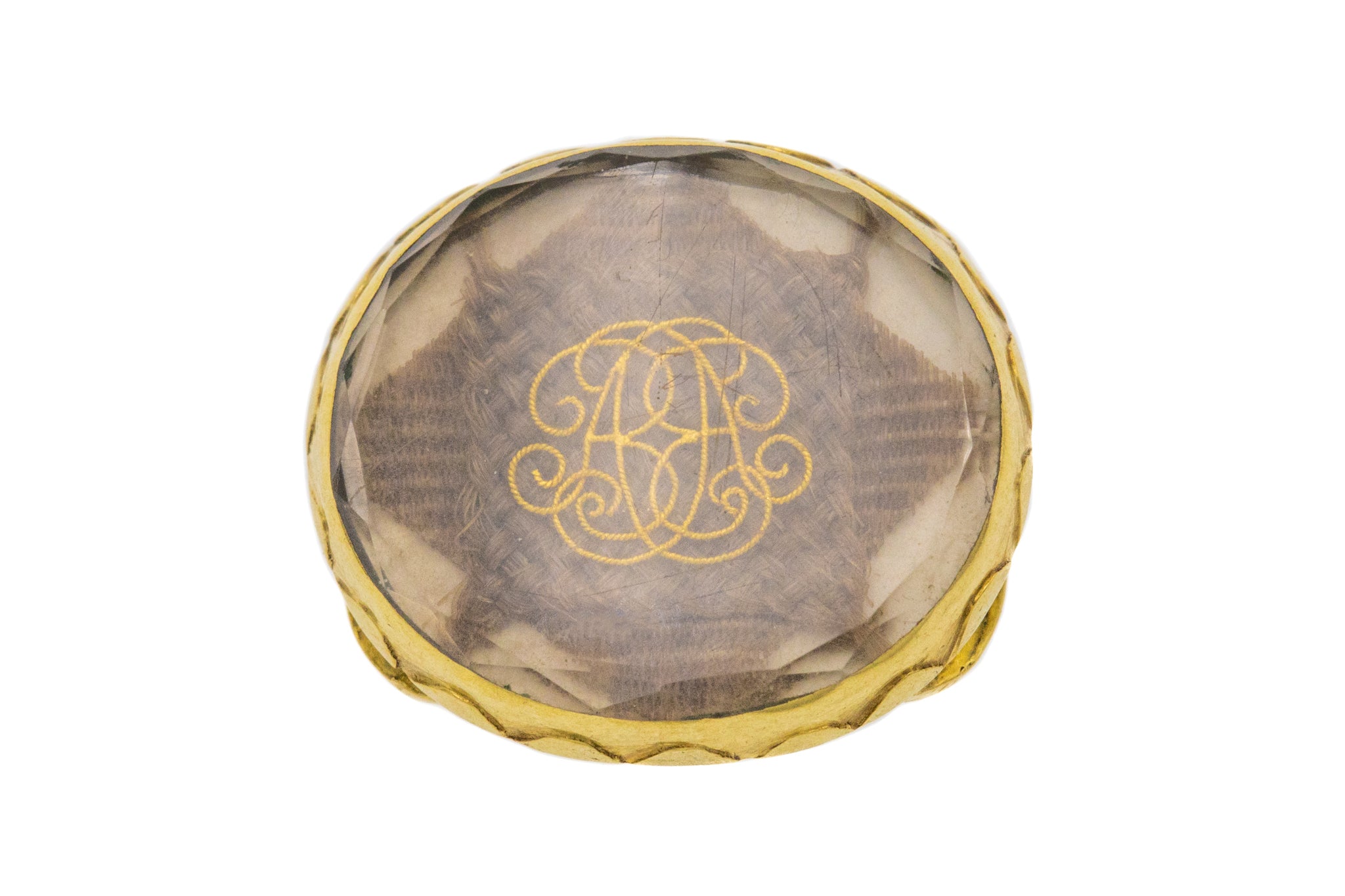 This piece of  Georgian jewellery has been crafted from 18ct Gold, 'A A' lettering and Stuart Crystal; Stuart Crystals are unequivocally Georgian, used at the time to commemorate King Charles I after his execution.