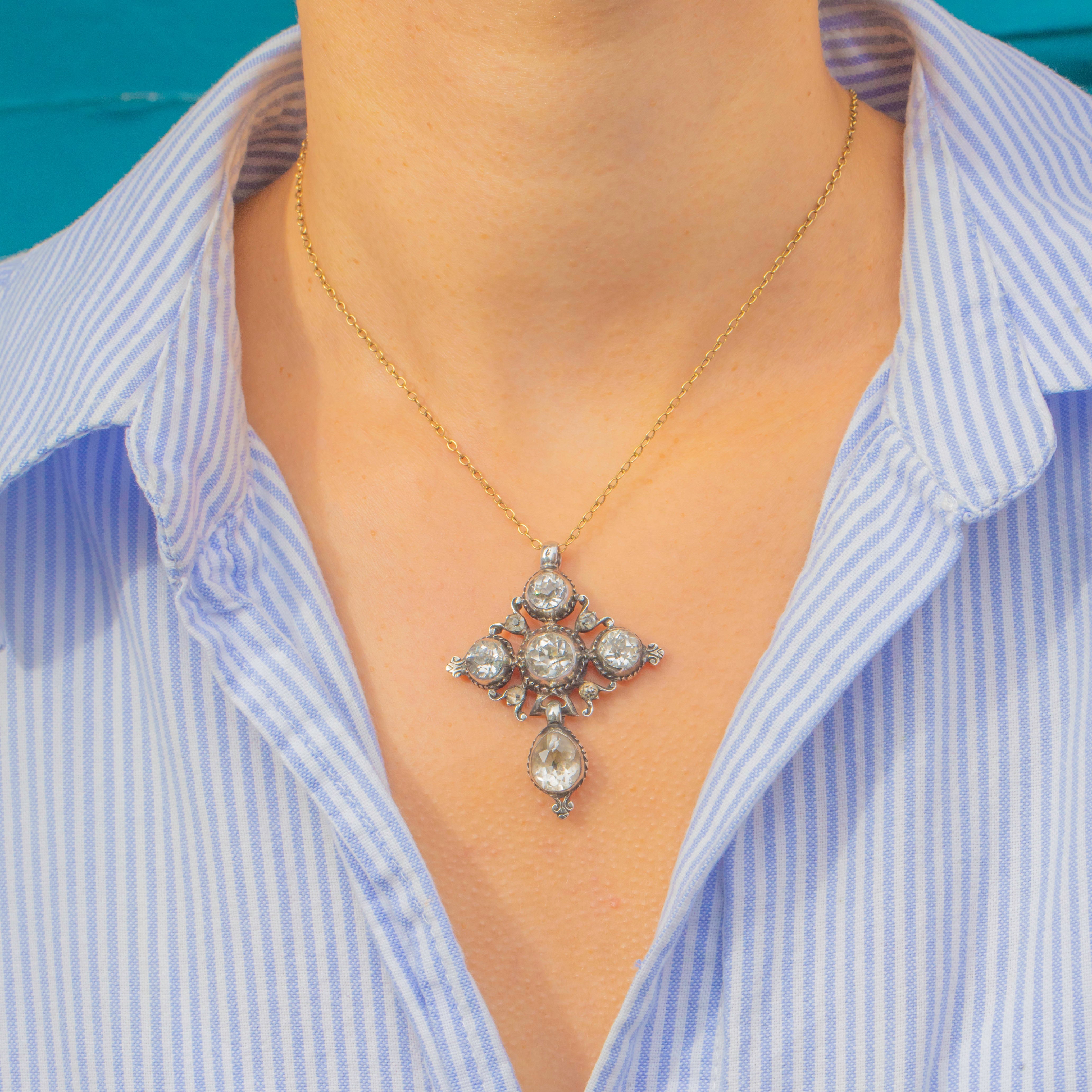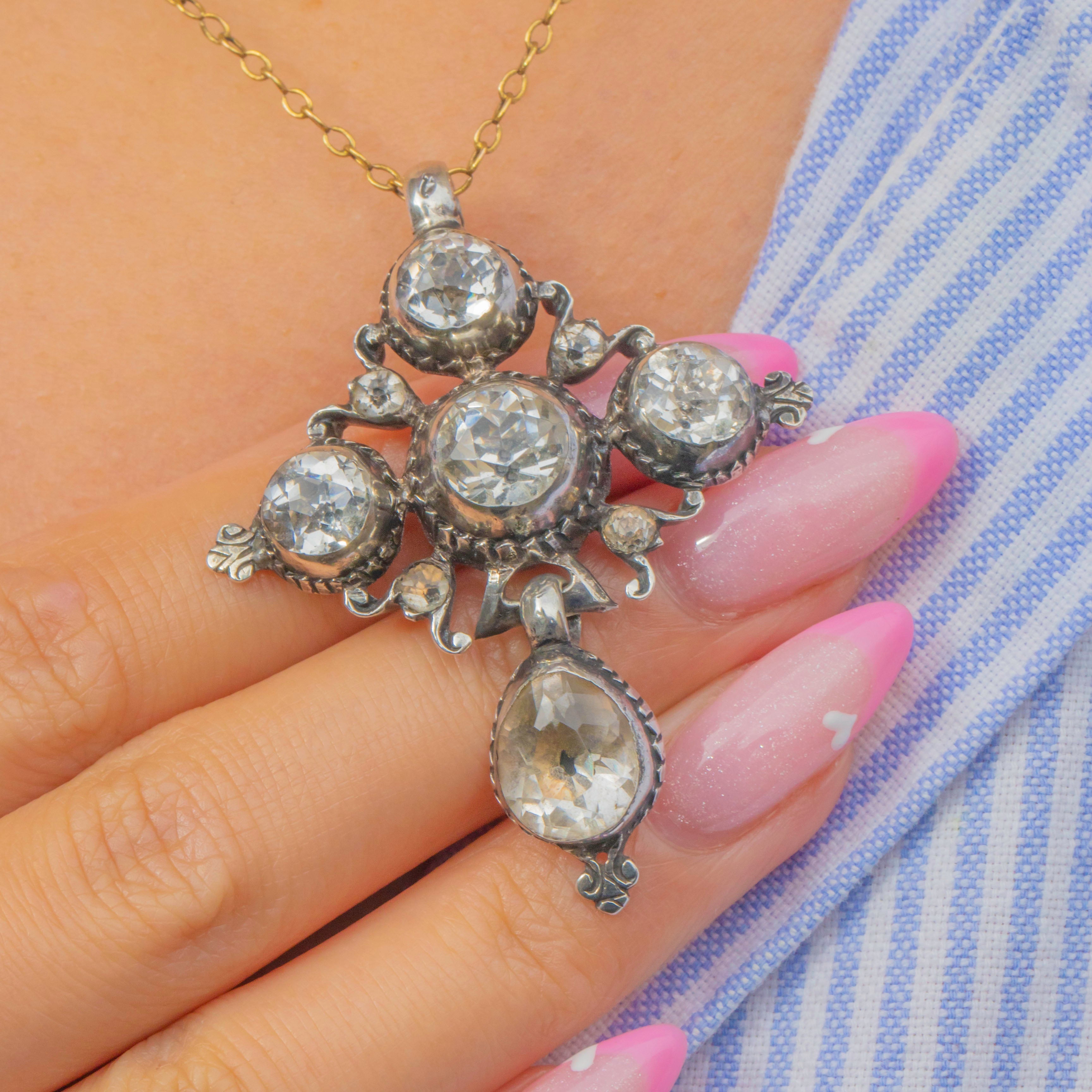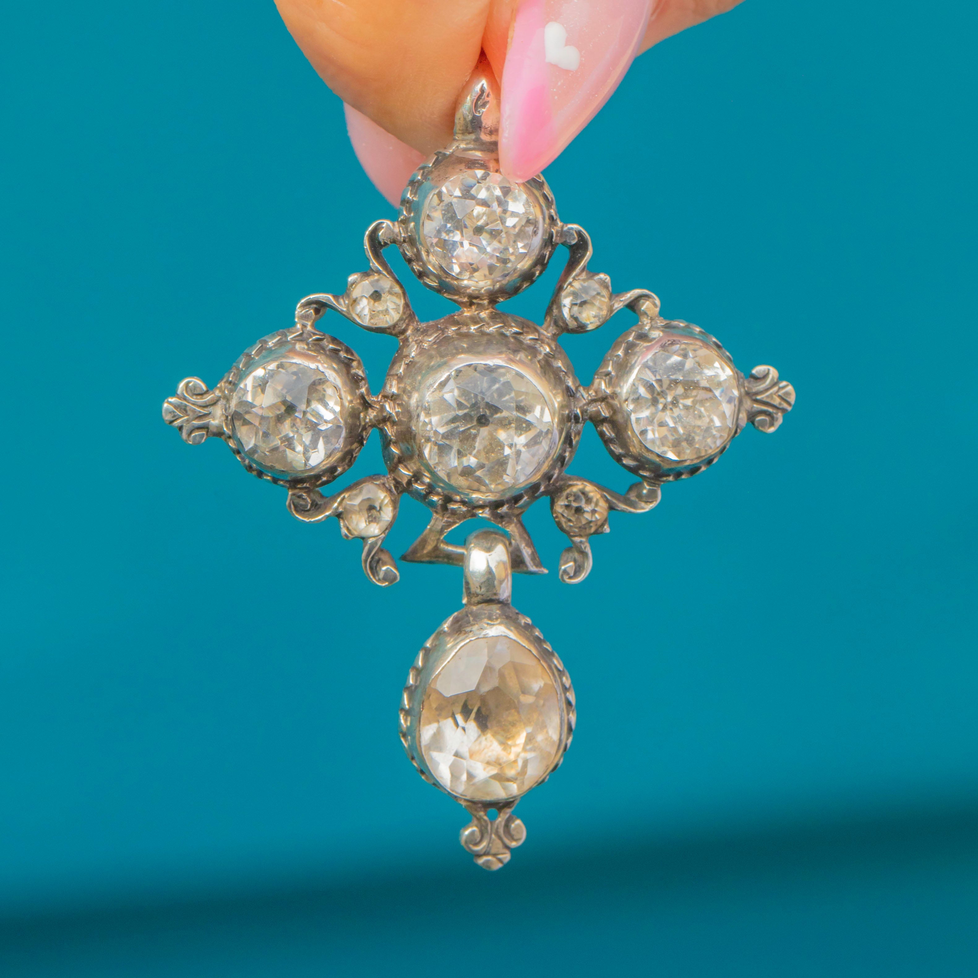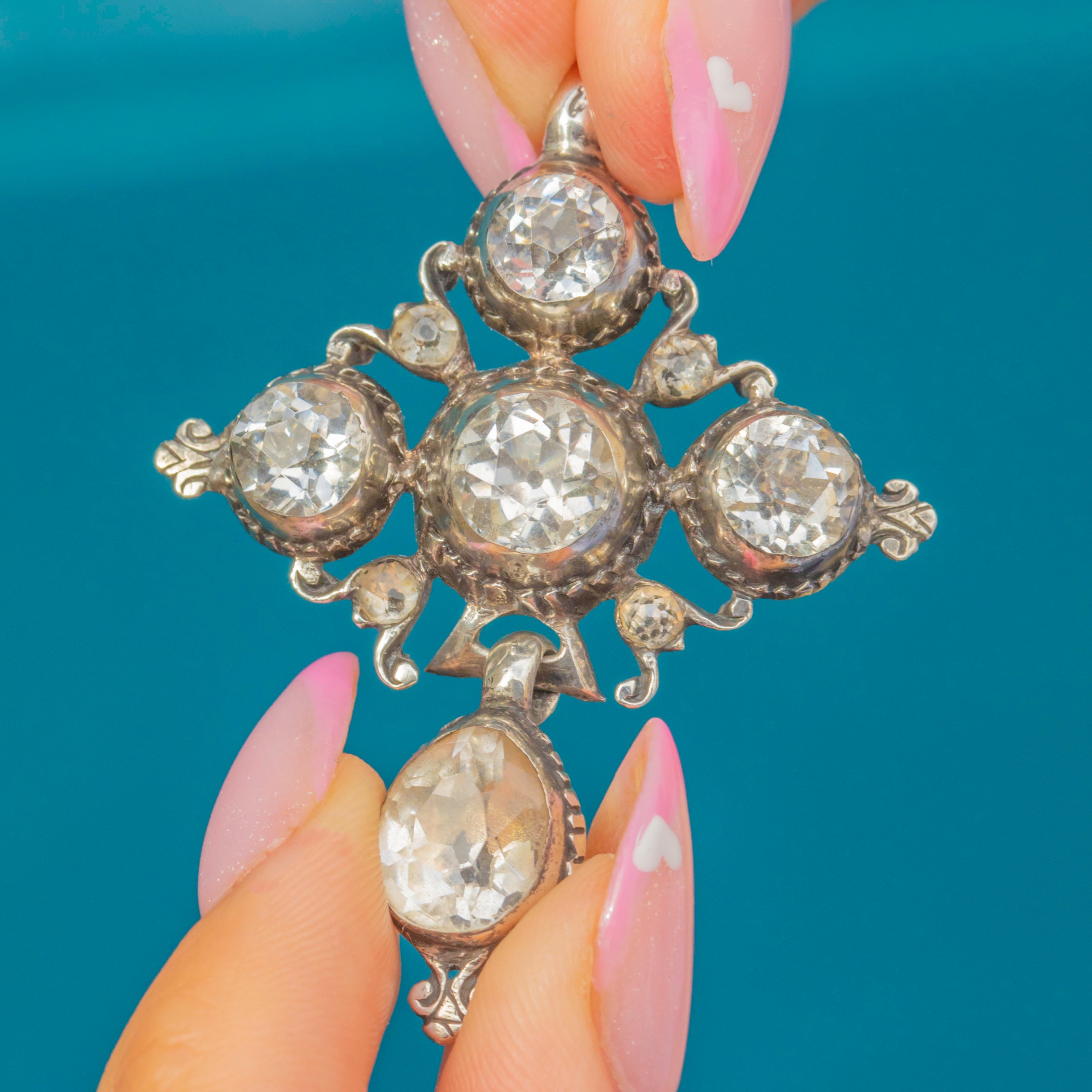 An exceptional example of early 19th-century craftsmanship, this Georgian ‘Croix de Saint Lo’ pendant is set throughout with sparkling hand-cut Paste stones in Sterling Silver. These crosses originated in Normandy, France, and were cherished devotional jewels symbolising faith and protection.