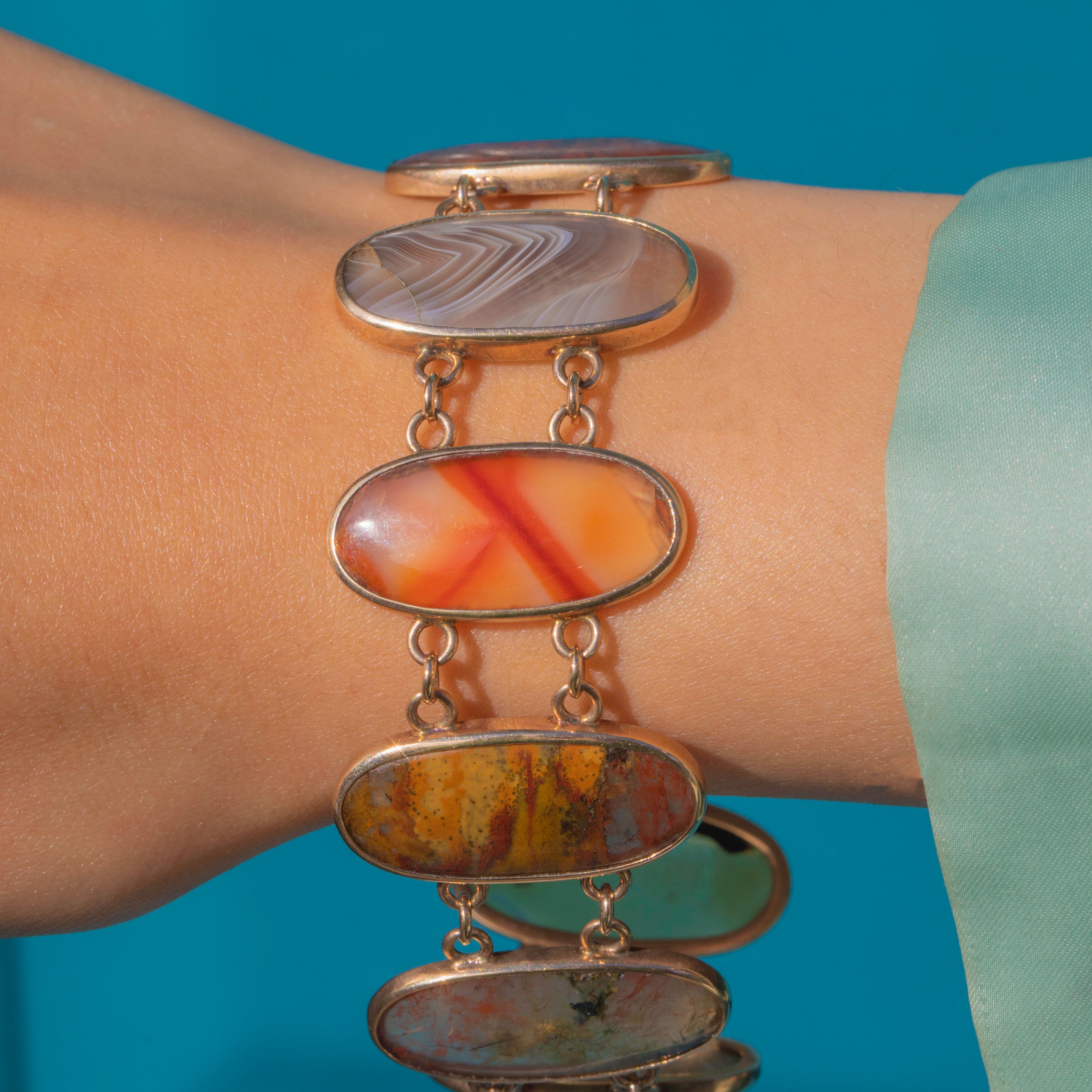 EXCELLENT: Agate cabochons are bright and glossy with no chips or cracks visible. Bezels, links and clasp are secure with minimal surface wear commensurate with age. Tongue clasp clicks shut neatly and holds well.
