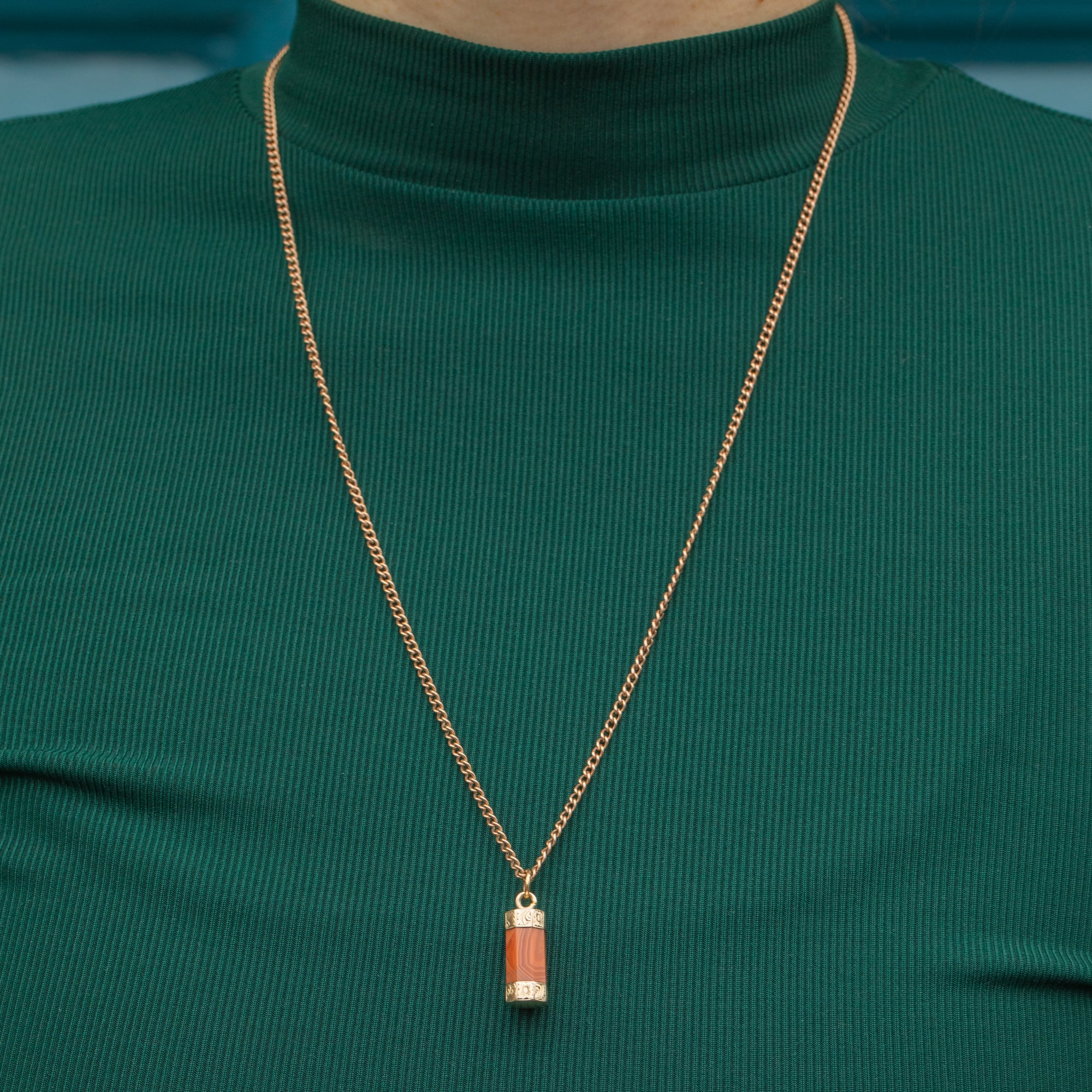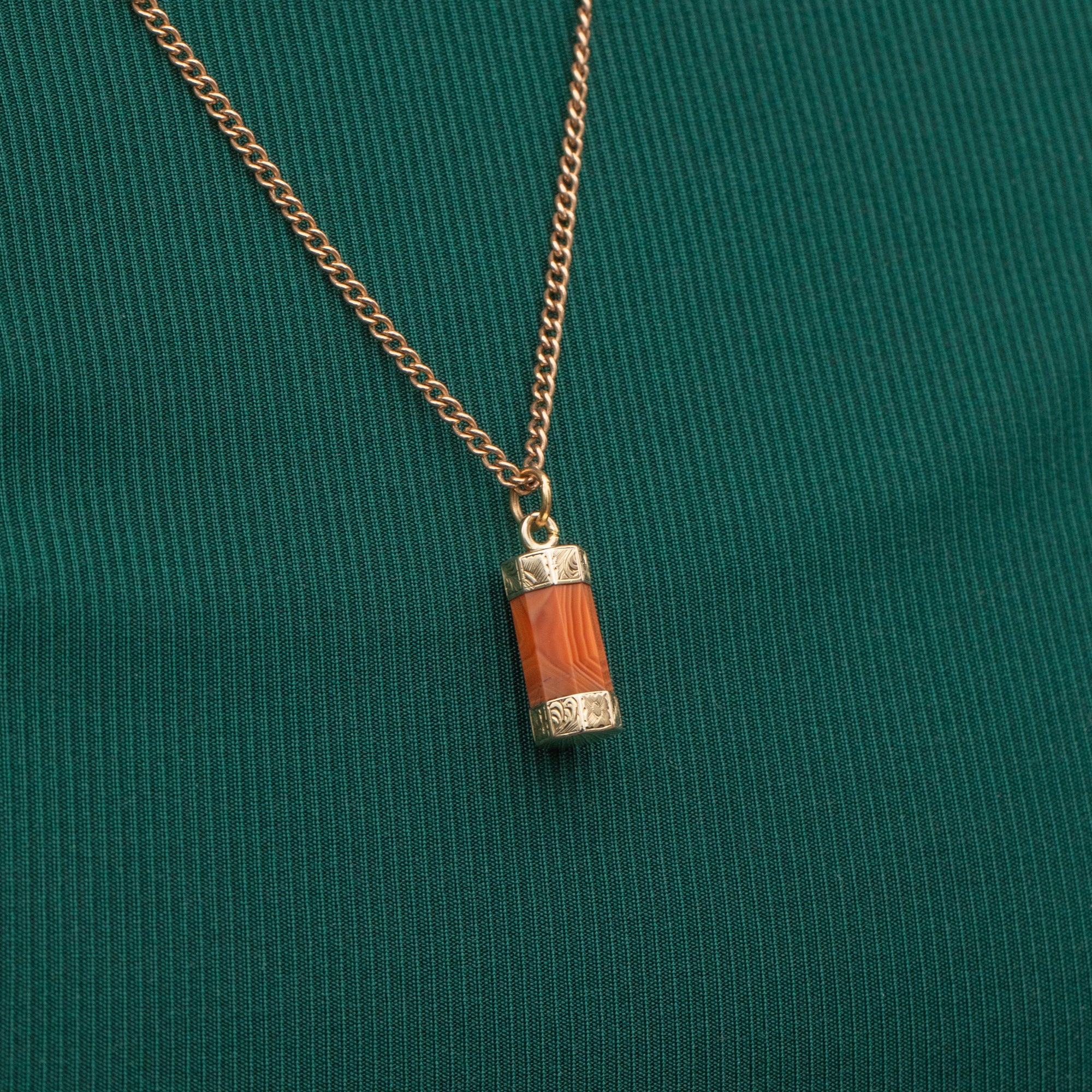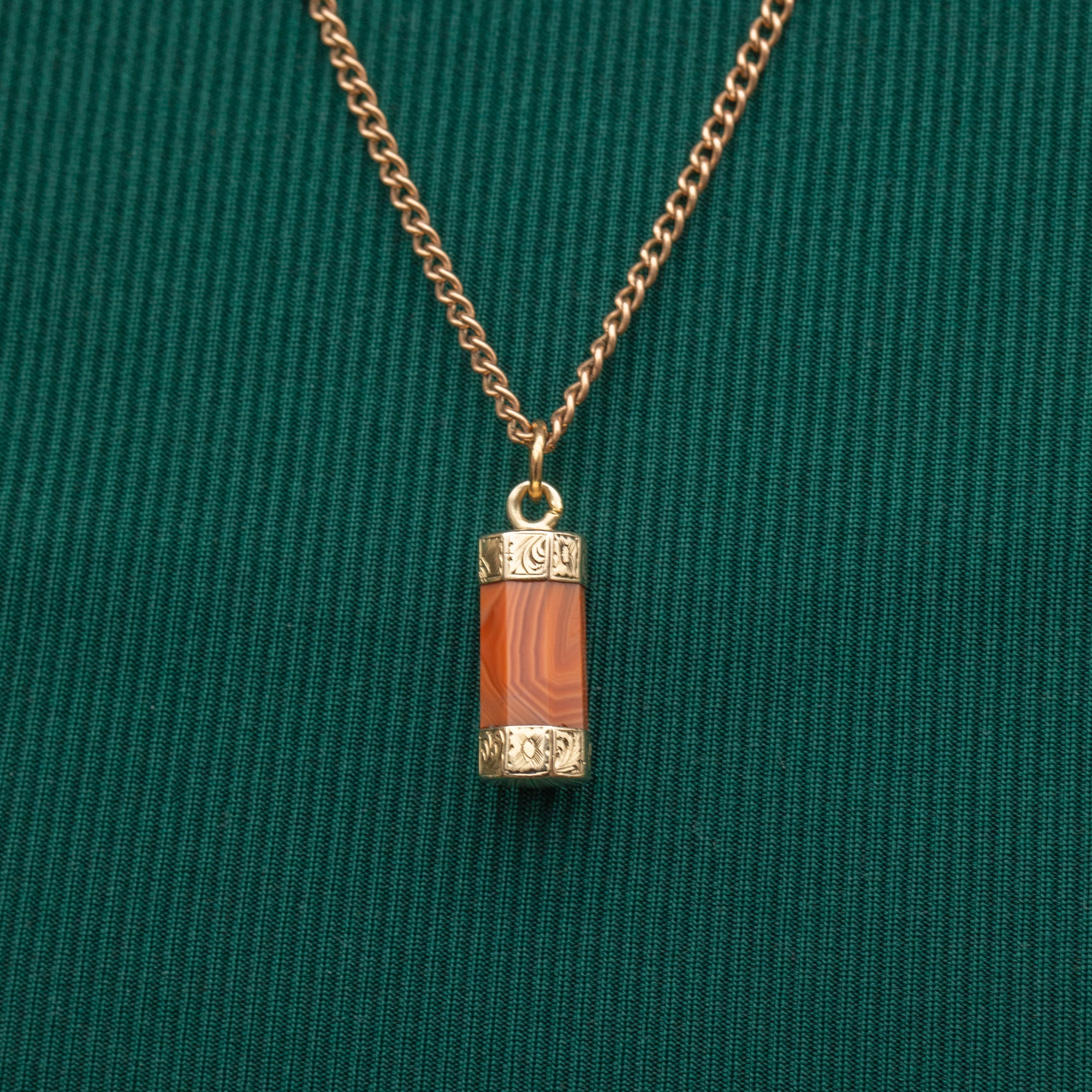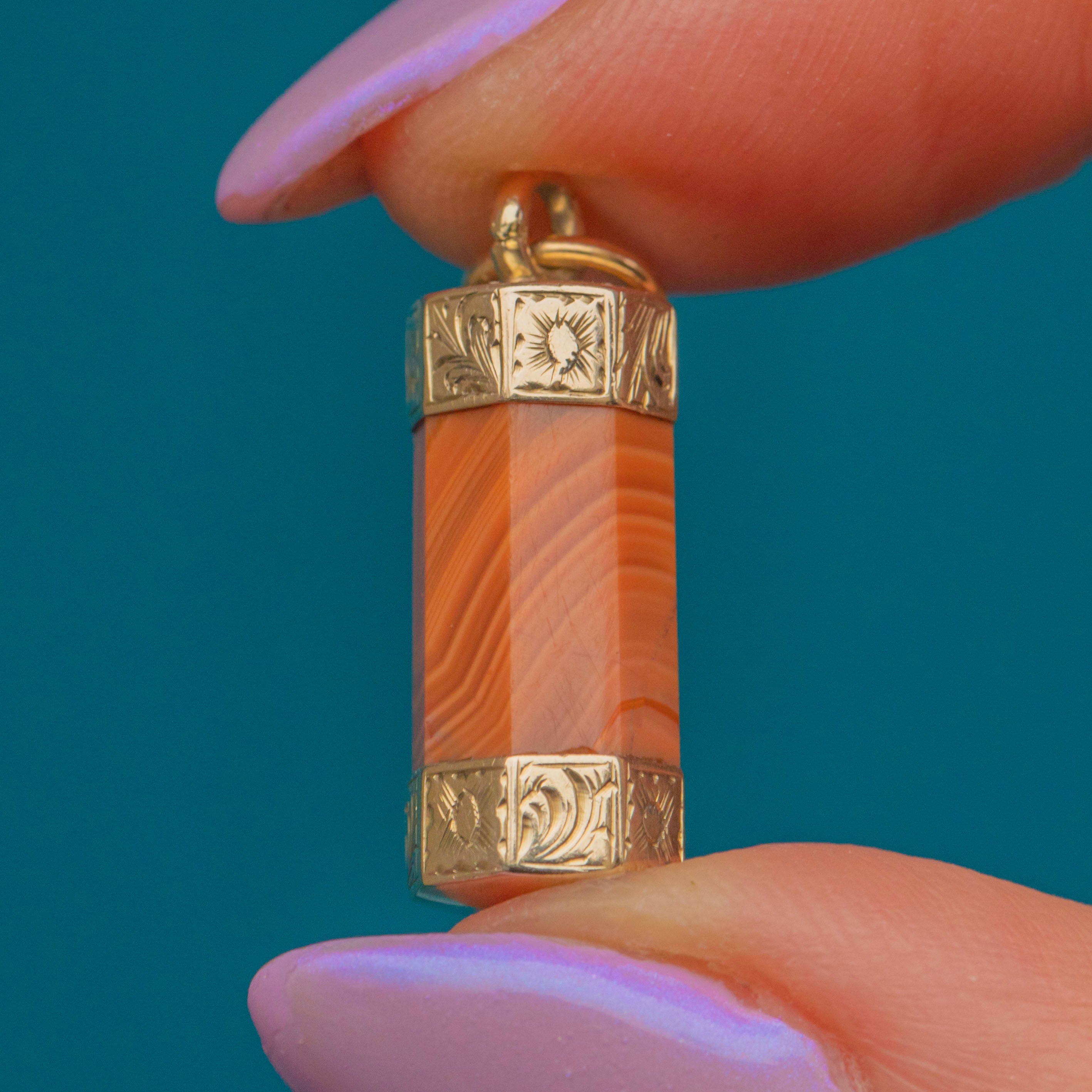 EXCELLENT: This Georgian 9ct Gold Agate column charm is in great condition. Her Agate is beautiful, wonderfully faceted and rich in colour. Her Gold is buttery and, with a soldered jump ring, you can wear her with confidence.