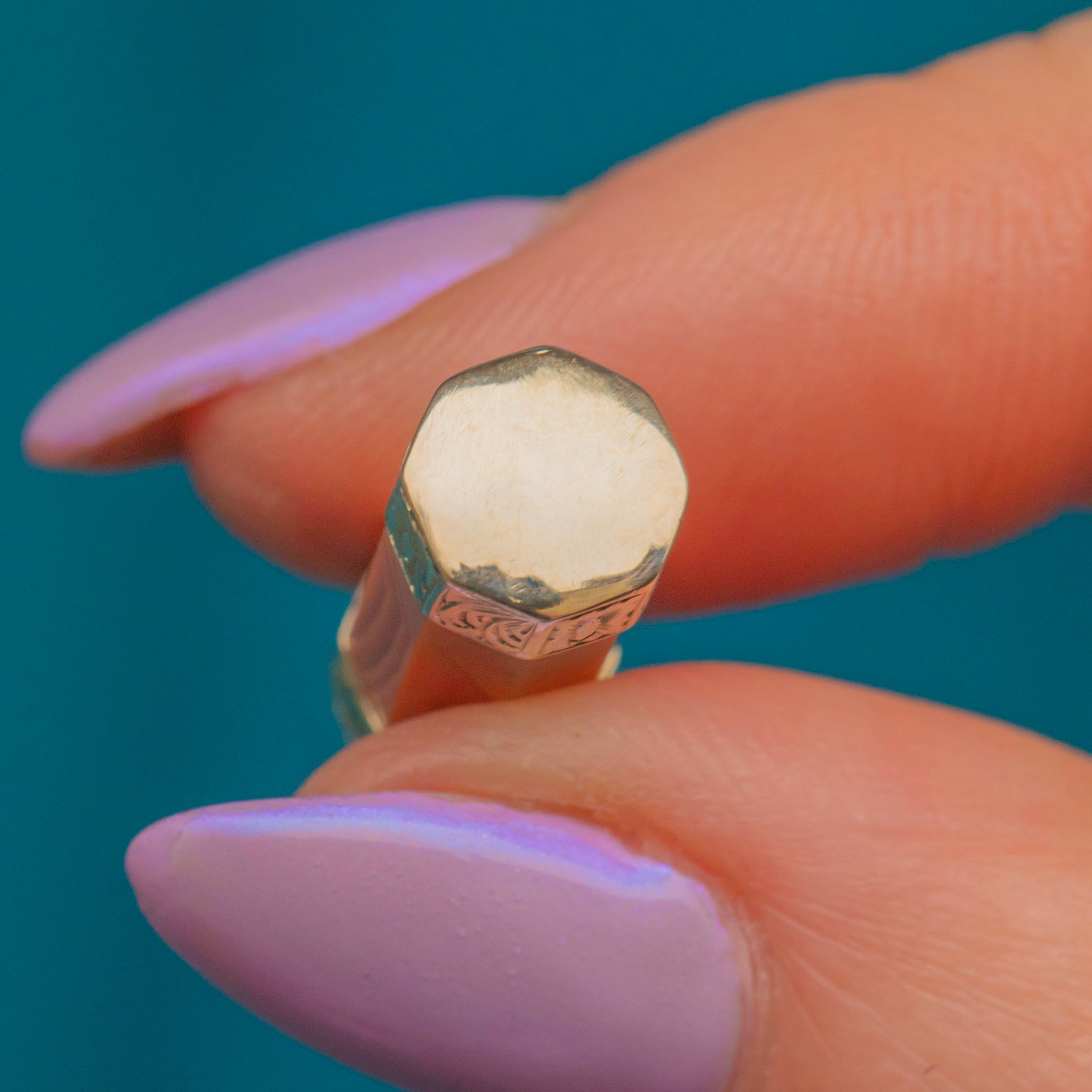 The Agate is held within two 9ct Gold bezels, each embellished with ornate engravings adding a luxurious finishing touch. Petite in size, she is perfect for everyday wear!
