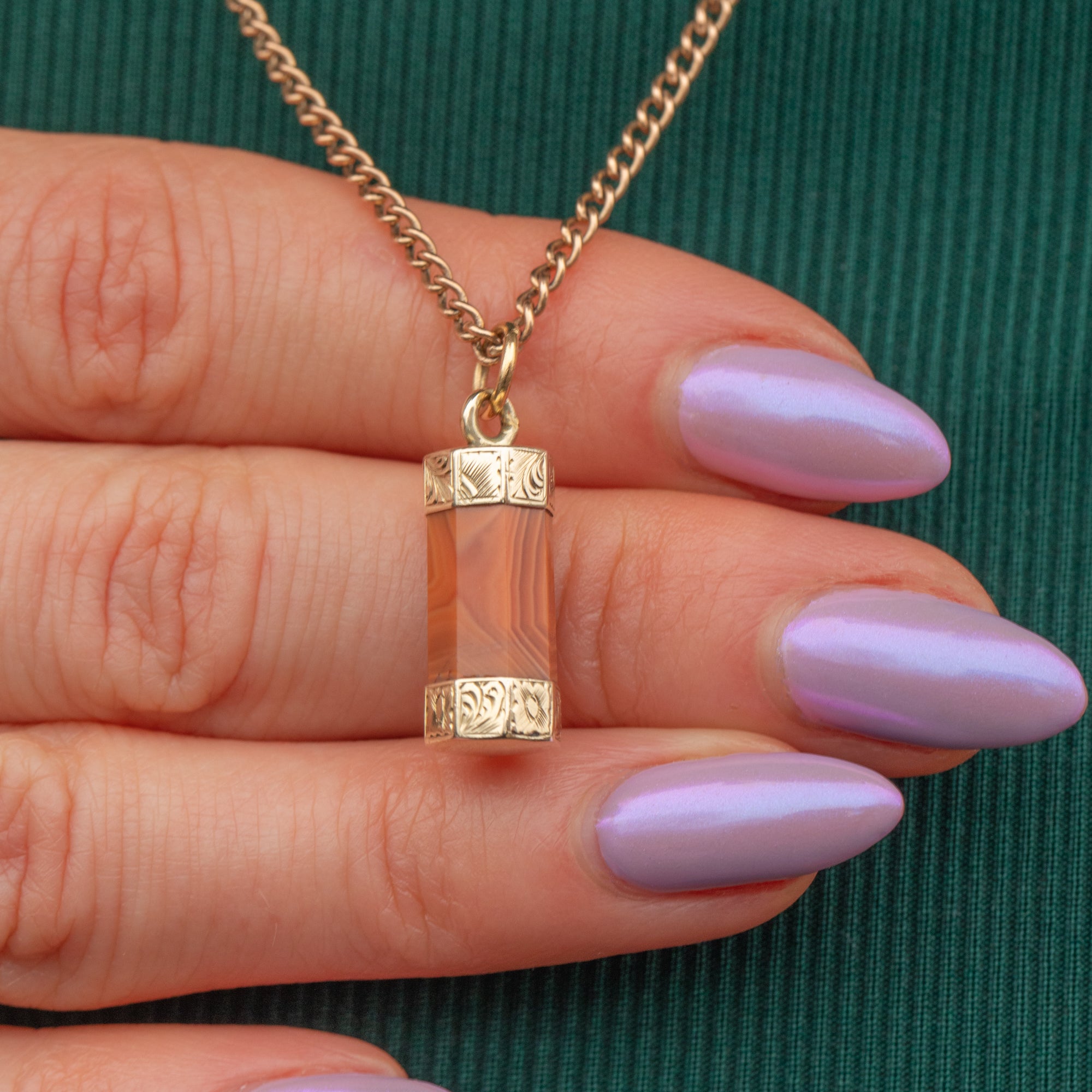 This beautifully crafted Georgian 9ct Gold Agate column charm will bring a sense of mystique to your collection! The Agate displays light striations of earthy, burnt umber hues that ripple through her striking faceted form.
