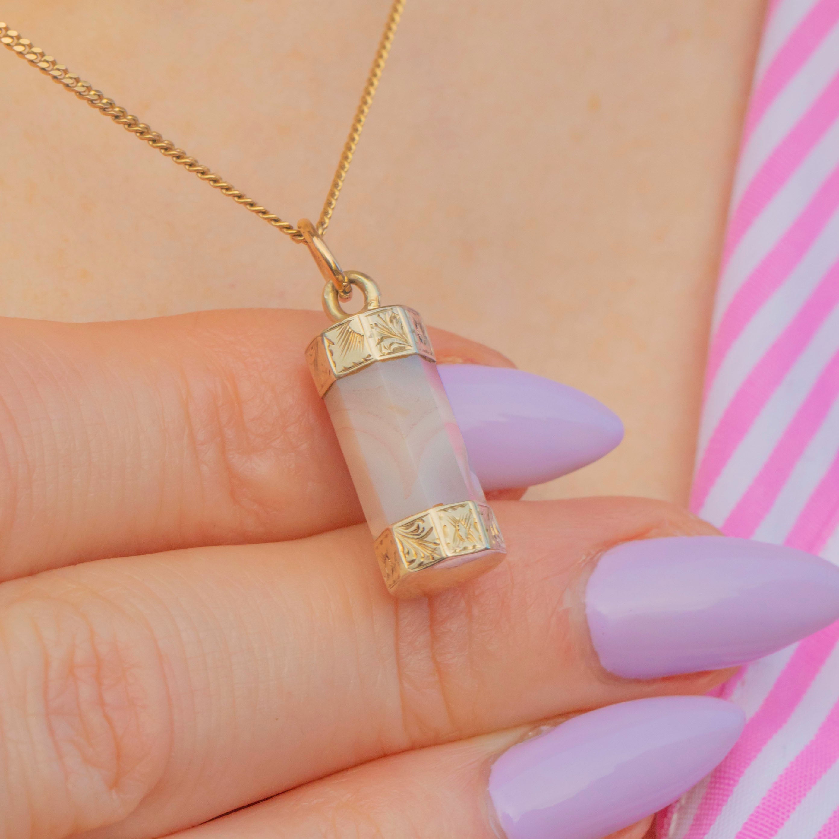 This exquisitely crafted Georgian 9ct Gold Agate column pendant will bring a sense of mystique to your collection! The striking faceted Agate displays light striations of earthy hues that almost appear to be suspended within the stone, giving it an enchanting allure.
