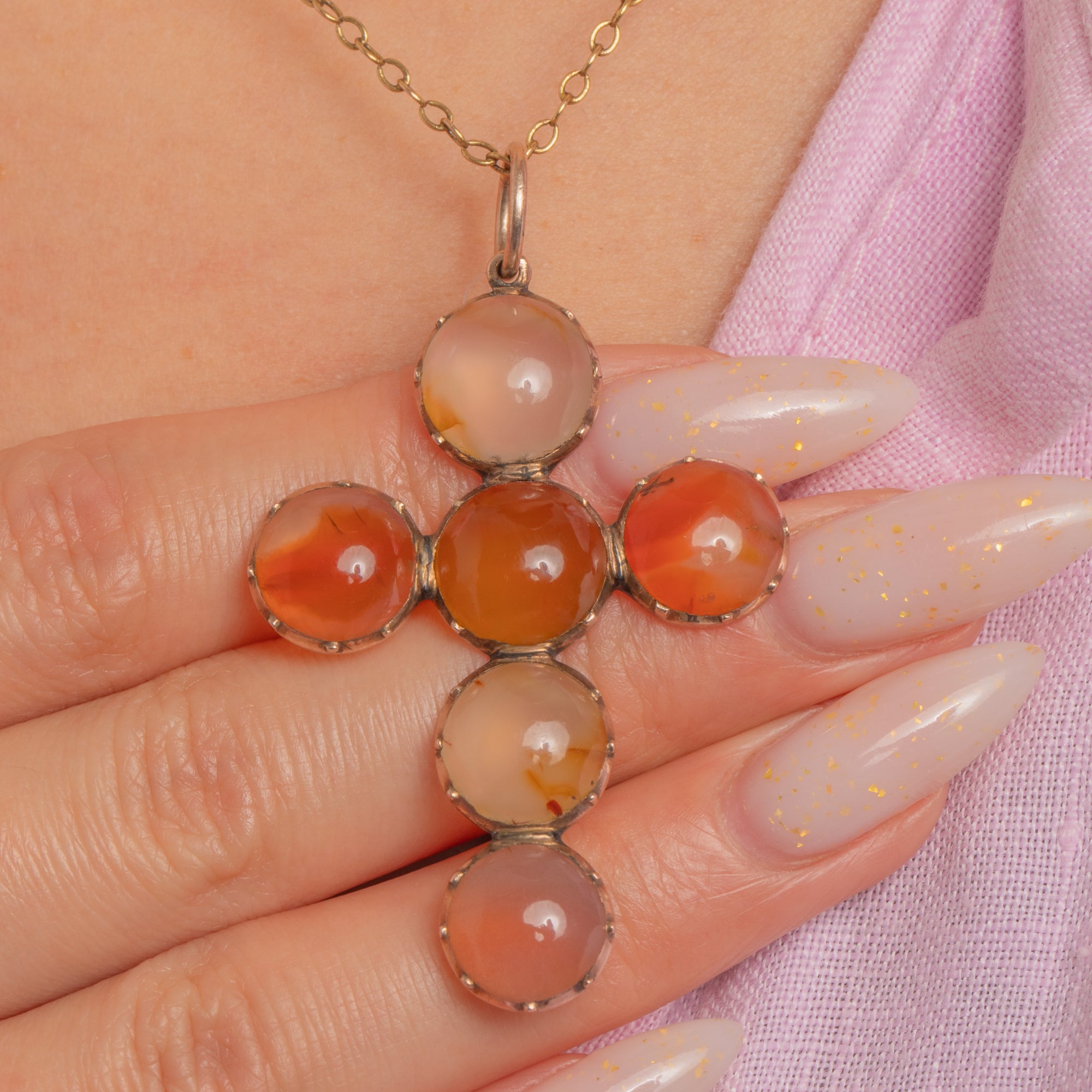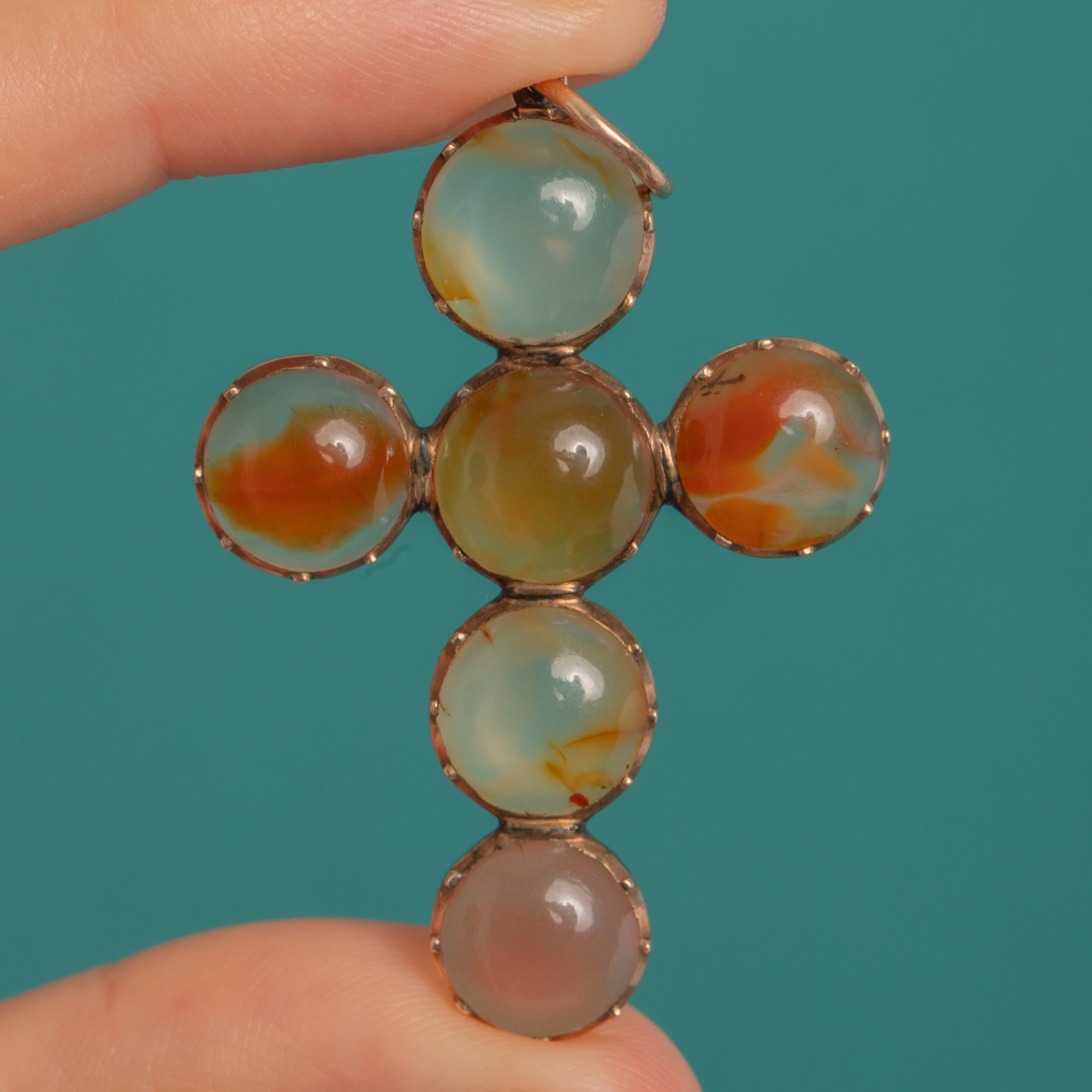 A soulful Georgian cross pendant composed of six round Agate cabochons, each high-domed and cradled in characterful cut-down “pie-crust” collet settings. The collets are hand-soldered edge-to-edge to form a classic Latin cross, crowned with a simple jump ring for easy wear.