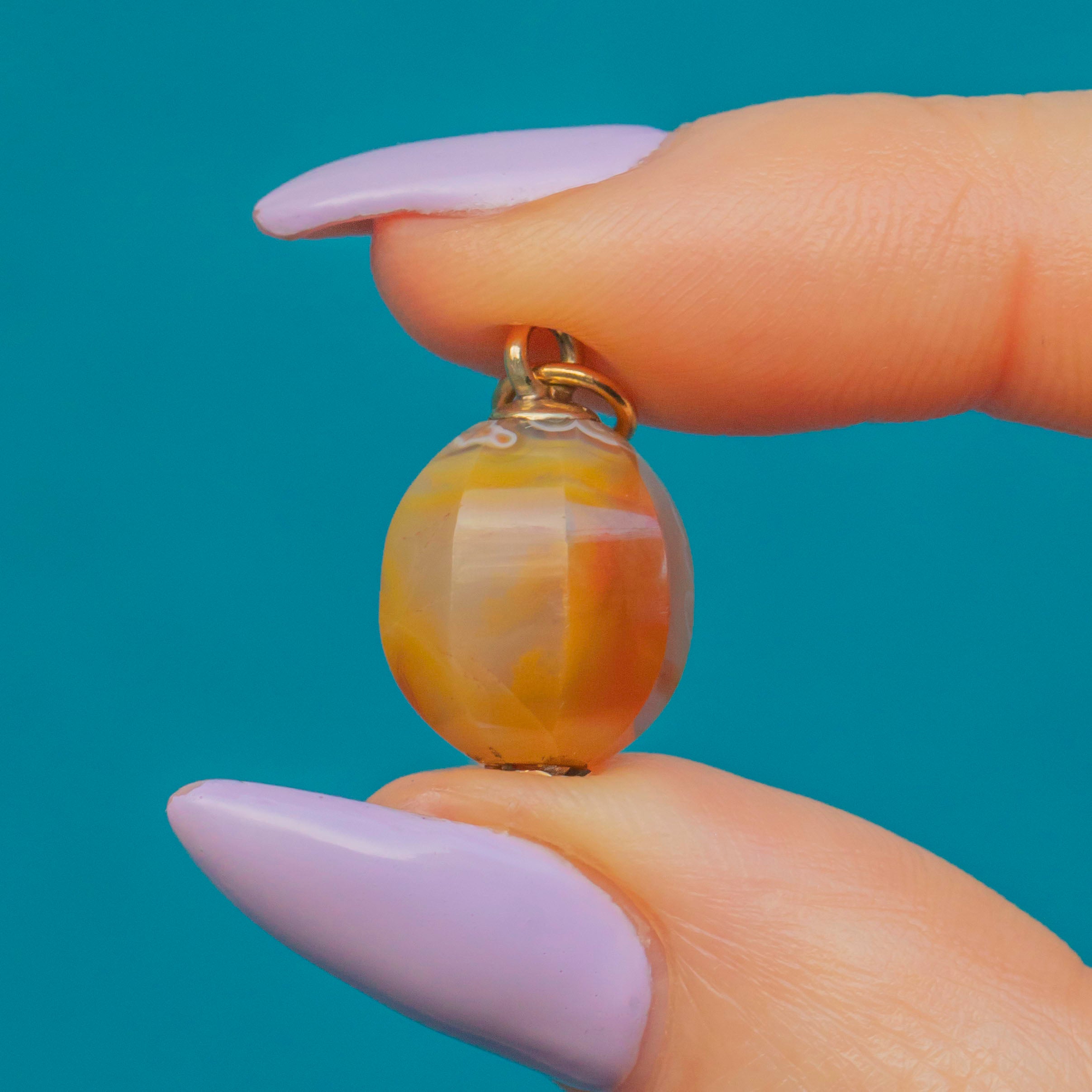 EXCELLENT. This Georgian 9ct Gold Agate faceted orb pendant is in excellent condition. The Agate is perfectly smooth with crisp facets and is securely held within its 9ct Gold settings. With a generously sized jump ring, you can style this striking piece of Georgian jewellery however you please!