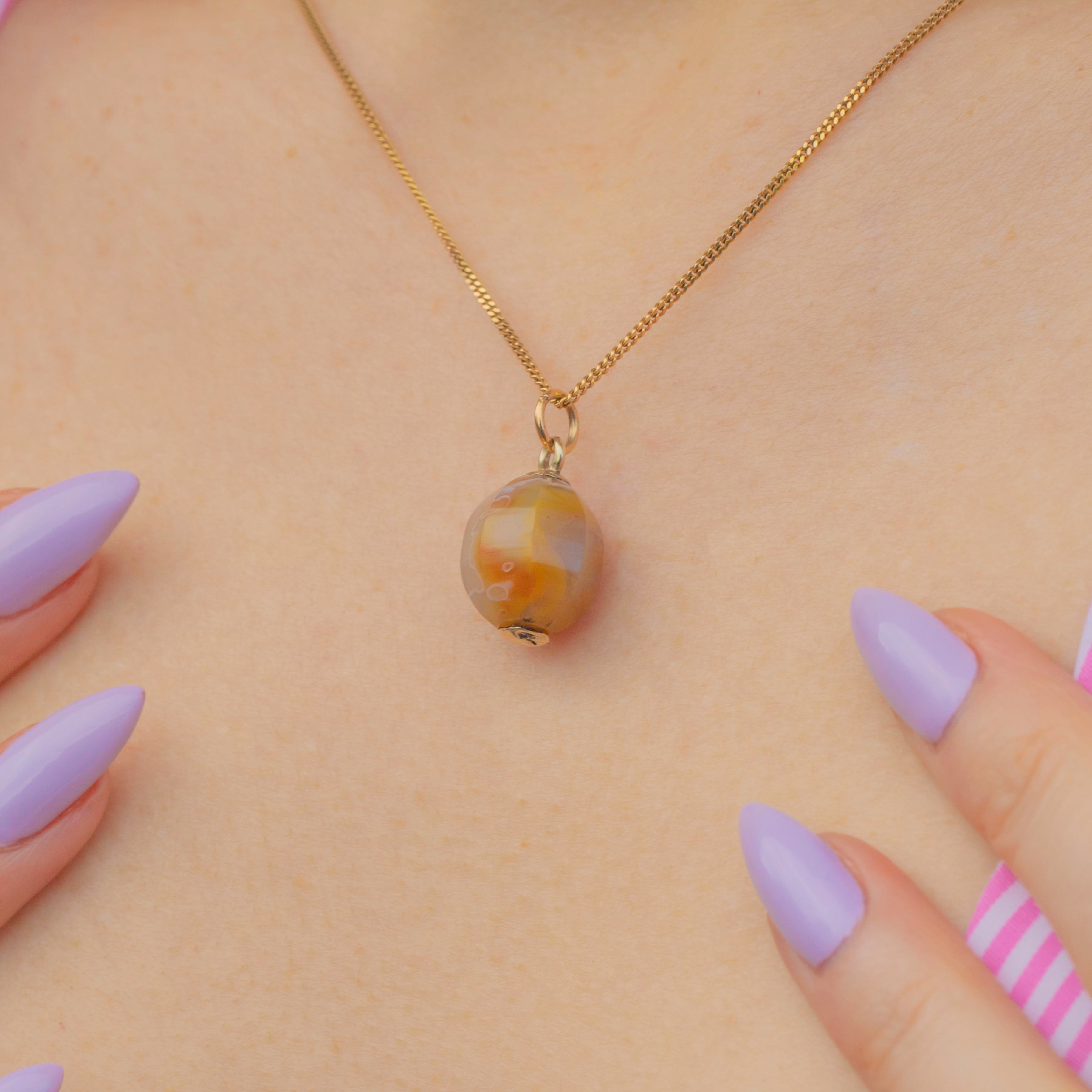 This satisfying Georgian 9ct Gold Agate faceted orb pendant will bring gorgeous earthy tones to your collection! The Agate displays striations of neutral hues that swirl delicately across the lightly curved faceted form, perfectly complemented by buttery 9ct Gold creating an elegant colour palette.