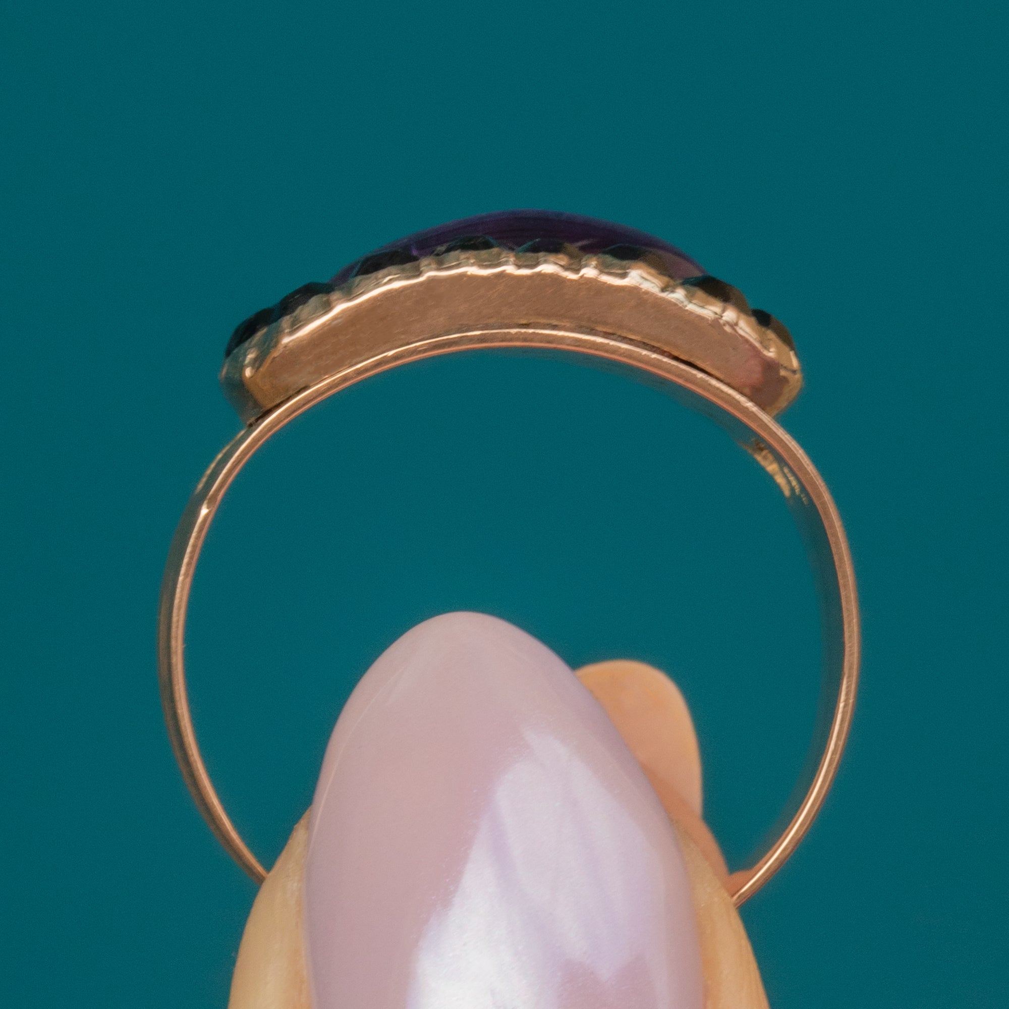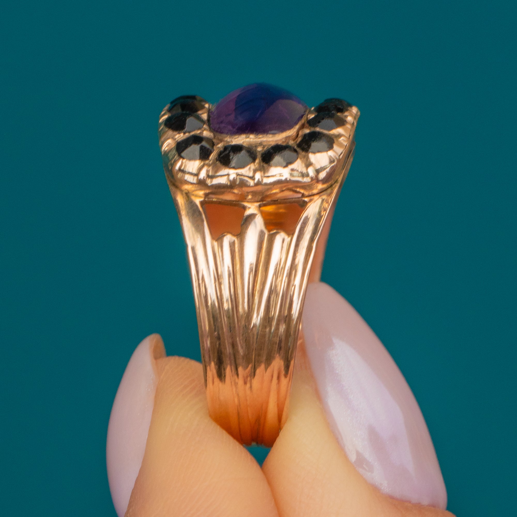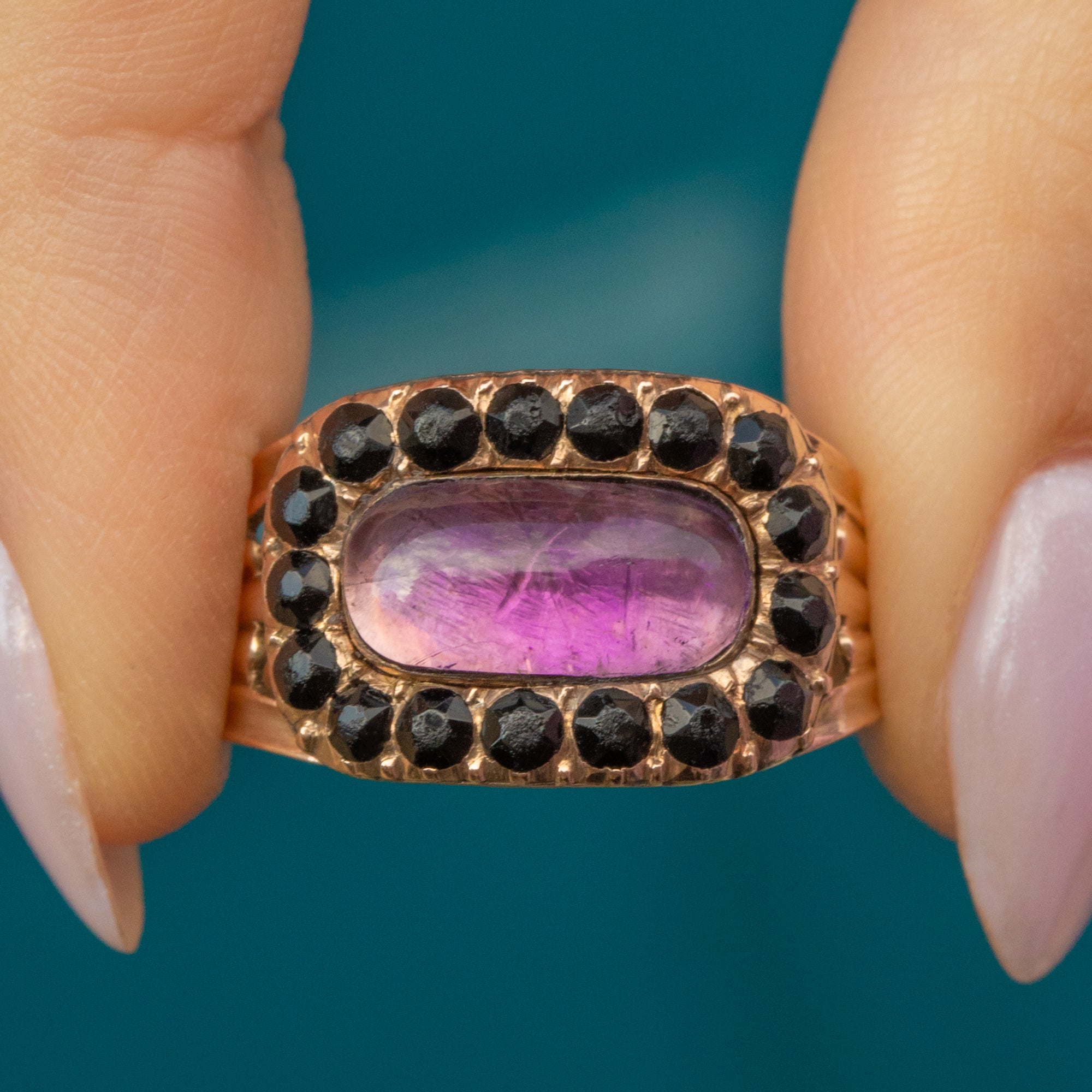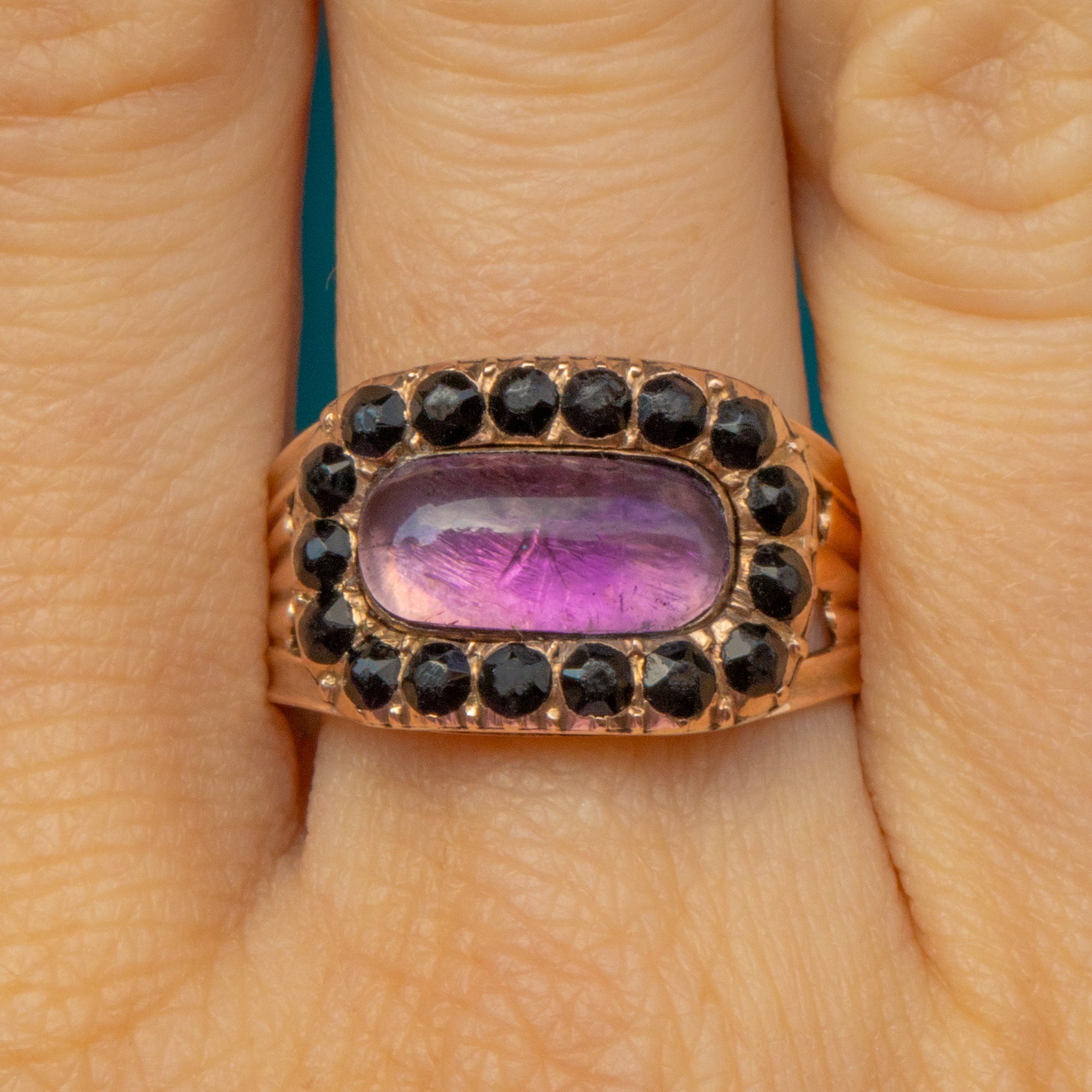 Twinkling black Jet gemstones surround the vibrant Amethyst cabochon, glowing proudly centrestage with enchanting purple shimmers. From a mere glance you can see the poignant importance this ring has always held, she's a special one!