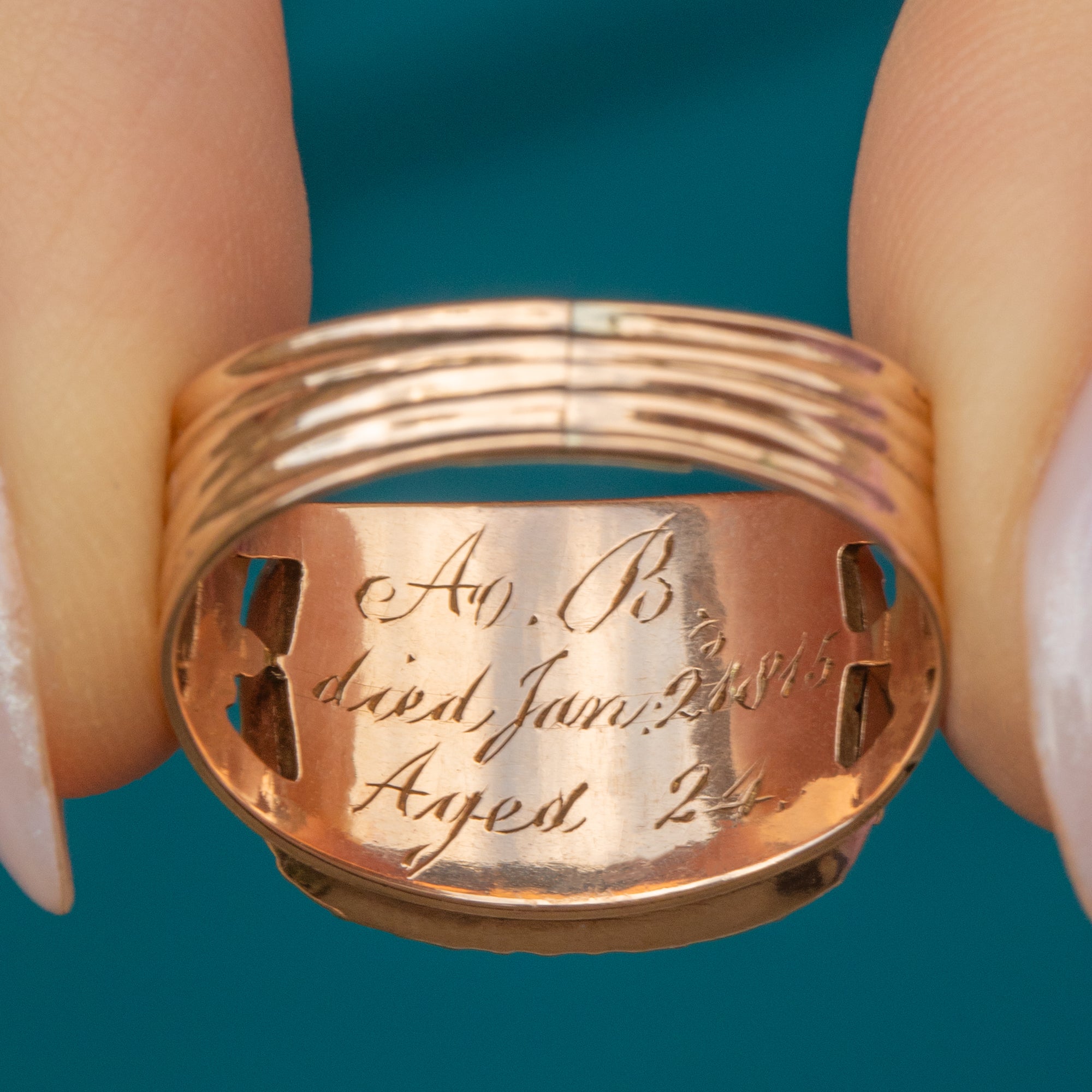 It's gorgeous warm rosy 9ct Gold setting sets the tone beautifully, with a hidden message inscribed on the inner band, "A.B , died Jan 21 1815, Aged 24". It is lovely to know that such an intimate object has been passed down and looked after through history for over 200 years!