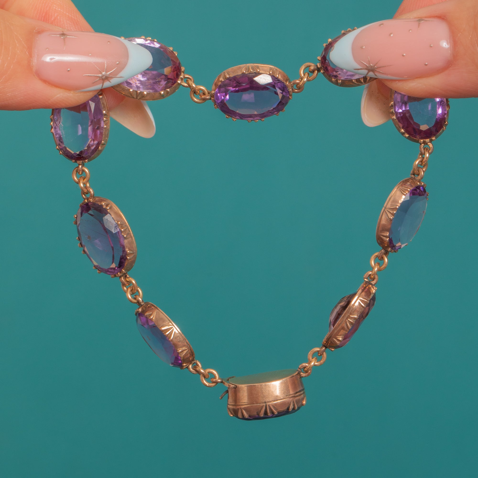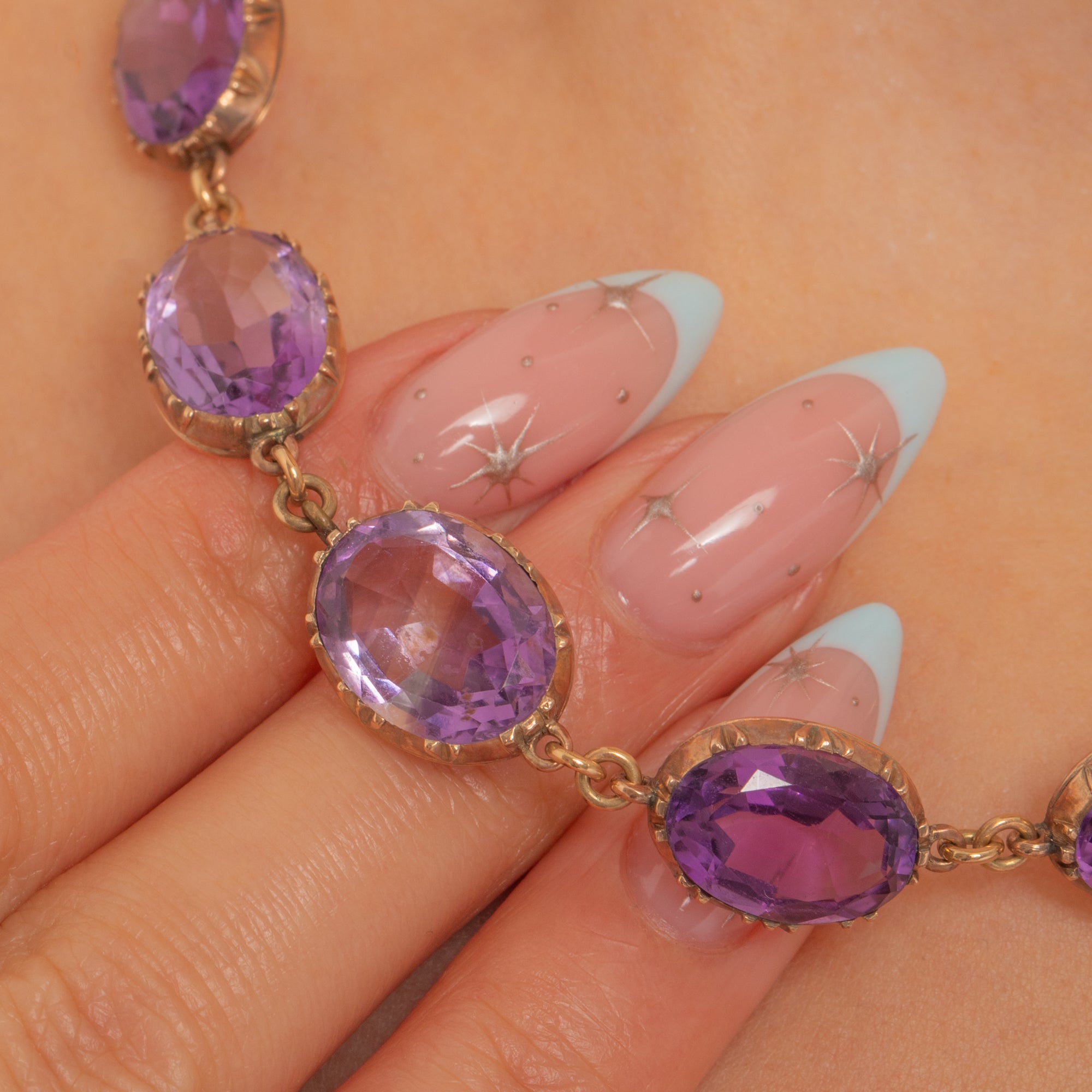 A luminous Georgian Amethyst rivière alive with rich, grape-coloured sparkle. Twenty oval Amethysts are set in crisp triple-claw, cut-down “pie-crust” collets of warm 9ct Gold, each articulated link flowing elegantly across the collarbone. The concealed clasp is cleverly integrated as a link, with the two clasp Amethysts traditionally closed-back and foiled for that soft inner glow beloved in early 19th-century jewels.