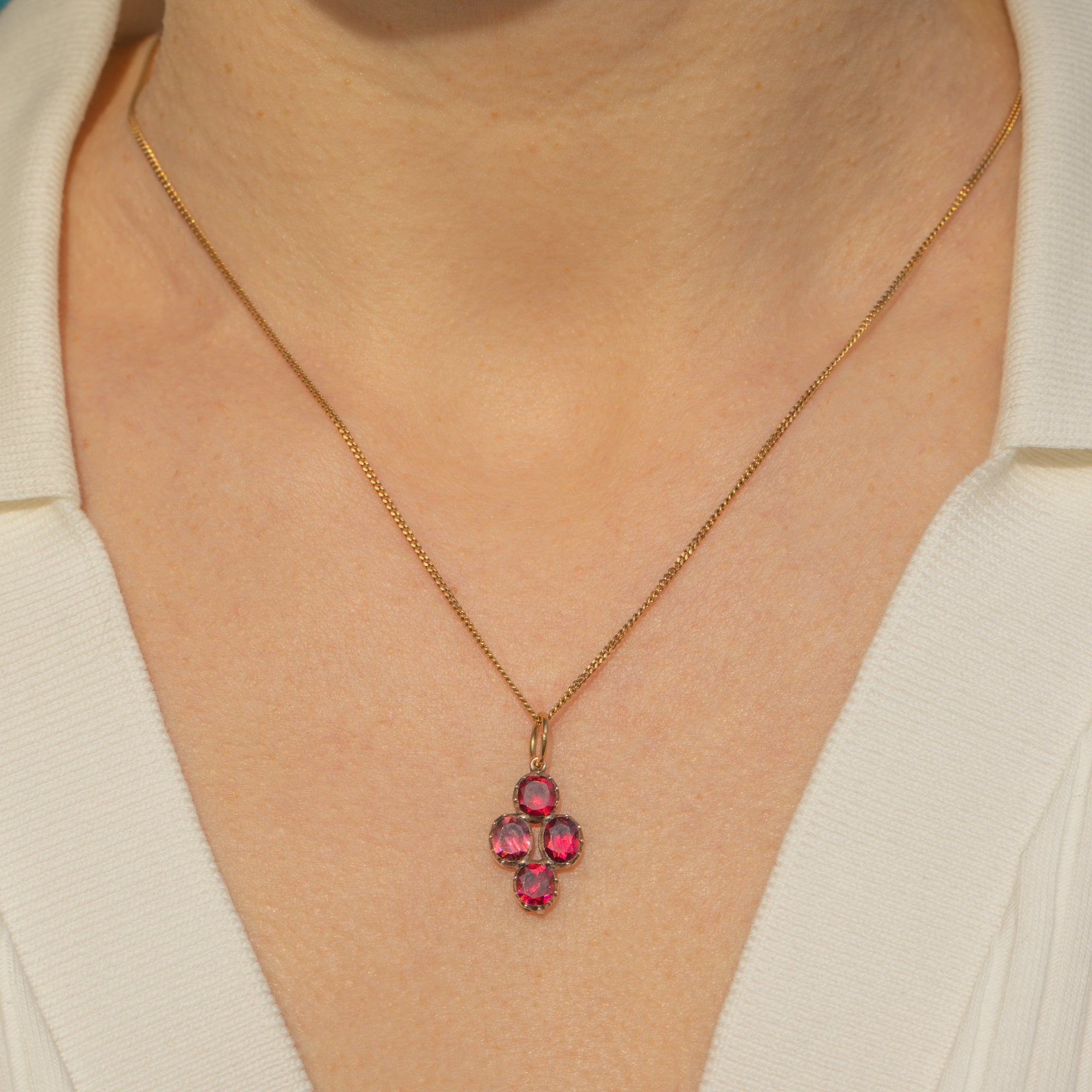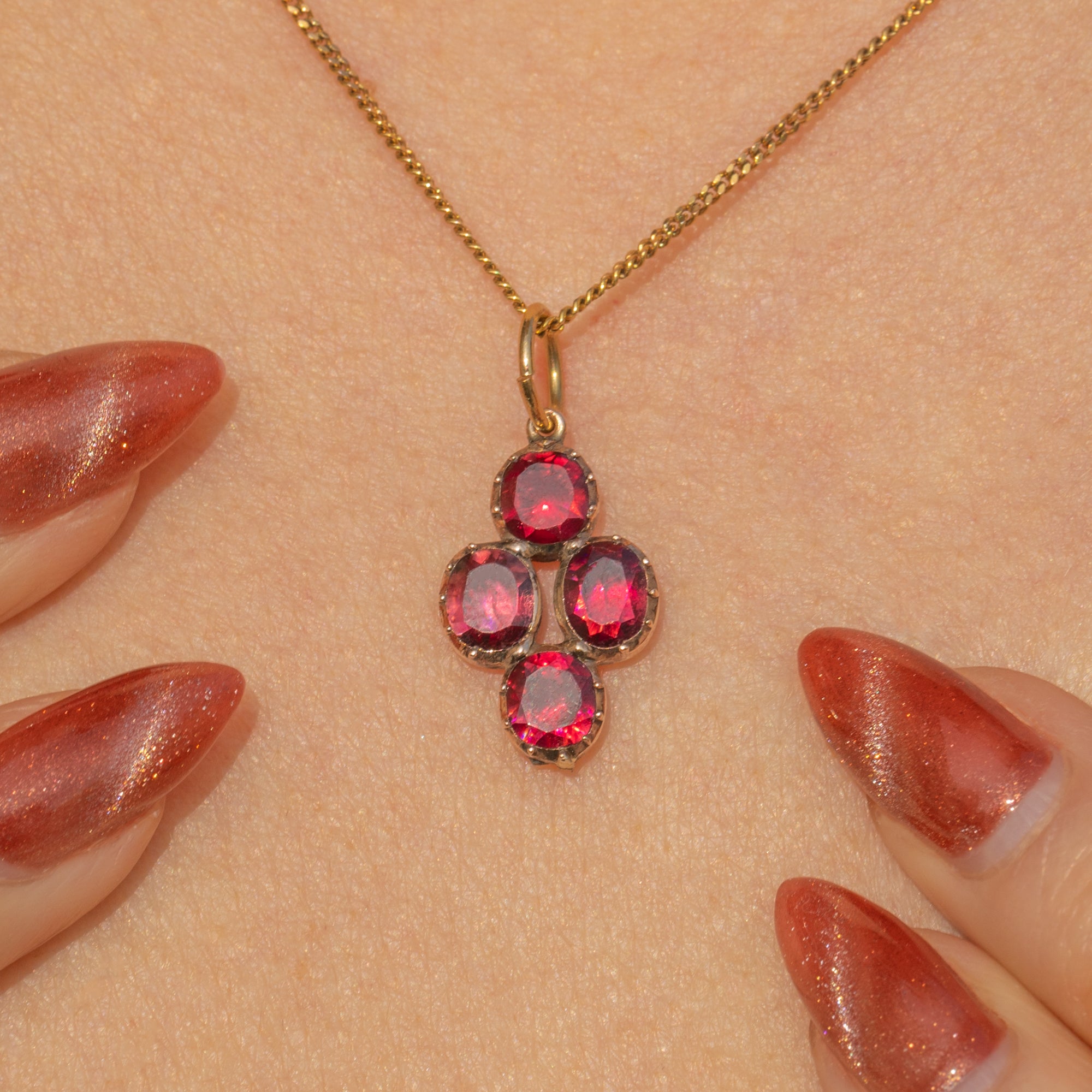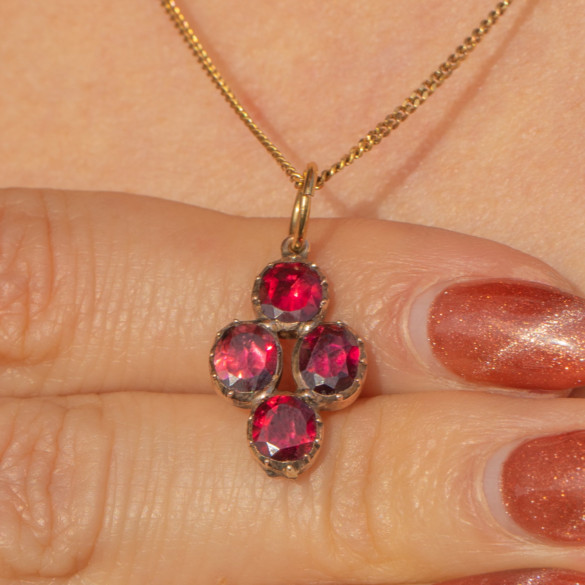 This Georgian 9ct Gold flat-cut Garnet cluster pendant is a sultry little treasure! The four Garnets are arranged into an elegant diamond-shaped cluster, emanating seductive burgundy hues with flashes of bright crimson as they move in the light.