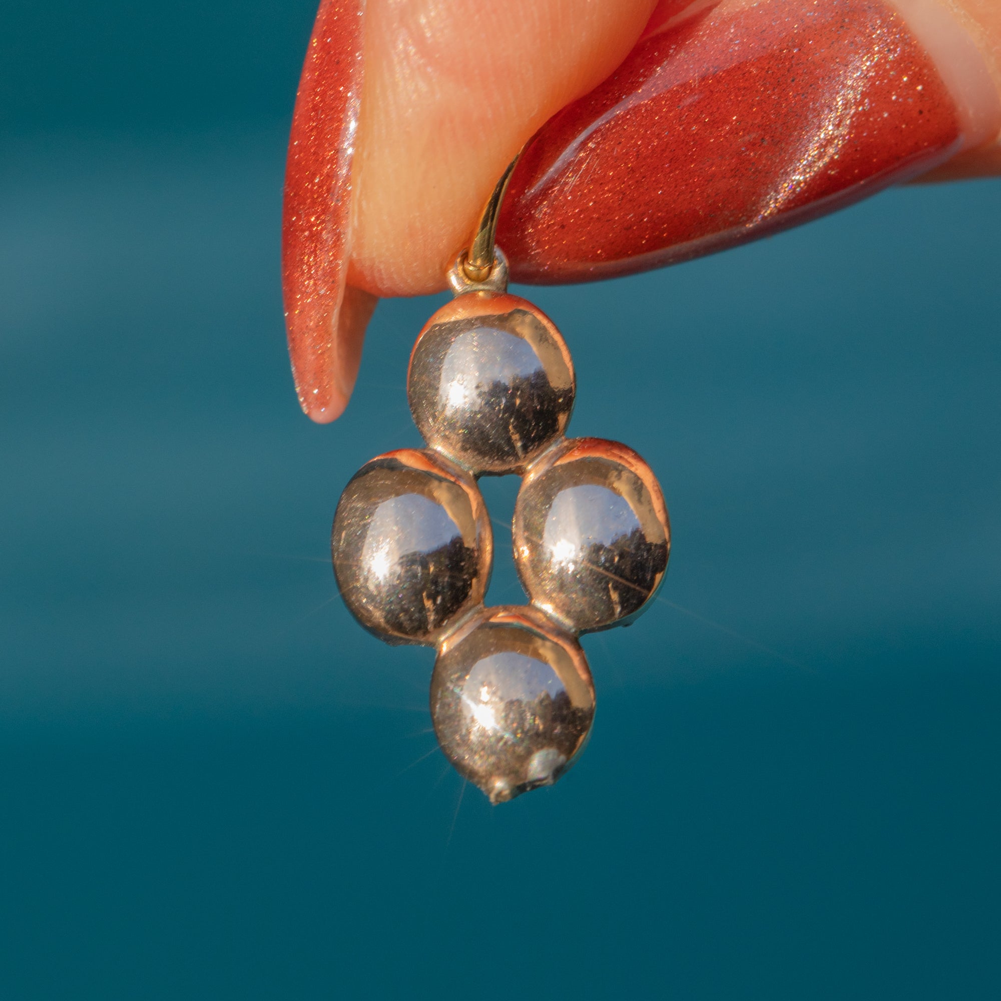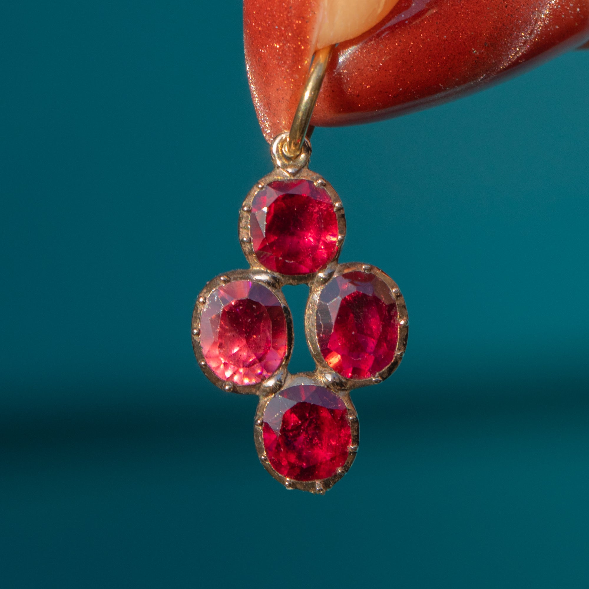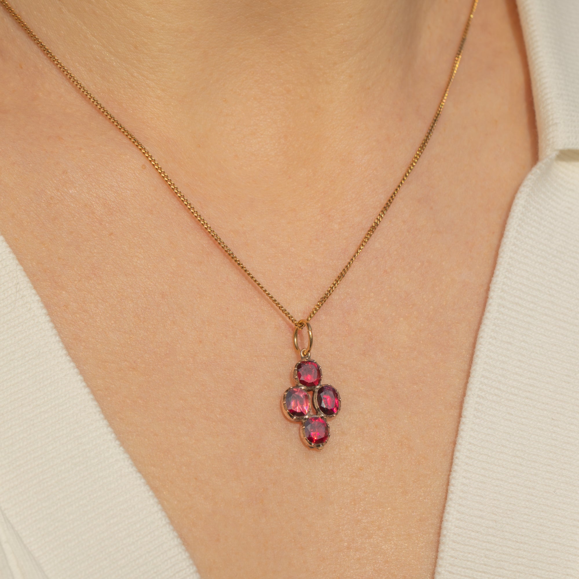 This Georgian 9ct Gold flat-cut Garnet cluster pendant is a sultry little treasure! The four Garnets are arranged into an elegant diamond-shaped cluster, emanating seductive burgundy hues with flashes of bright crimson as they move in the light.