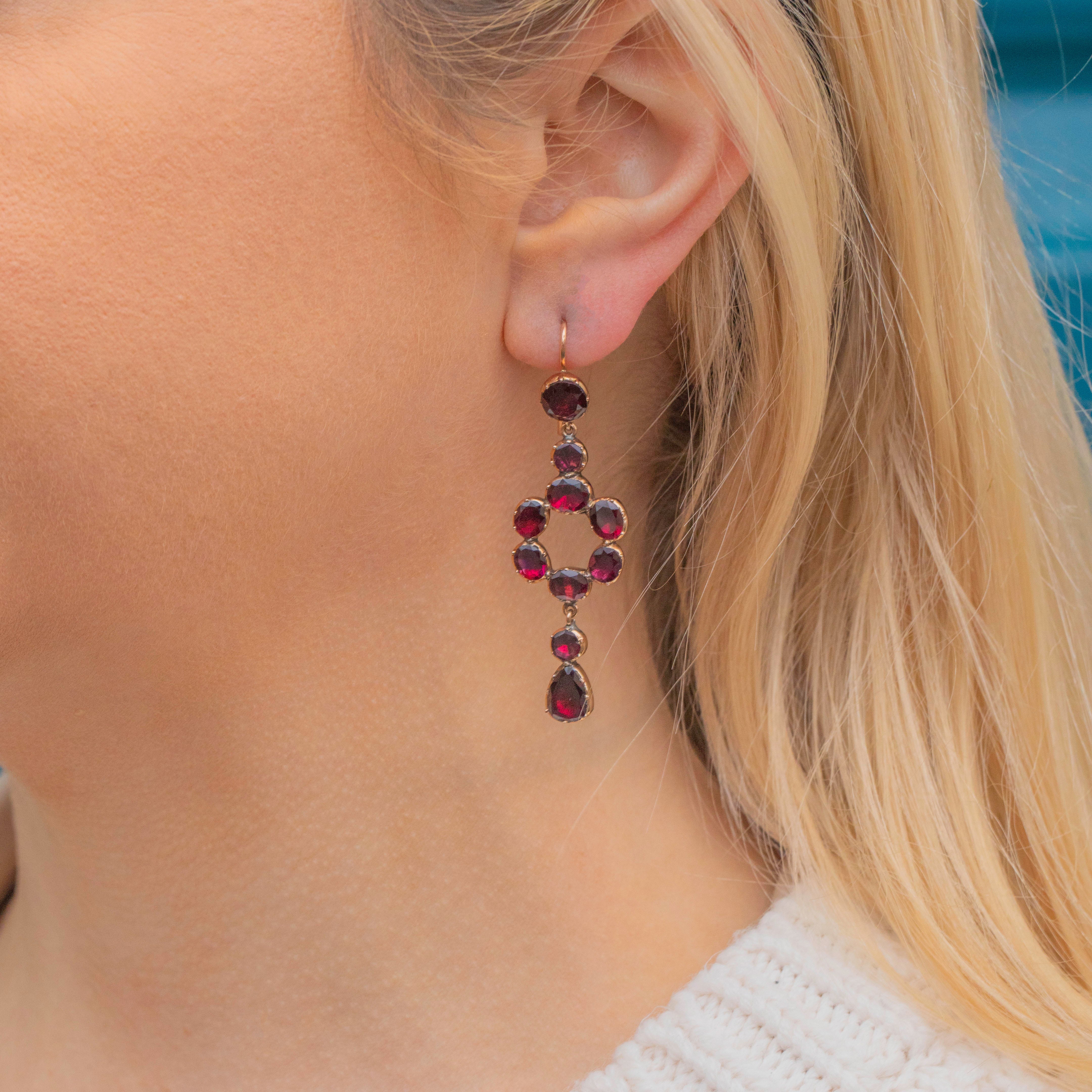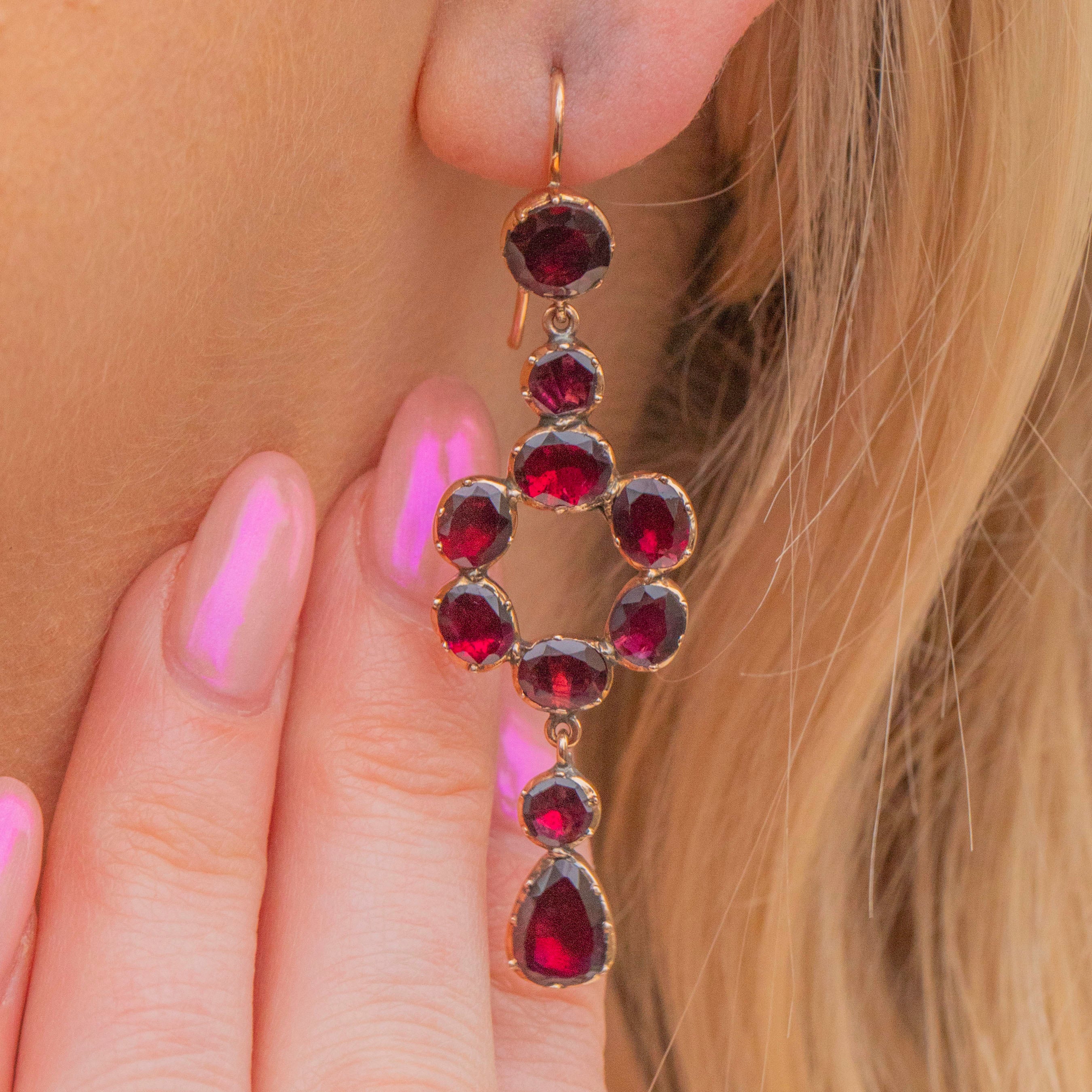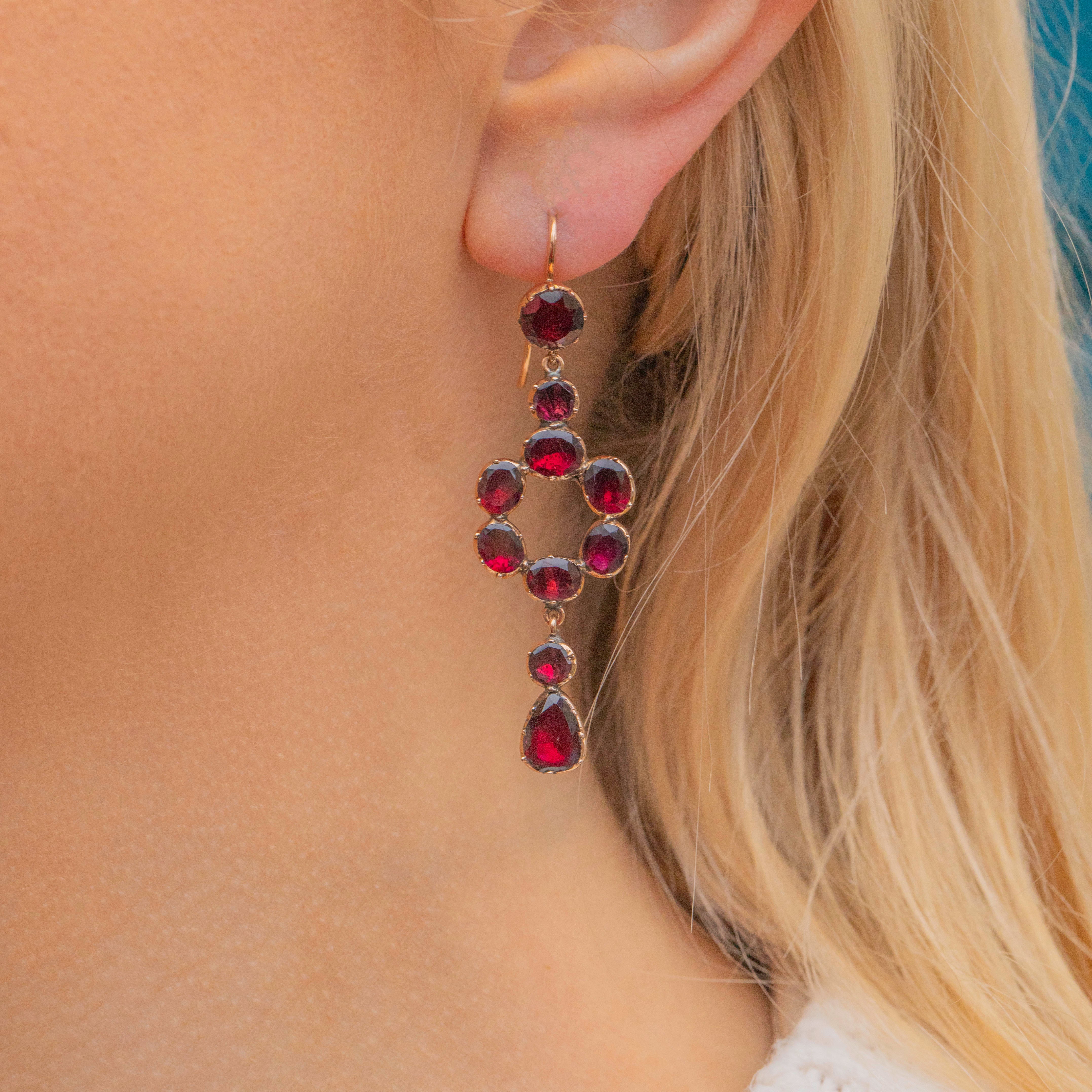 These Georgian 9ct Gold Flat-Cut Garnet Drop Earrings are one of the most elegant pairs of antique earrings we have ever seen! Rich in sparkly scarlet tones, these earrings will complete your outfit.
