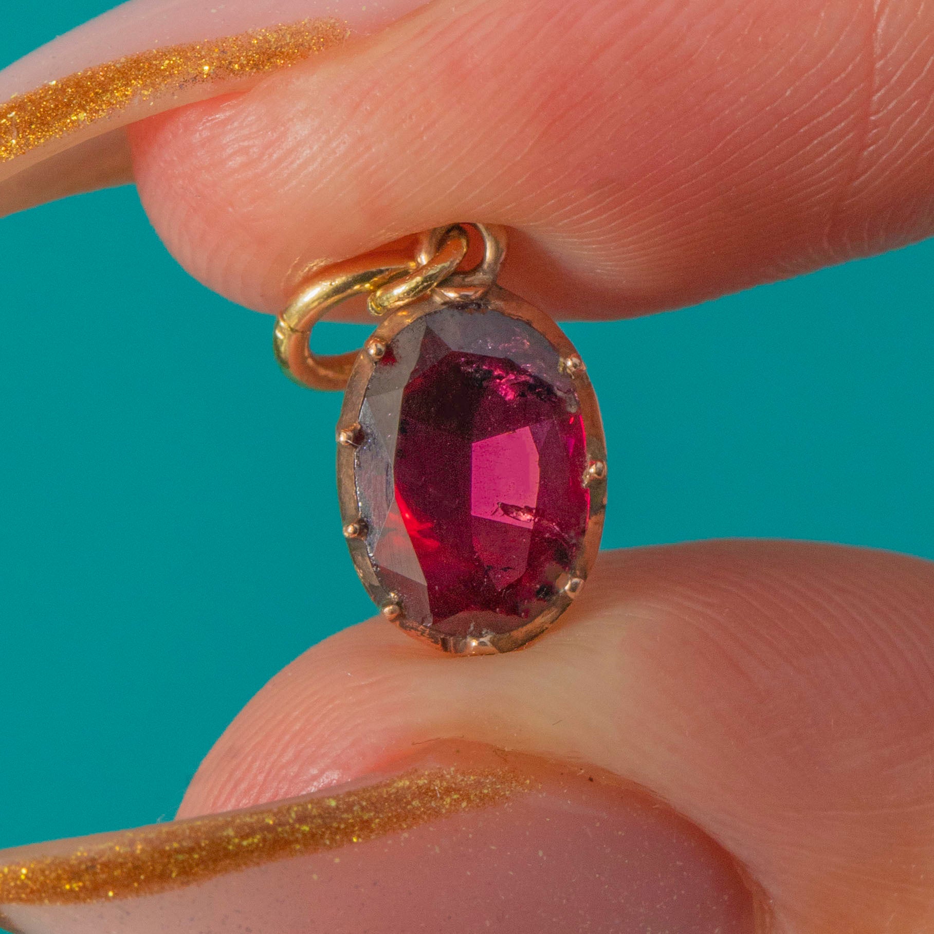 EXCELLENT: This Georgian charm is in superb condition for its age. The Garnet is well-preserved with a radiant foiled glow, and the Gold setting is secure and free from dents or damage. A beautiful miniature piece, full of antique character and charm.