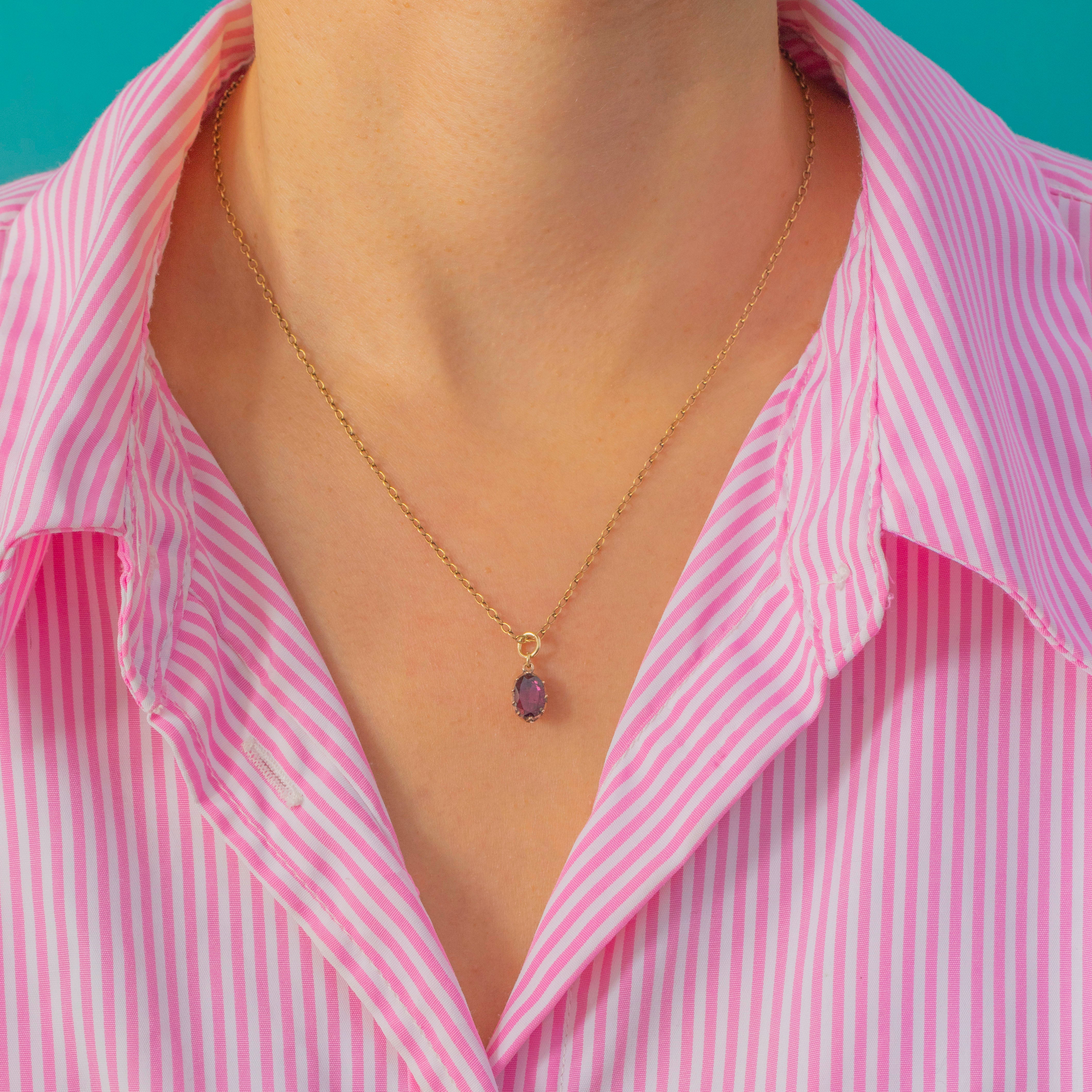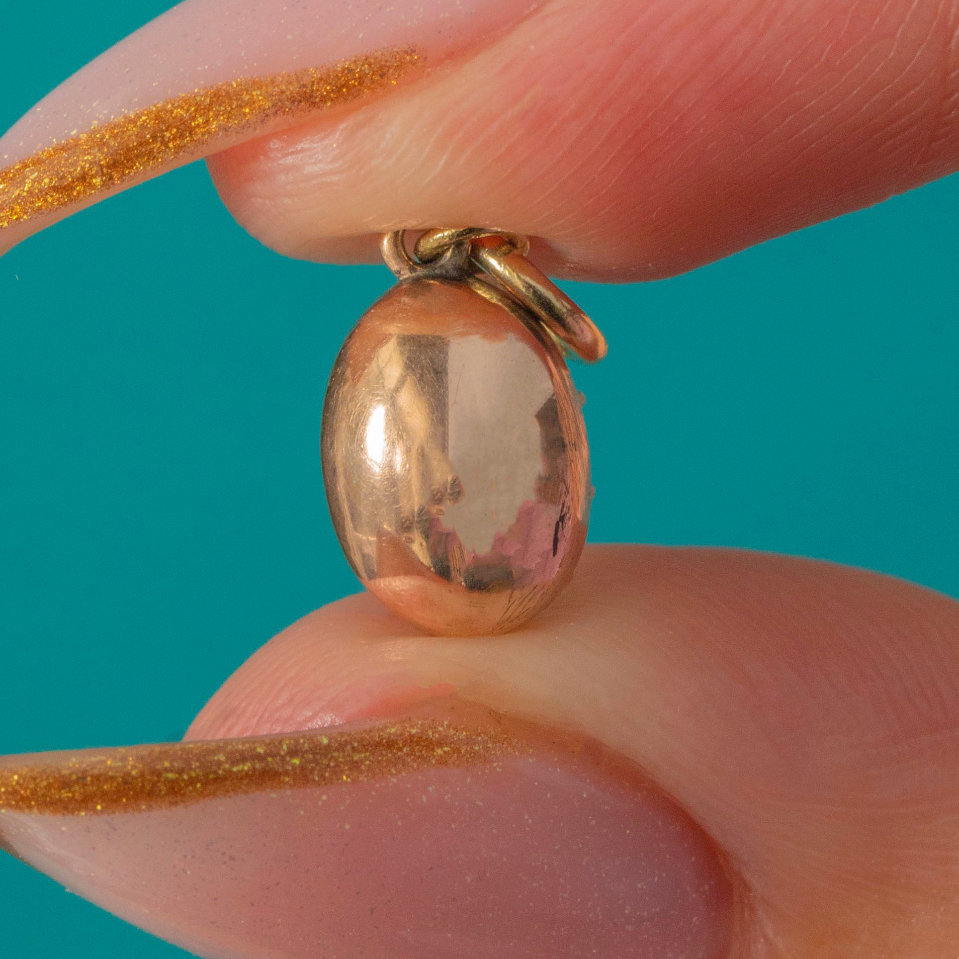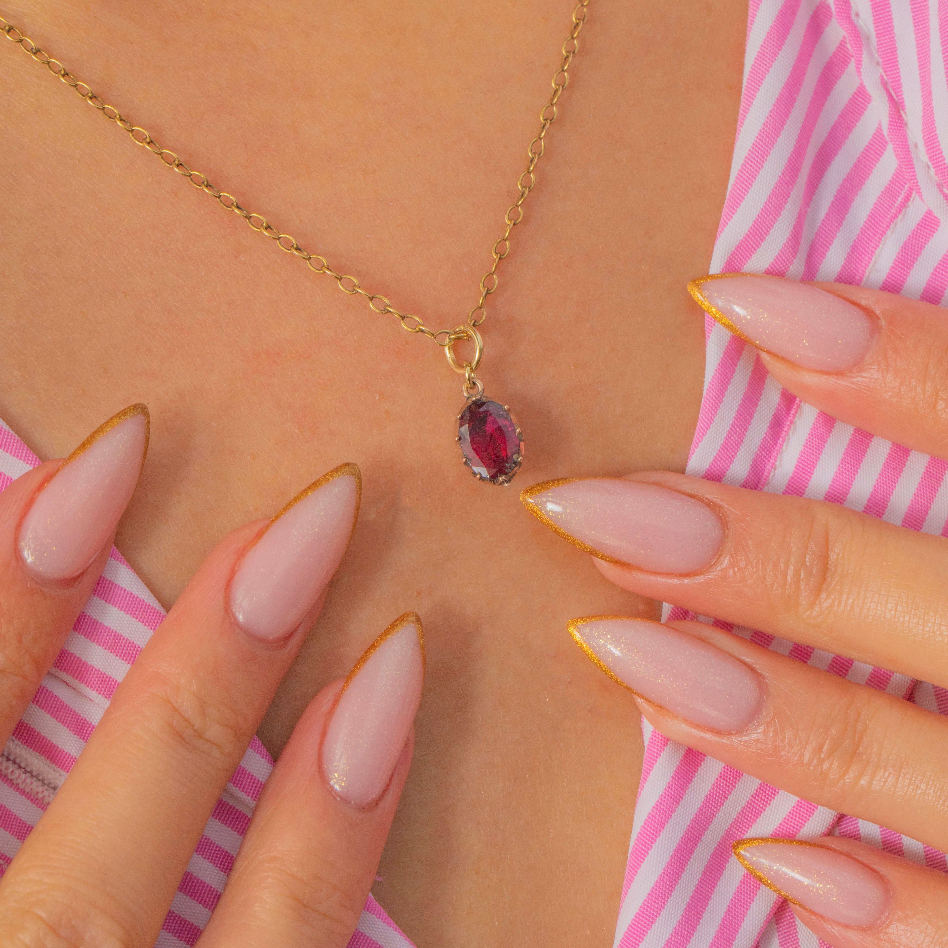 This dainty Georgian charm glows with the rich red warmth of a foiled Garnet, beautifully showcased in a closed-back 9ct Gold piecrust setting. Its petite proportions make it perfect for layering with other antique treasures or wearing alone as a subtle nod to Georgian elegance.