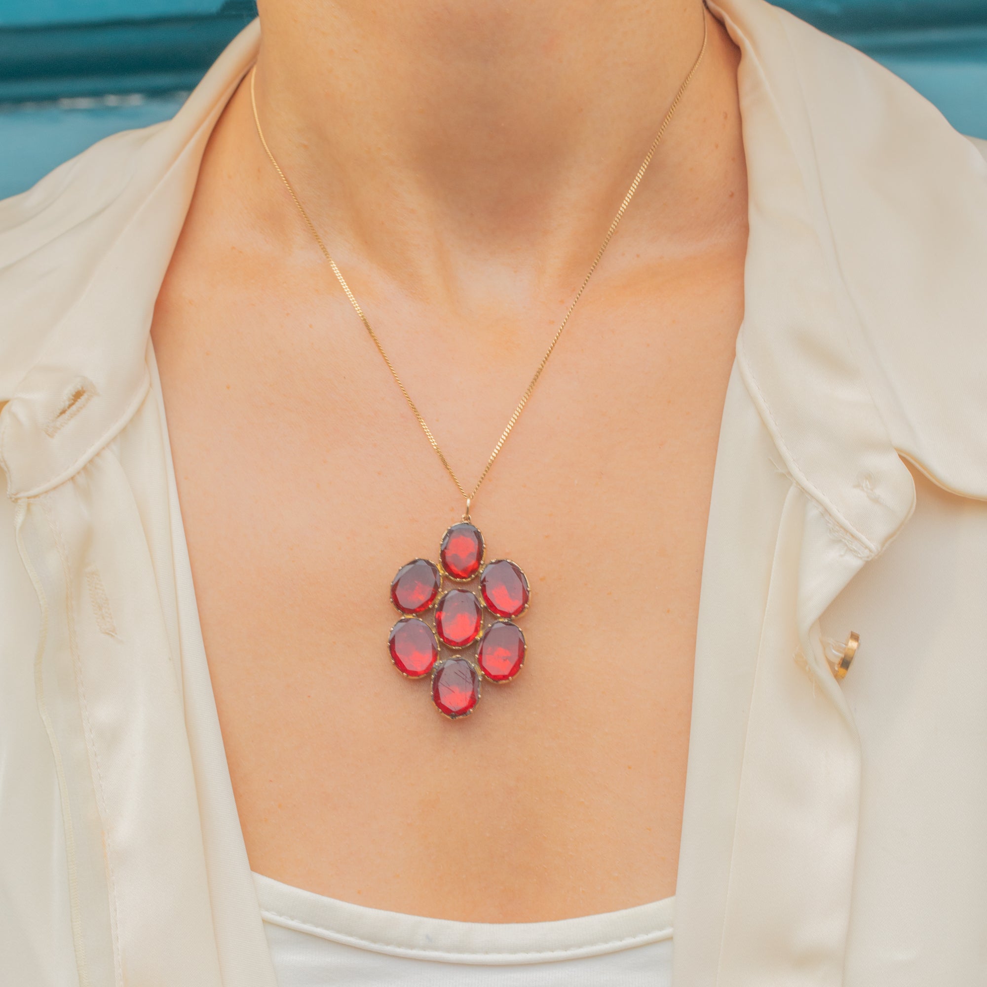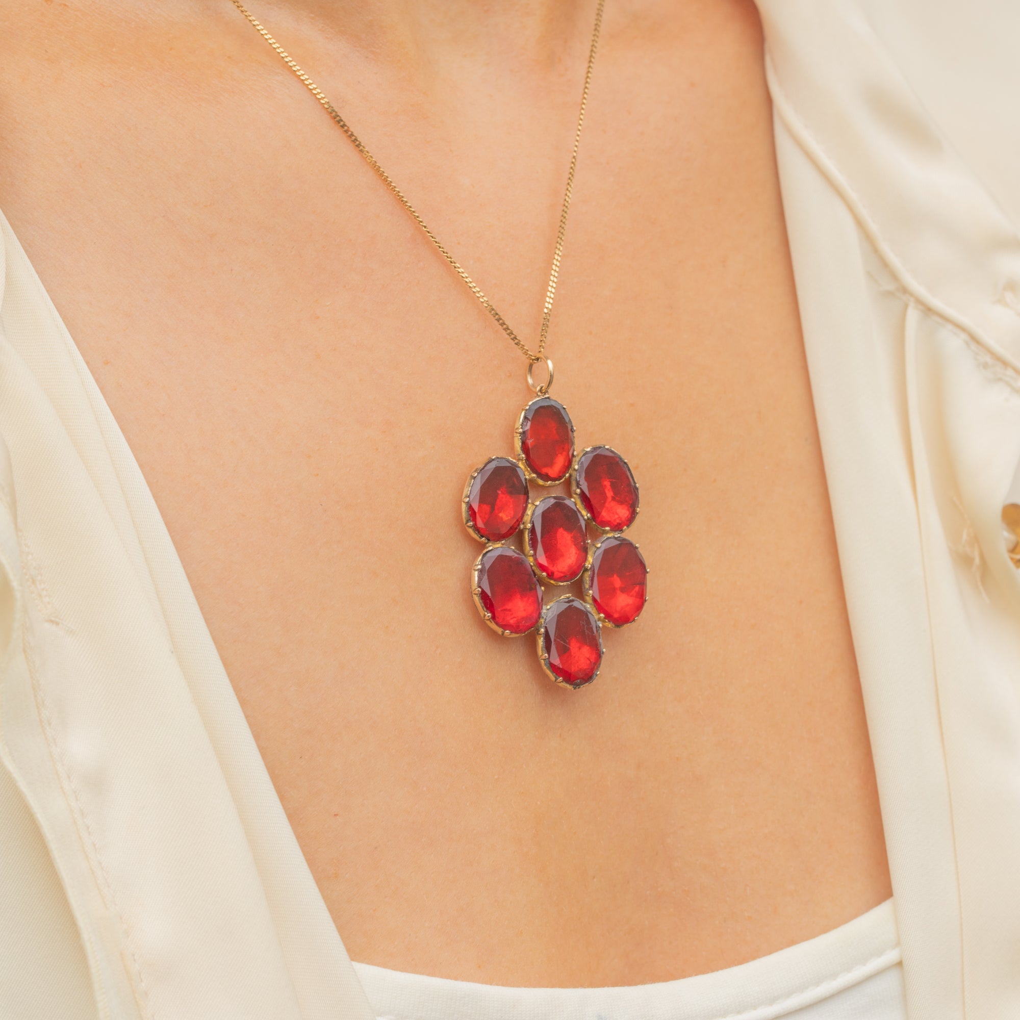 A striking Georgian pendant crafted in warm 9ct Gold, set with rich, foiled Garnet pastes that glow with depth and warmth.
