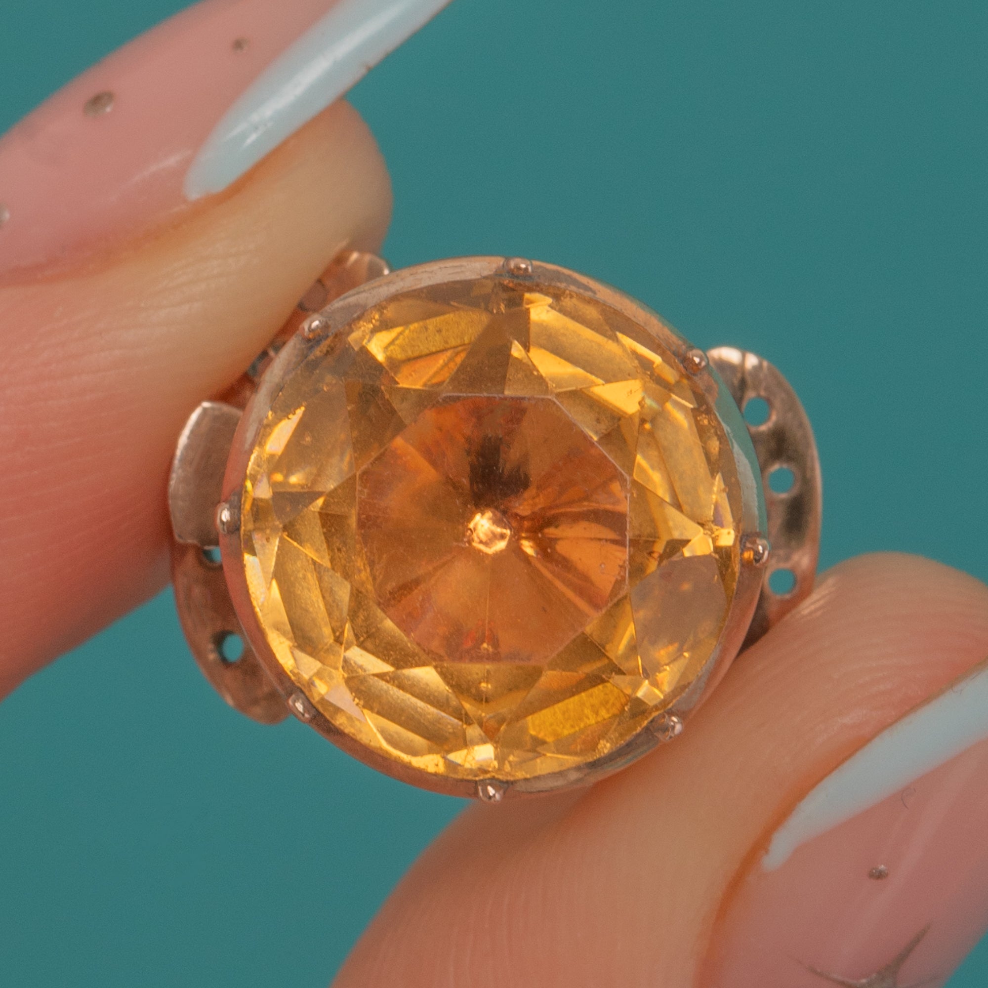 EXCELLENT: The Yellow Paste shows only light abrasions and minute facet wear visible under magnification, remaining bright and lively. The 9ct Gold setting has fine surface scratches and a soft patina consistent with age, with crisp edges and a well-preserved finish. No obvious repairs or alterations observed.