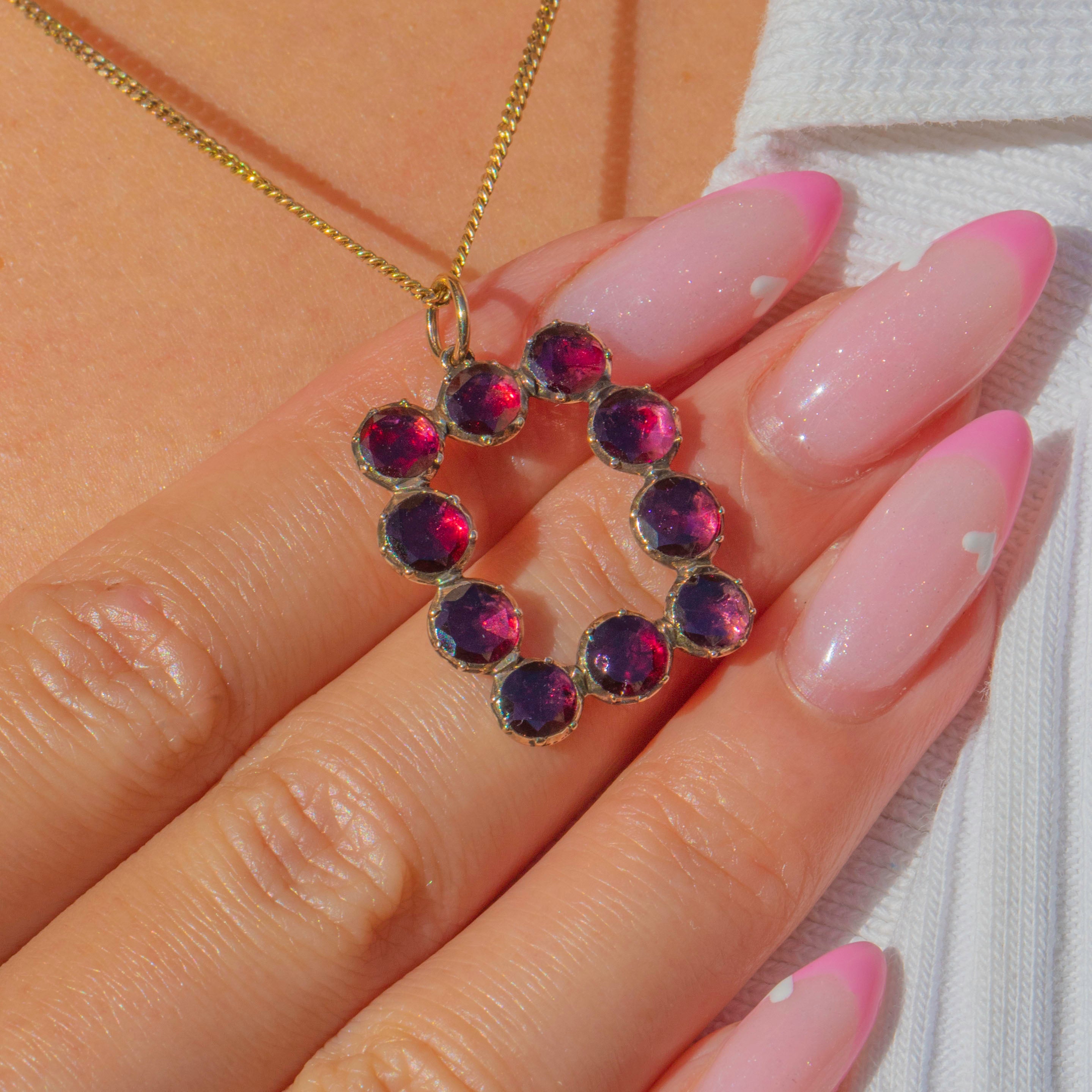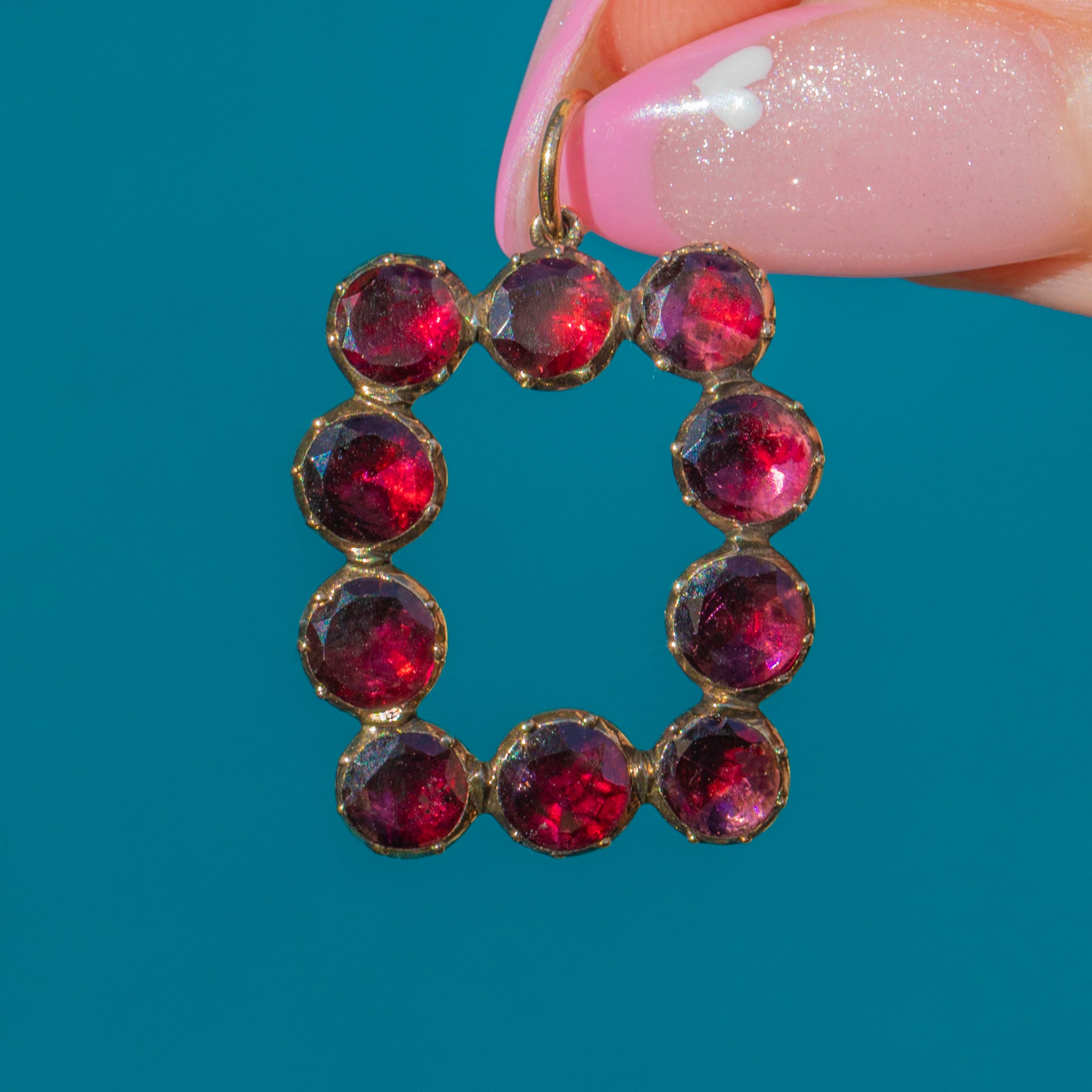 A beautiful Georgian pendant crafted in 9ct Gold and set with richly hued flat-cut Garnets. Arranged in an elegant rectangular configuration, the glowing crimson stones are enhanced by their foiled backings.