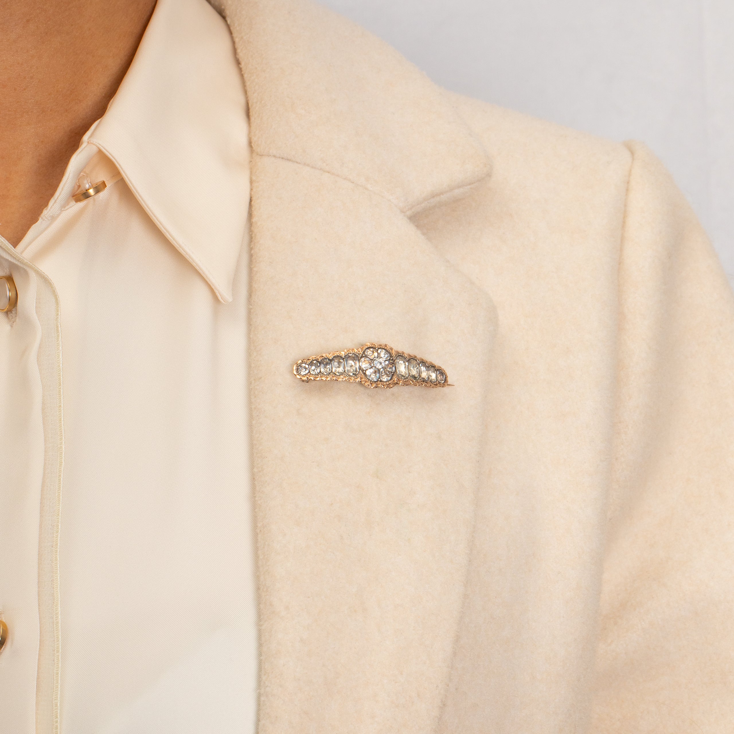 This Georgian black dot Paste flower brooch is simply spellbinding! Inlaid with glittering Diamond Paste, this piece captures everything we love about Georgian-era jewellery. This exquisite brooch features a captivating floral shape at its centre, meticulously crafted from shimmering black dot Paste. The floral cluster is flanked by graduating Paste on either side, all set into decorative 9ct Gold details creating an eye-catching piece.