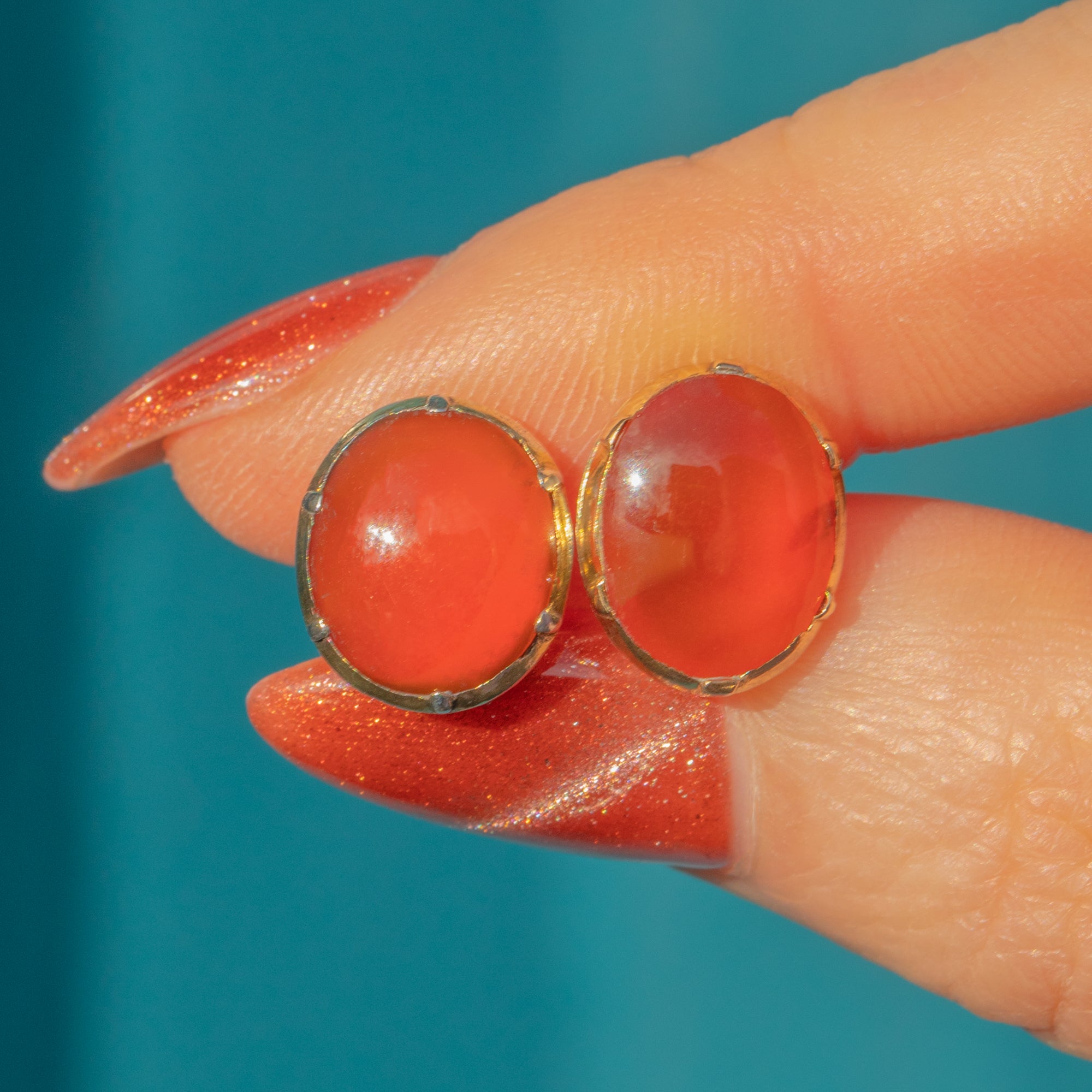 Add a touch of Georgian luxury to your lobes with these striking Georgian Carnelian oval stud earrings! The smoothly cut Carnelian cabochons boast a seductive vermillion orange hue and are displayed within crimped piecrust settings adding a decorative finishing touch.