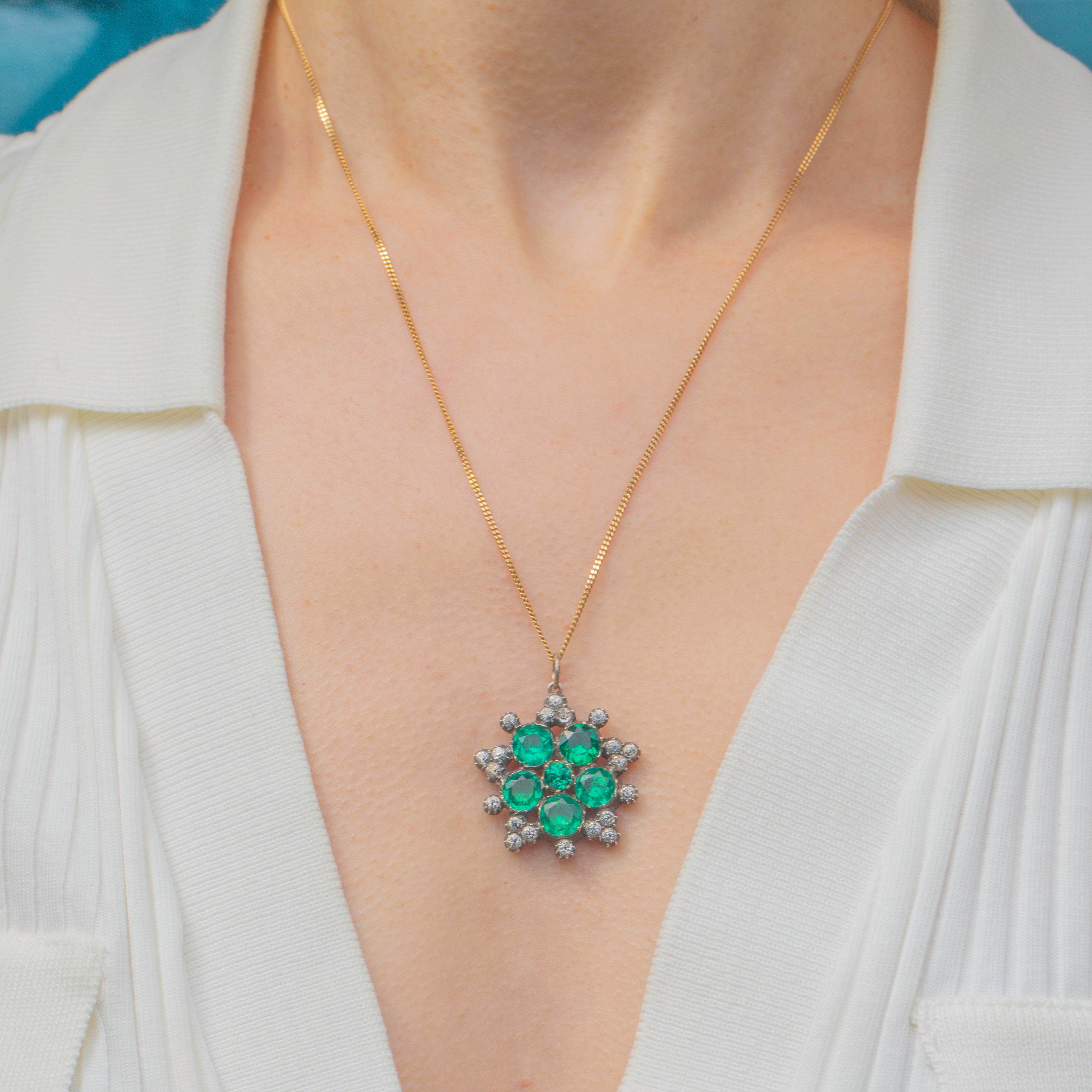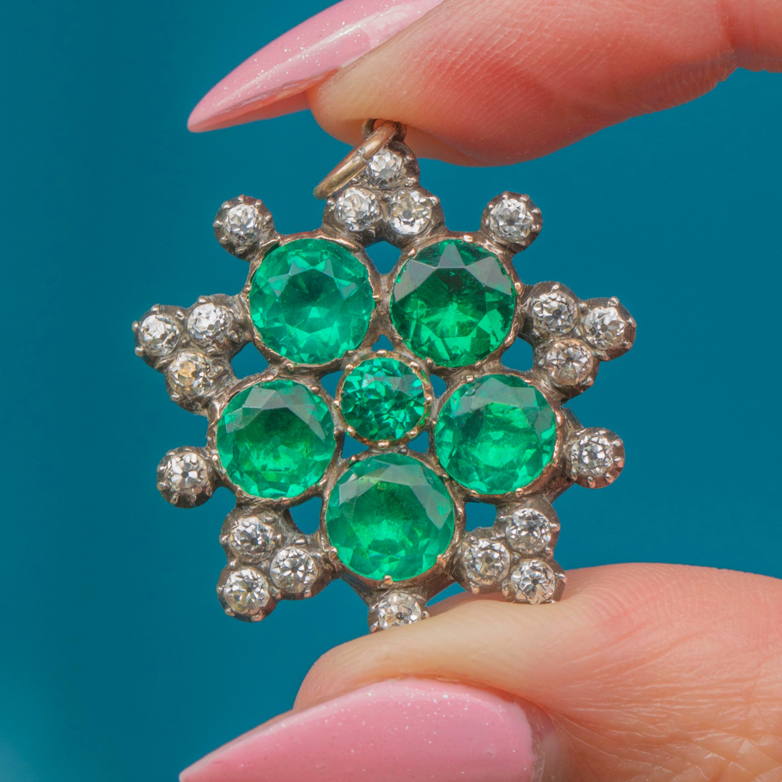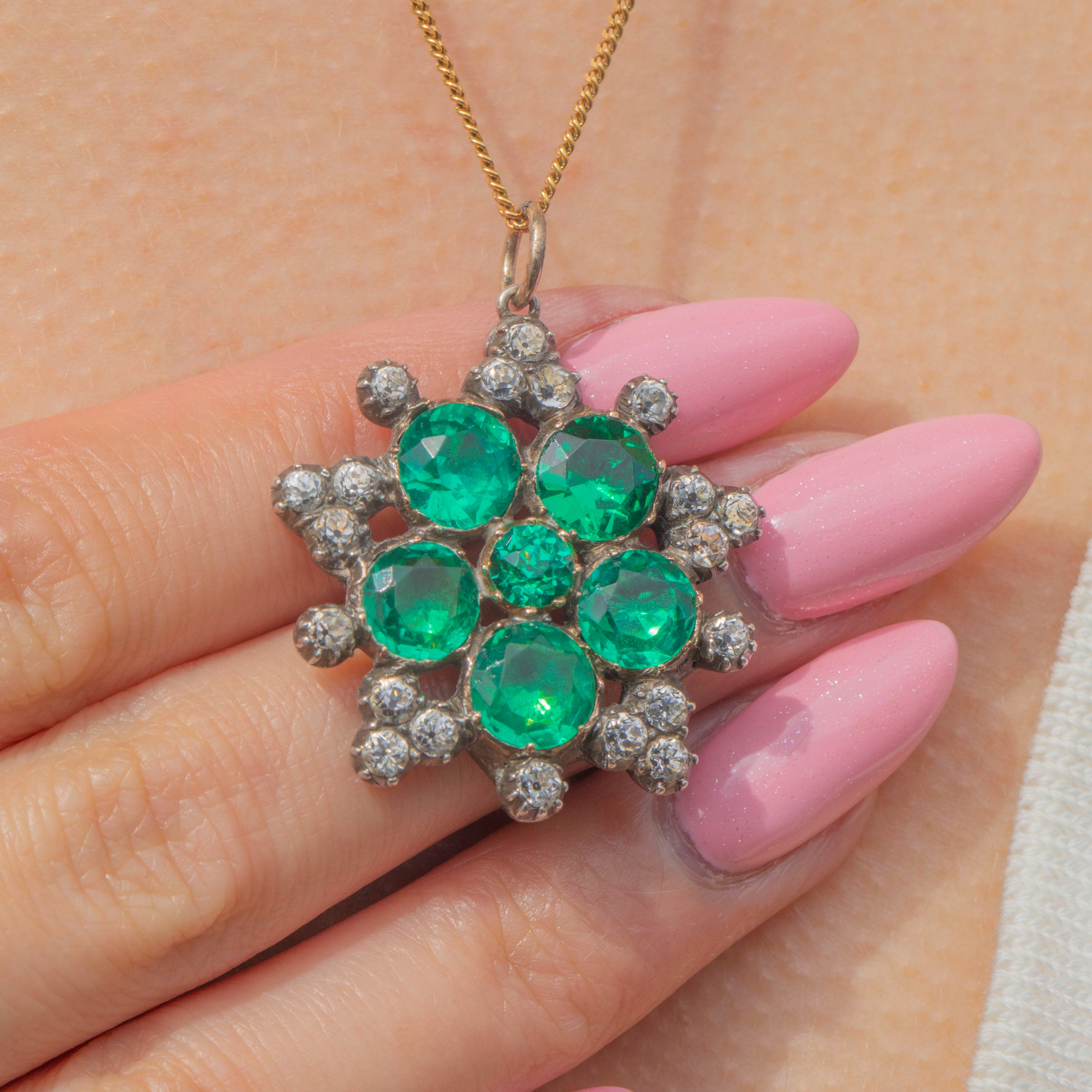 This Georgian green & black dot Paste cluster pendant will add a vibrant flourish to your décolletage! Finely crafted from solid Silver and backed with 9ct Gold, this Georgian pendant boasts a floral cluster of Emerald Paste in the centre bordered by bright Diamond Paste, all foiled crisply faceted to catch the light magnificently.