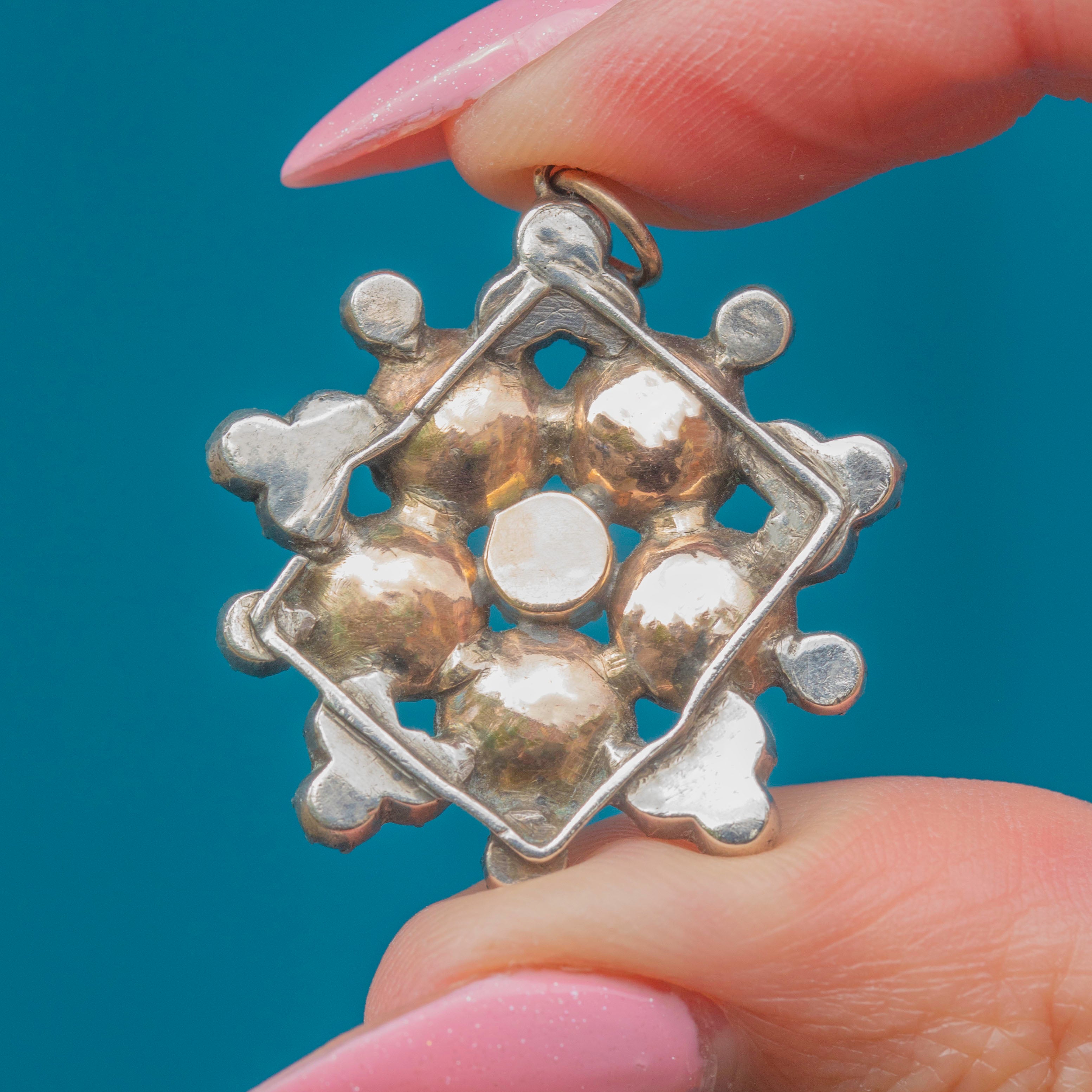 A fine example of Georgian craftsmanship, the Paste have all been meticulously set within piecrust settings, and each white Paste displays a hand-painted black dot to mimic the culet of a Diamond. This antique Paste pendant will make a striking addition to your collection!