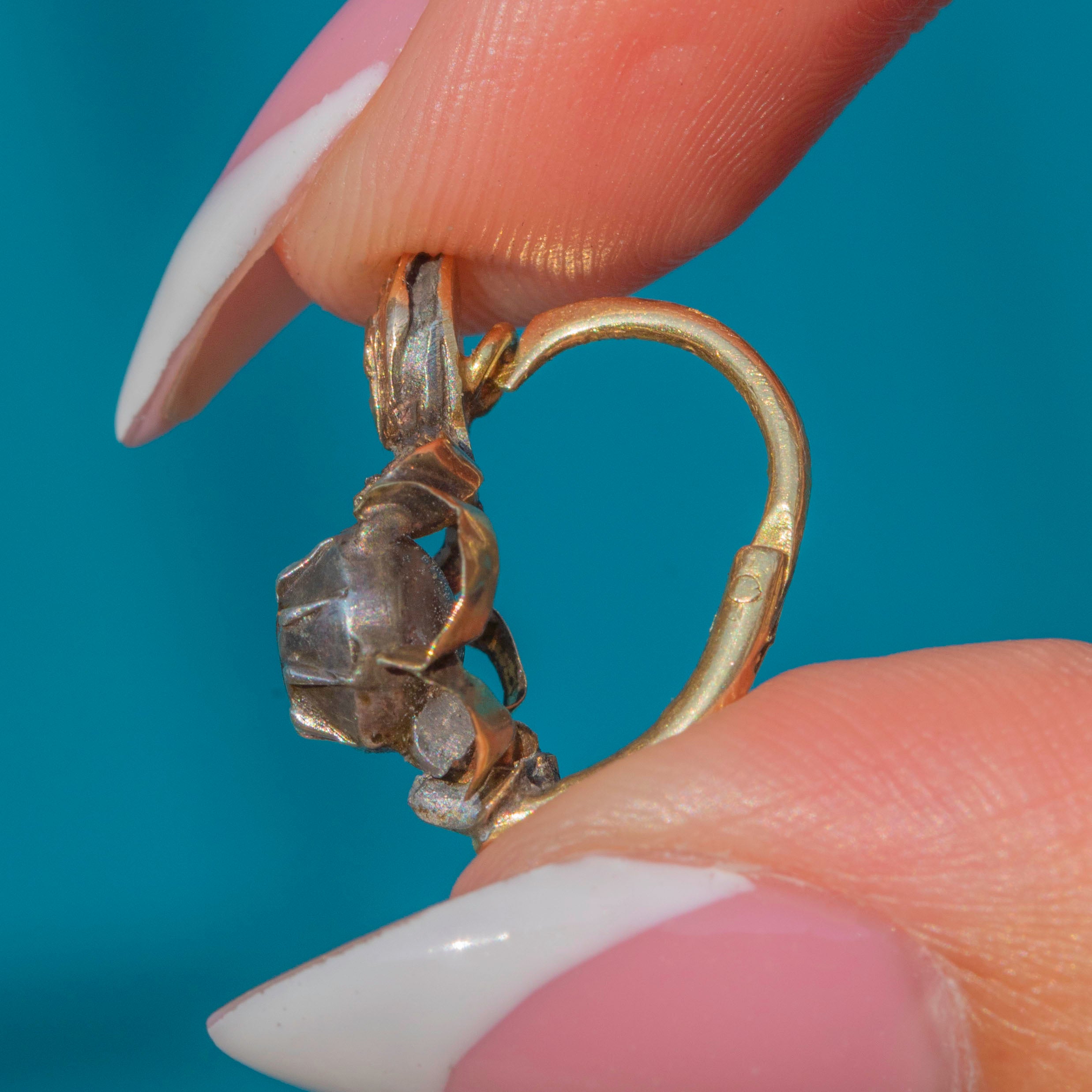 EXCELLENT: Each Diamond is radiant and set securely. The Gold is bright and glossy, with only minor spots of discolouration commensurate with age. With its levers in perfect working order, you can wear these Georgian drop earrings with utmost confidence.