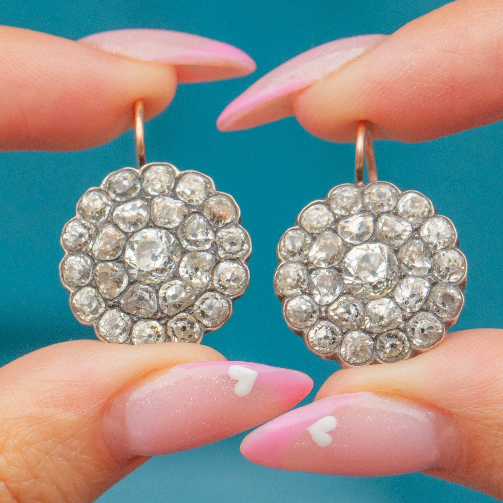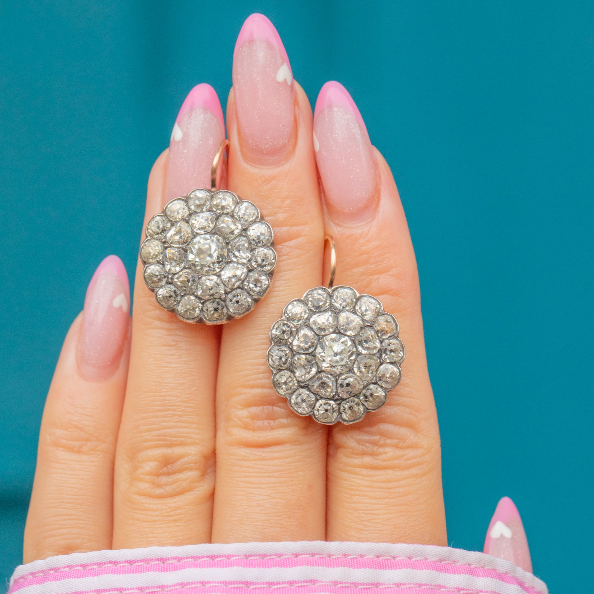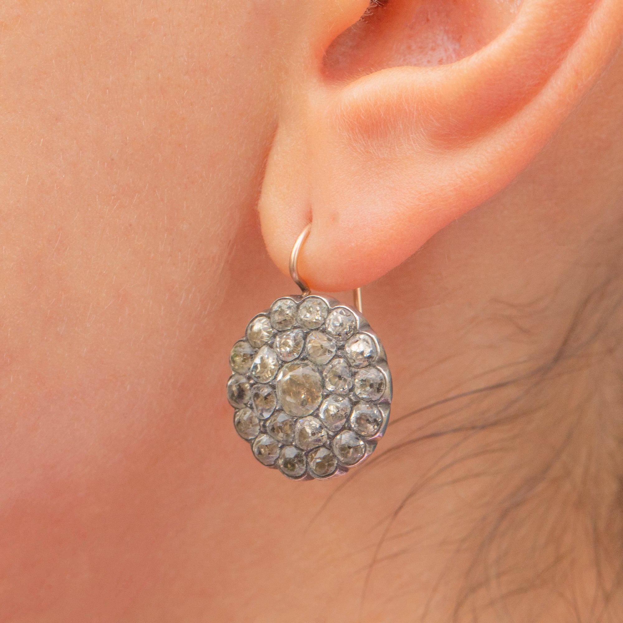 These exquisite Georgian Paste earrings shimmer with old-world brilliance. Each earring features a double halo of hand-cut Black Dot Paste stones set in Silver, catching the light with that soft, candlelit sparkle so distinctive of the Georgian era. Their impressive size and uniform stones make them particularly special — a rare surviving pair in such excellent condition.