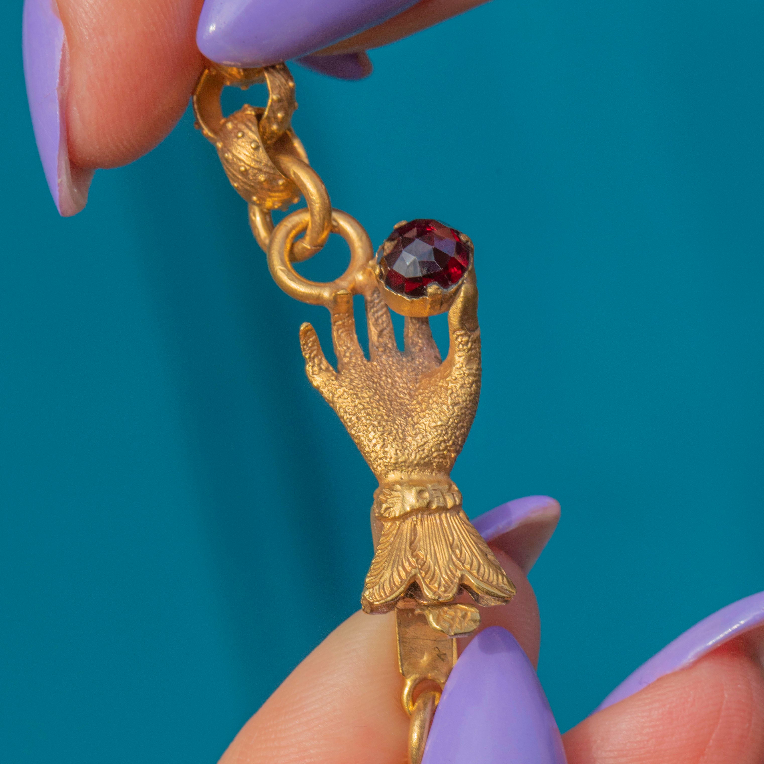 EXCELLENT: With practically nothing to report, this Georgian Pinchbeck Garnet hand clasp necklace is in excellent condition, especially considering she is over 200 years old! Her Pinchbeck links are crisp and secure, with no notable damage to their surface. Her Garnet is securely set into her Pinchbeck setting - allowing for safe and confident wear. This Georgian necklace is a highly coveted piece and will make a fine investment, guaranteed to be admired for generations to come!
