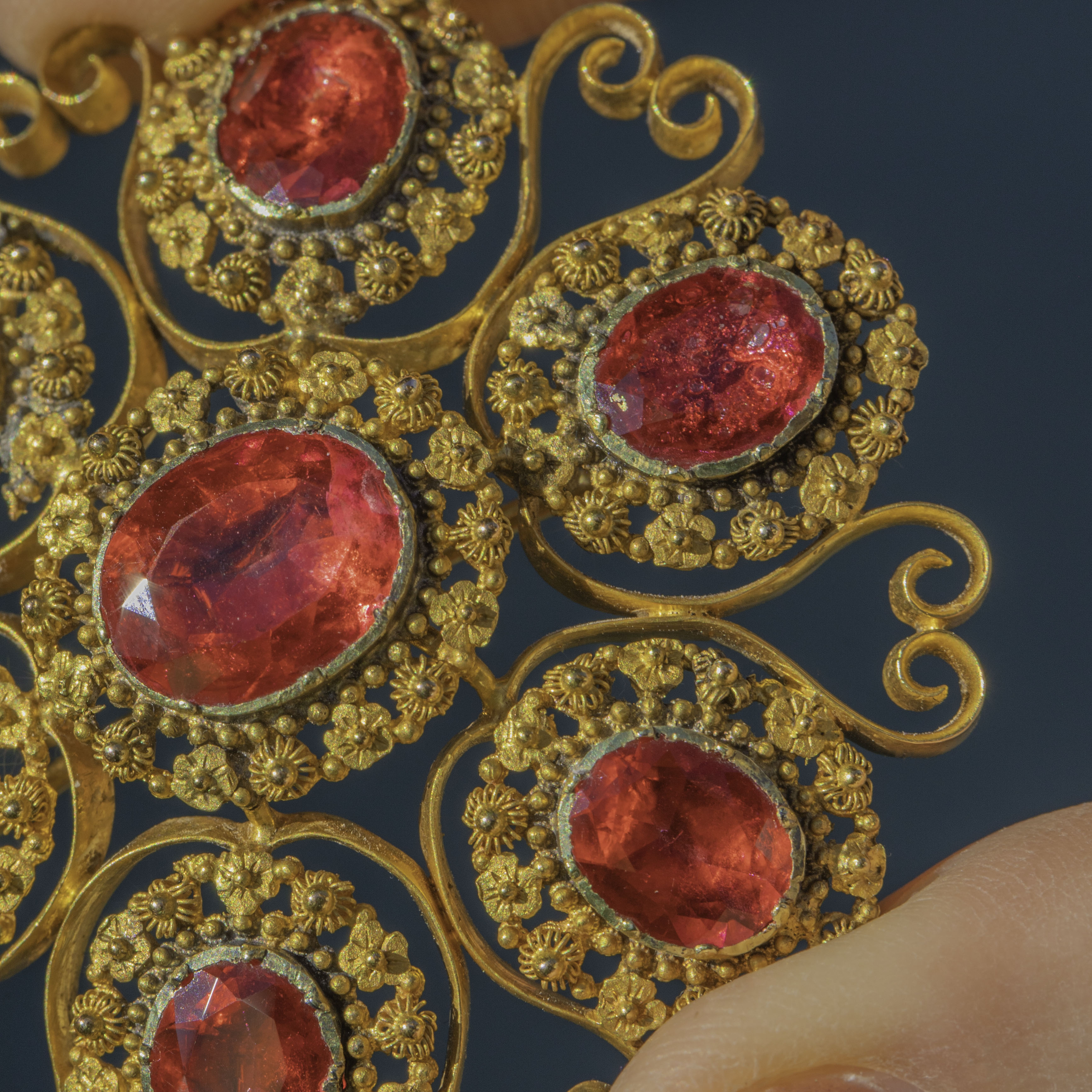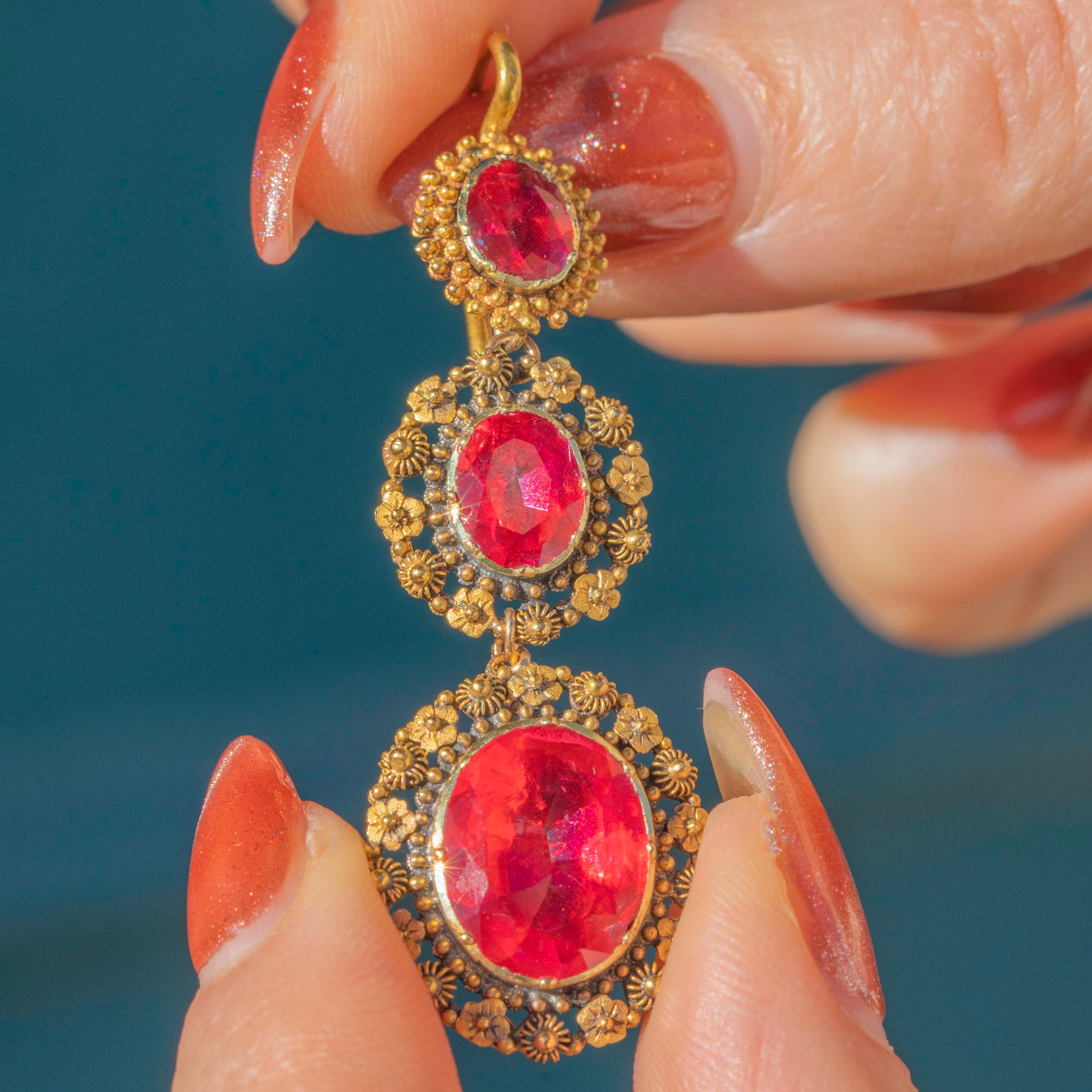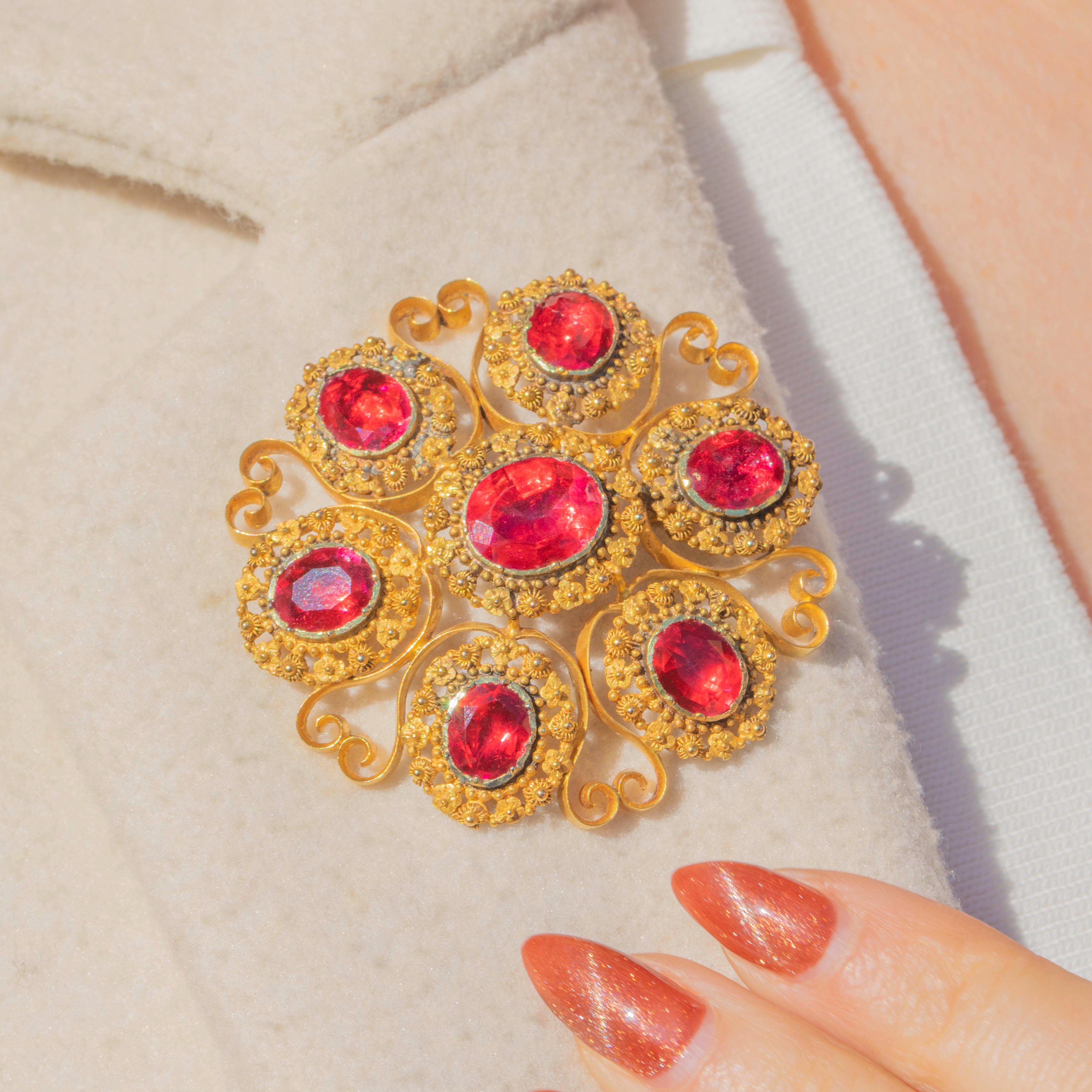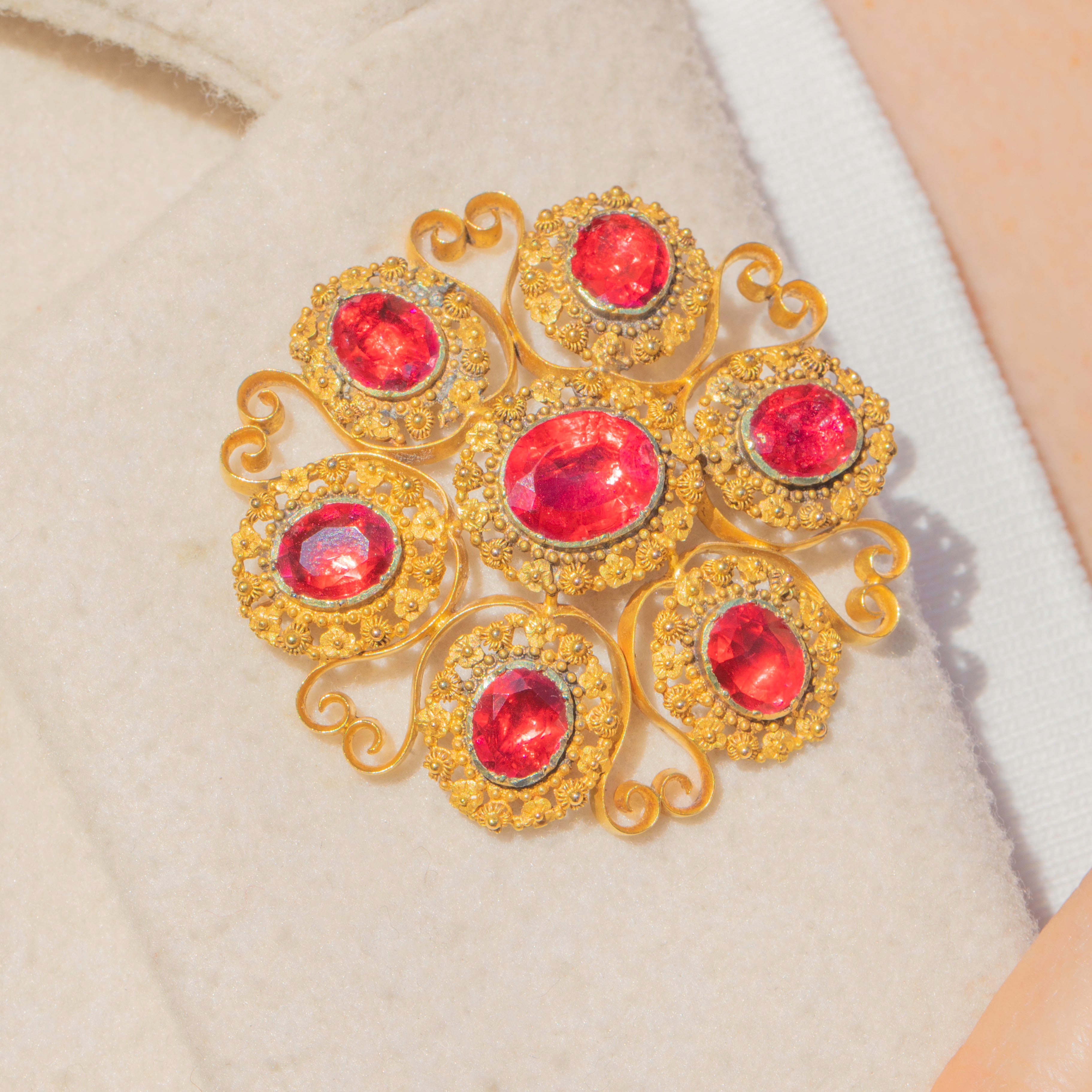 The Georgians were lovers of a parure, a full set of jewellery containing a necklace, earrings, pendant and brooch. A demi-parure comprises two to three pieces, and this one has been made with 18ct Gold and pink foiled Rock Crystal gemstones. The intricacy of the cannettille work and floral details of the Golden Pinchbeck are simply breathtaking, enhanced by the bright magenta tones of the foiled crystals