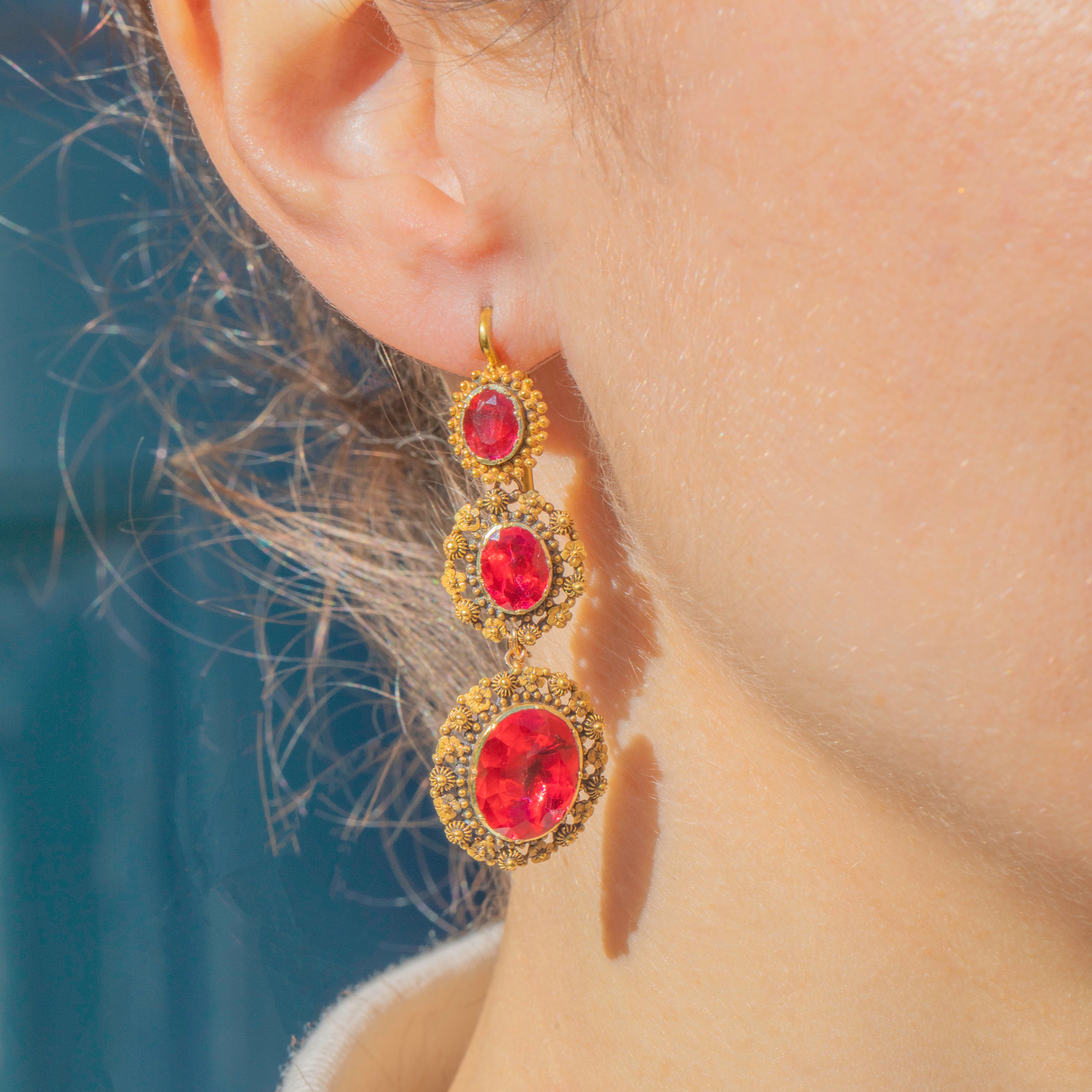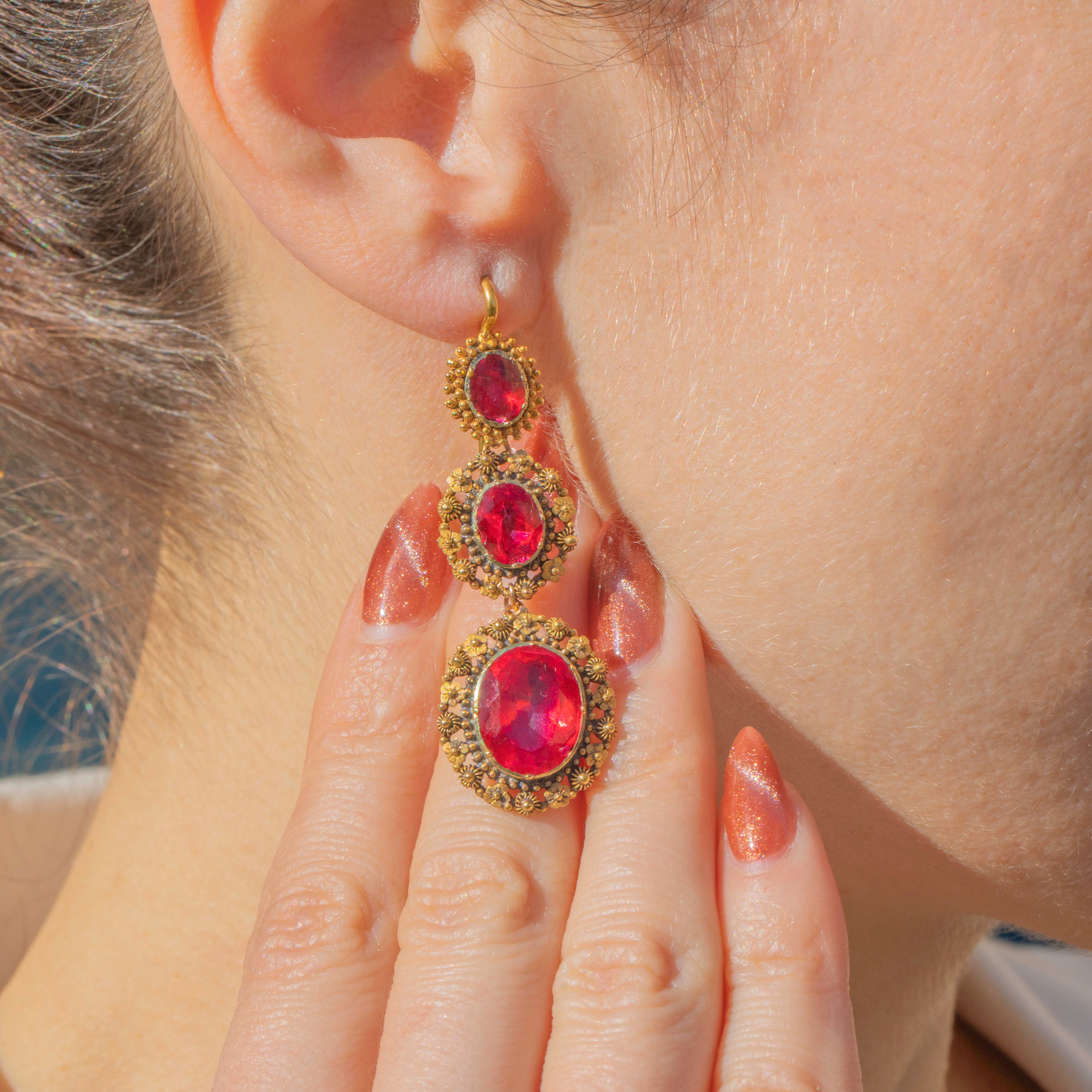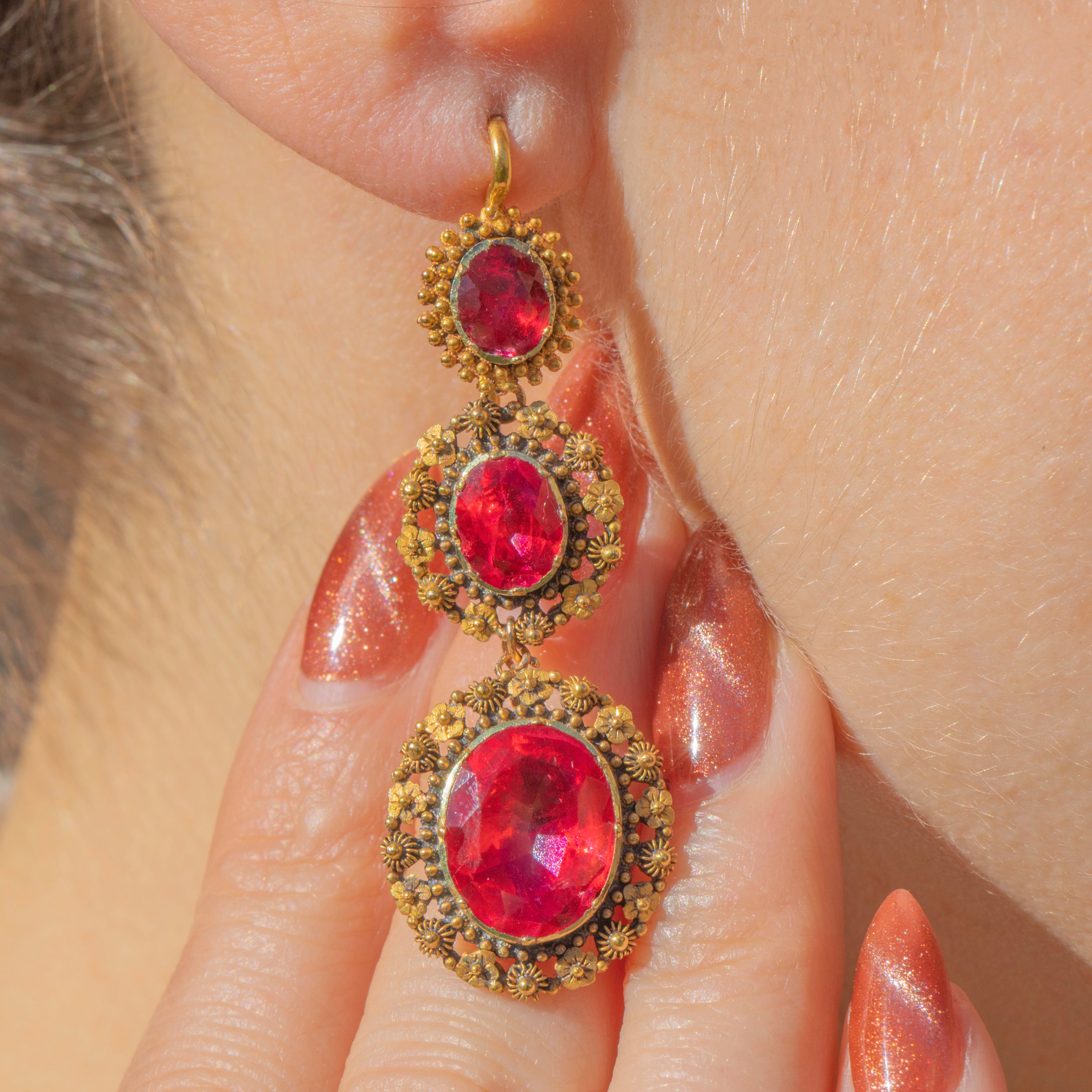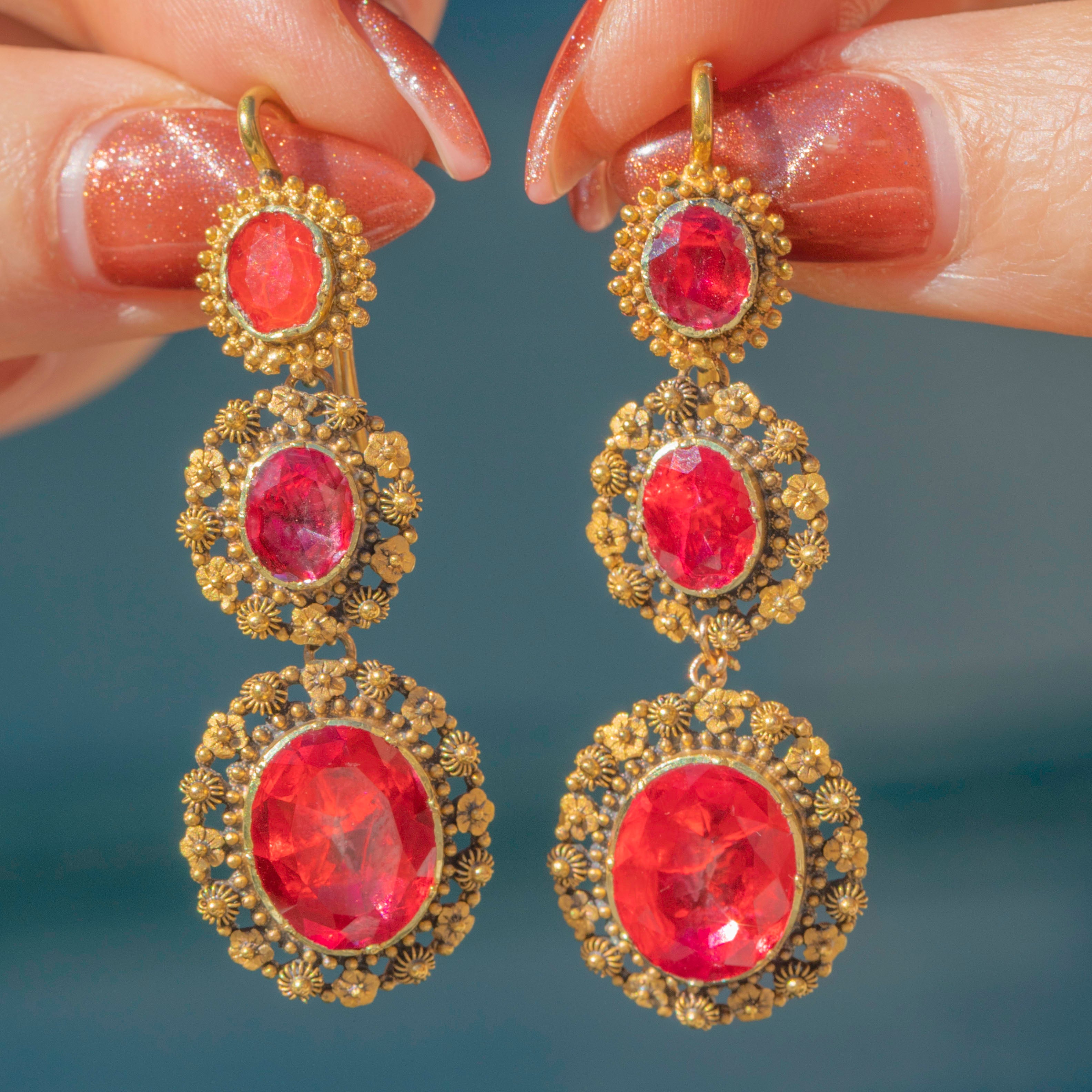 The Georgians were lovers of a parure, a full set of jewellery containing a necklace, earrings, pendant and brooch. A demi-parure comprises two to three pieces, and this one has been made with 18ct Gold and pink foiled Rock Crystal gemstones. The intricacy of the cannettille work and floral details of the Golden Pinchbeck are simply breathtaking, enhanced by the bright magenta tones of the foiled crystals