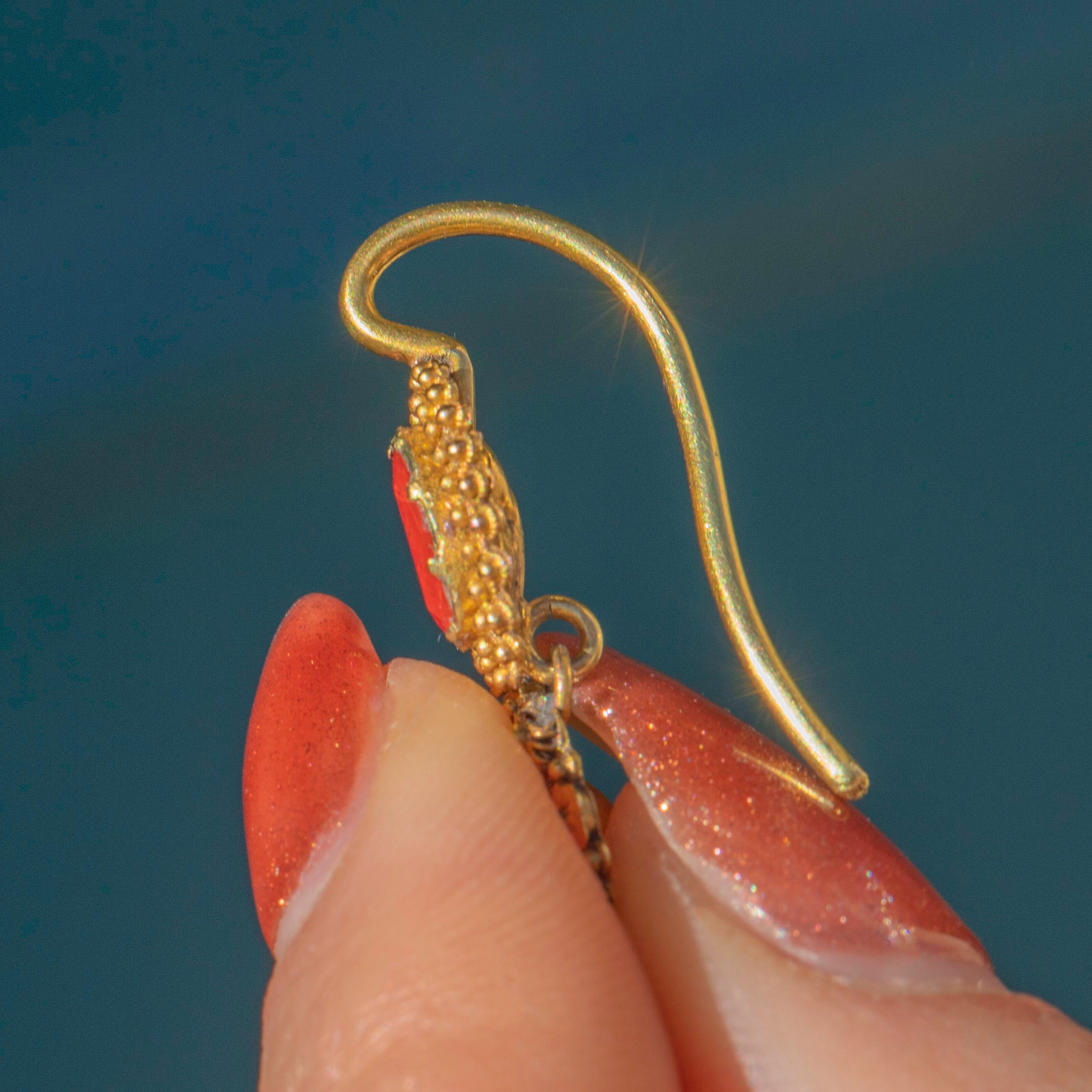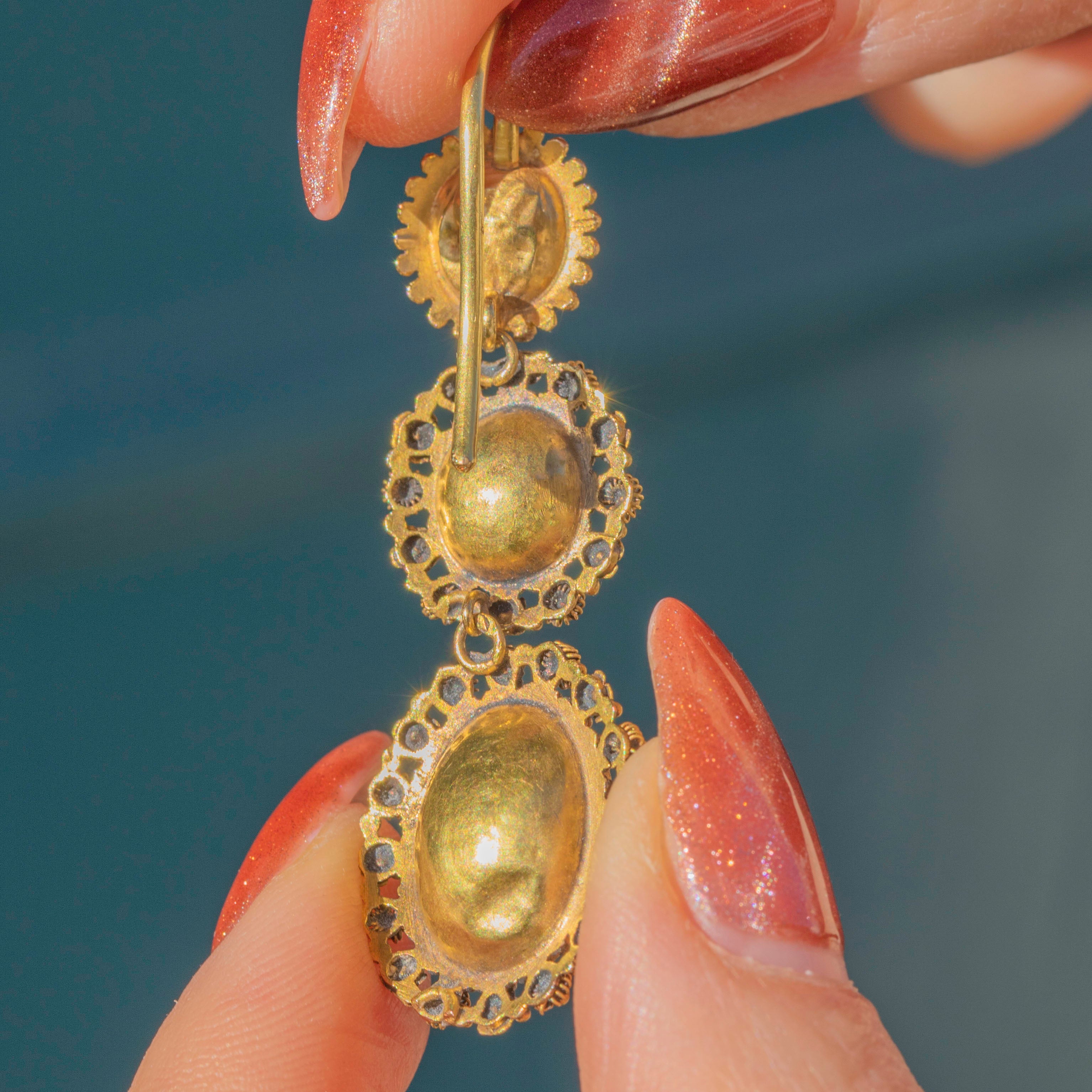 The earrings hang beautifully in the ear with 18ct Gold hooks. There are some dings notable to the back of the domed settings, but you can't see this when they're in the ear.