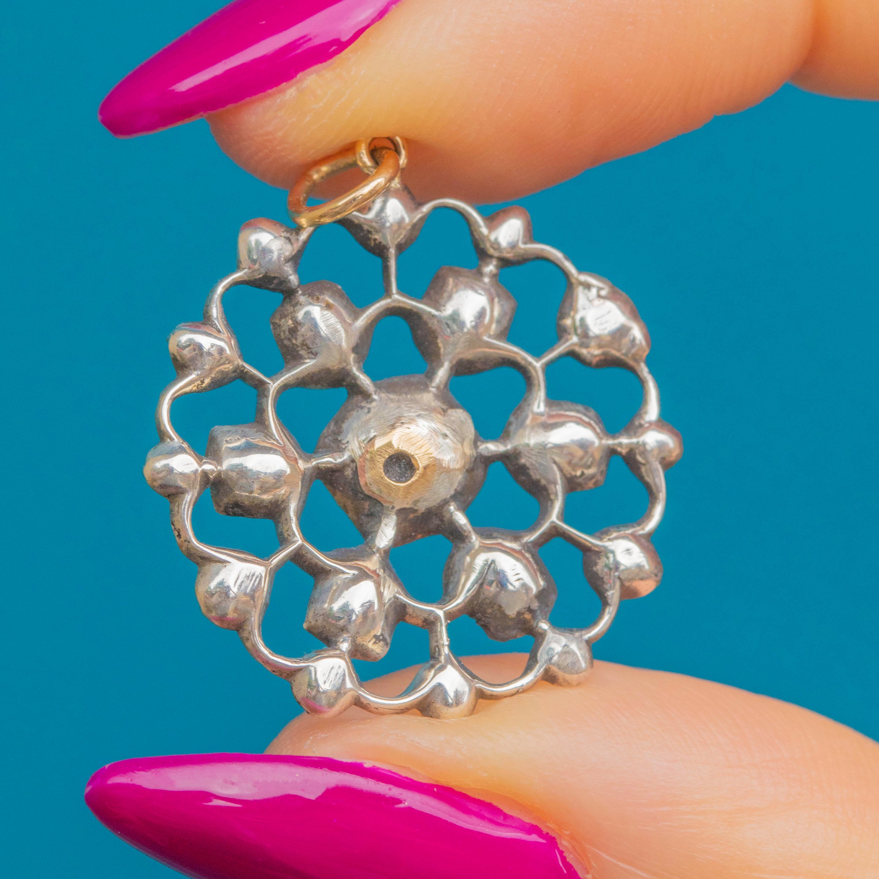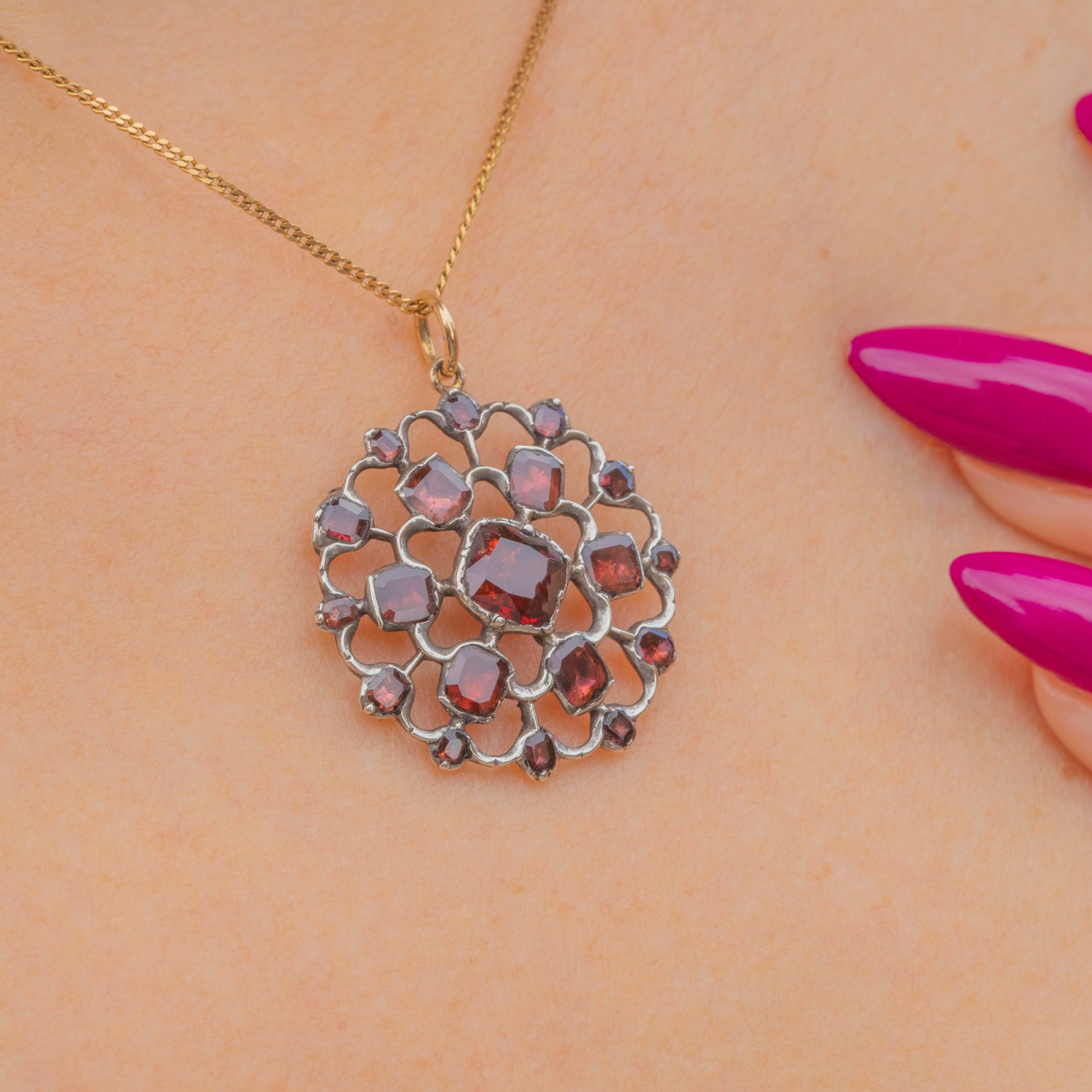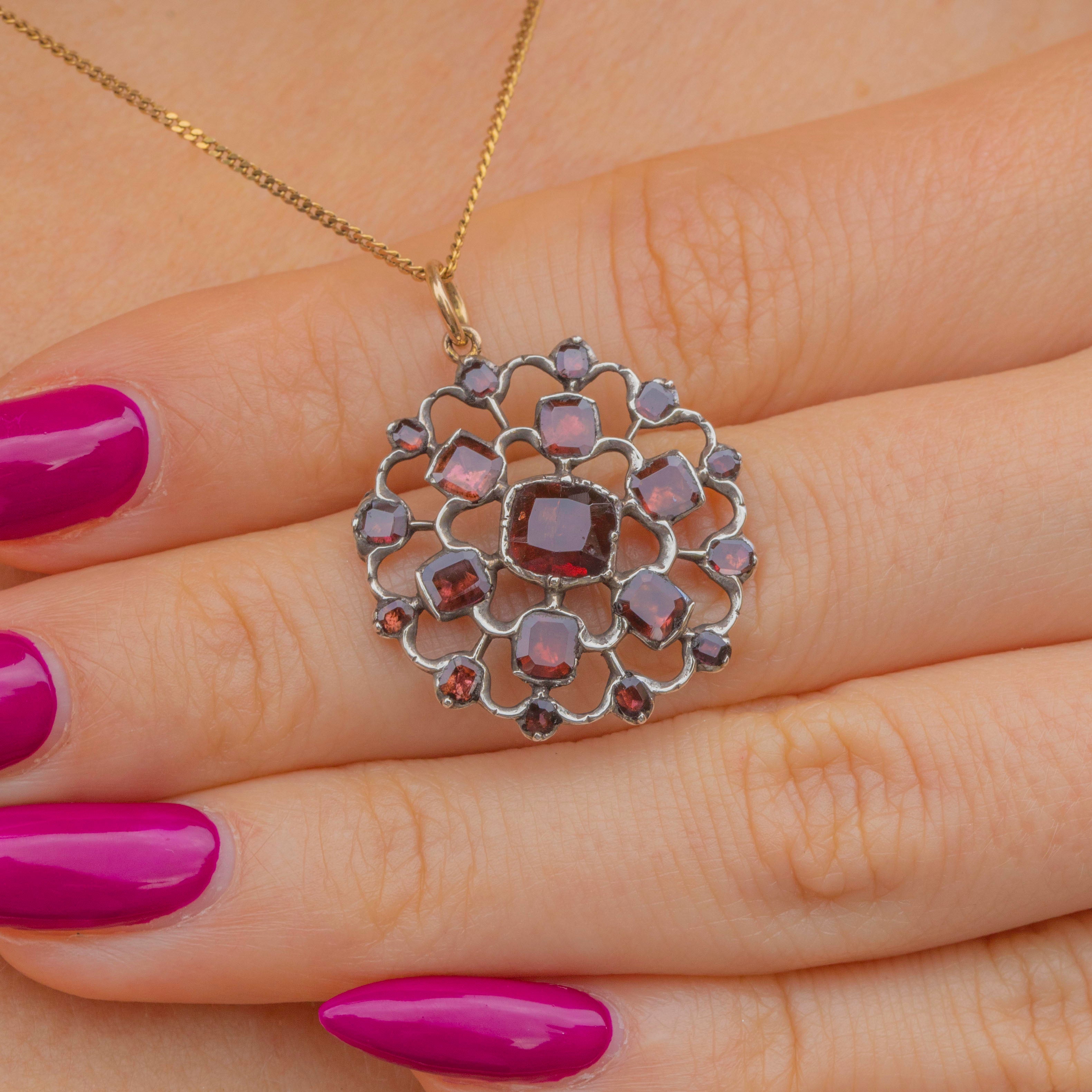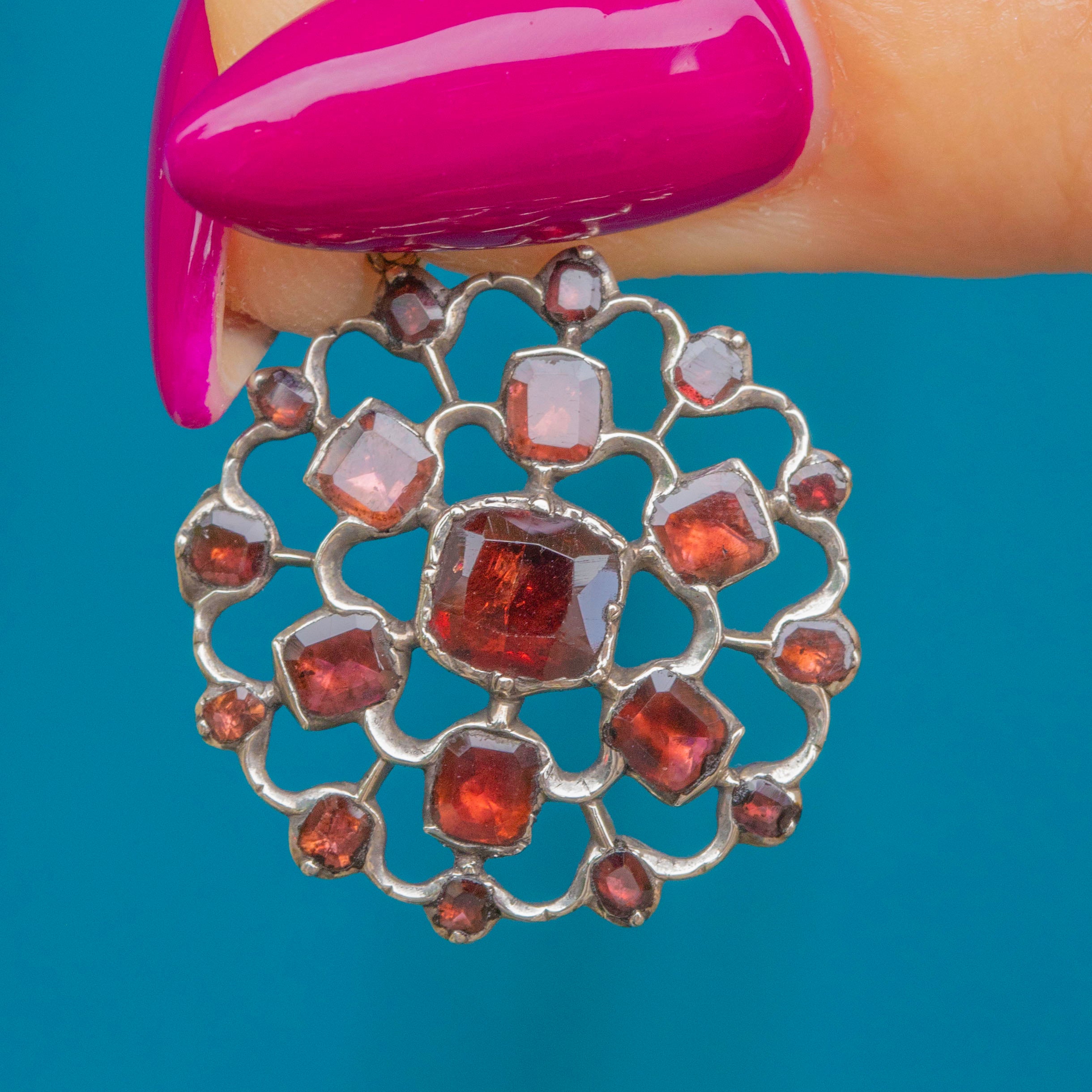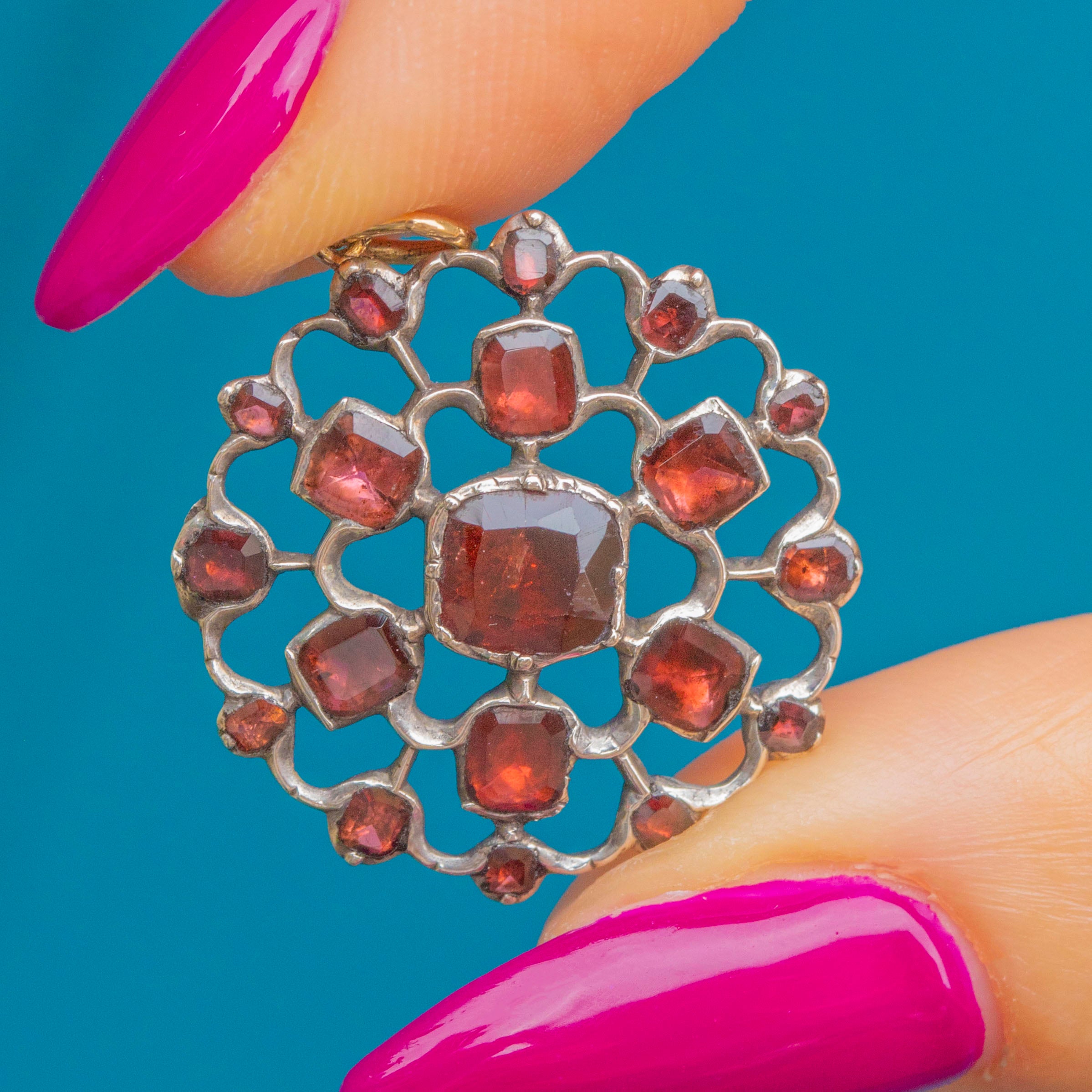 This Queen Anne pendant is an exquisite treasure from the Georgian era, made circa 1720! The pendant is crafted from Sterling Silver and formed into a striking floral cluster, inlaid with fiery flat-cut Garnets.