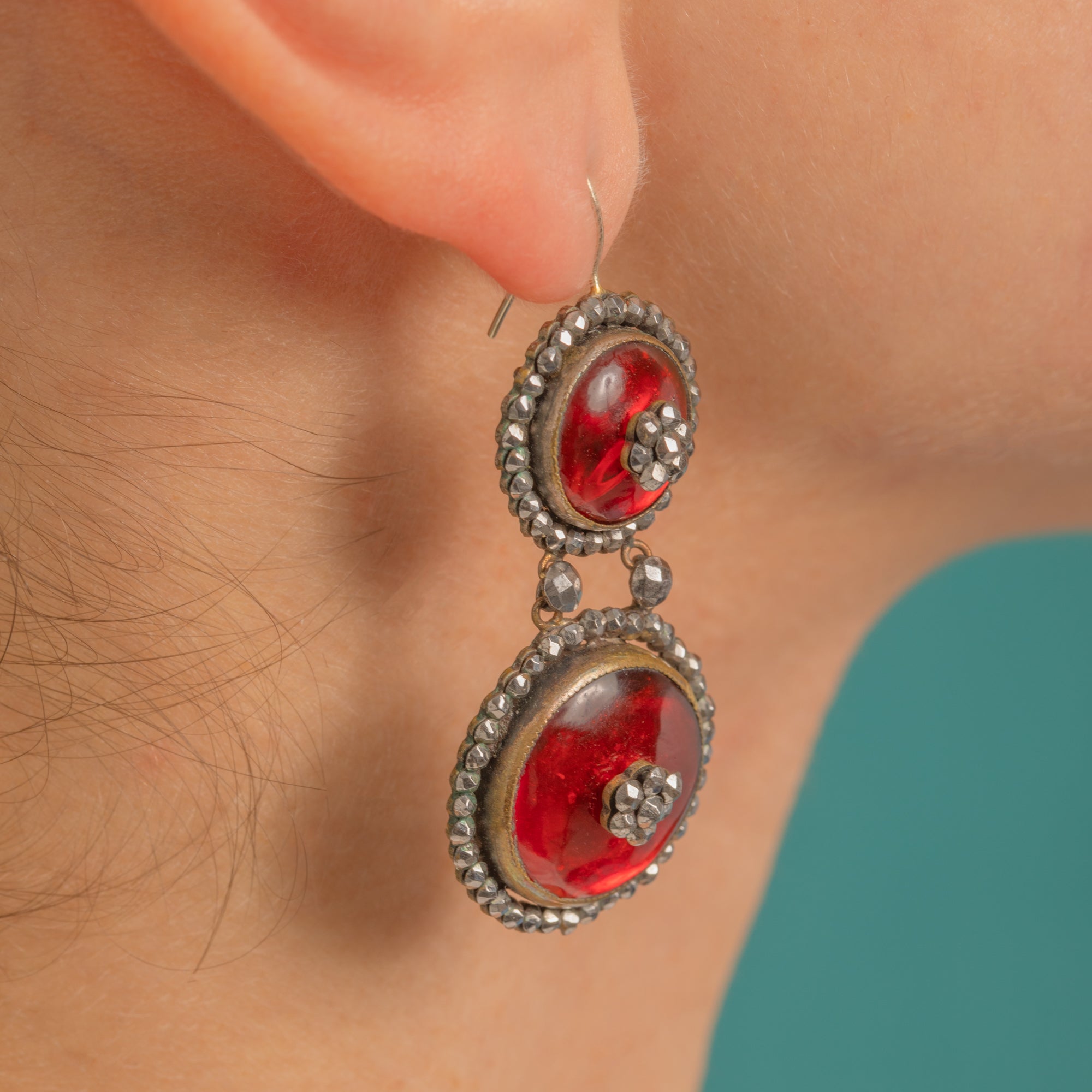 Romantic and bold, these Georgian double-drop earrings glow with luscious deep-red Paste domes encircled by scintillating Cut Steel halos. The articulated “target” design dances with the light, each high-domed centre crowned by a tiny rosette and framed in warm Gold-toned bezels for a striking contrast against the darker, steel-toned sparkle.