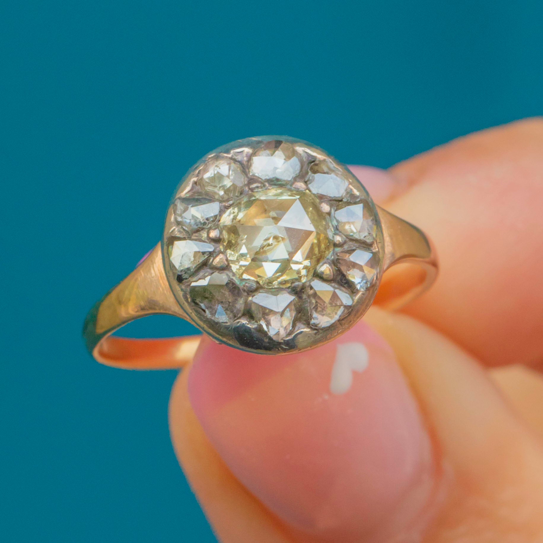 EXCELLENT. This exquisite Georgian Rose-cut Diamond cluster ring is remarkably well-preserved, showcasing its timeless beauty despite its age. The dazzling Rose-cut Diamonds gleam with brilliance, illuminating its allure. Though resized over time, with one half crafted in 9ct Gold and the other in 15ct Gold, the integrity of the design remains intact. With the Diamonds delicately set in silver, this enchanting piece exudes charm and elegance. Embrace the magic of this captivating ring and revel in its enduring enchantment!