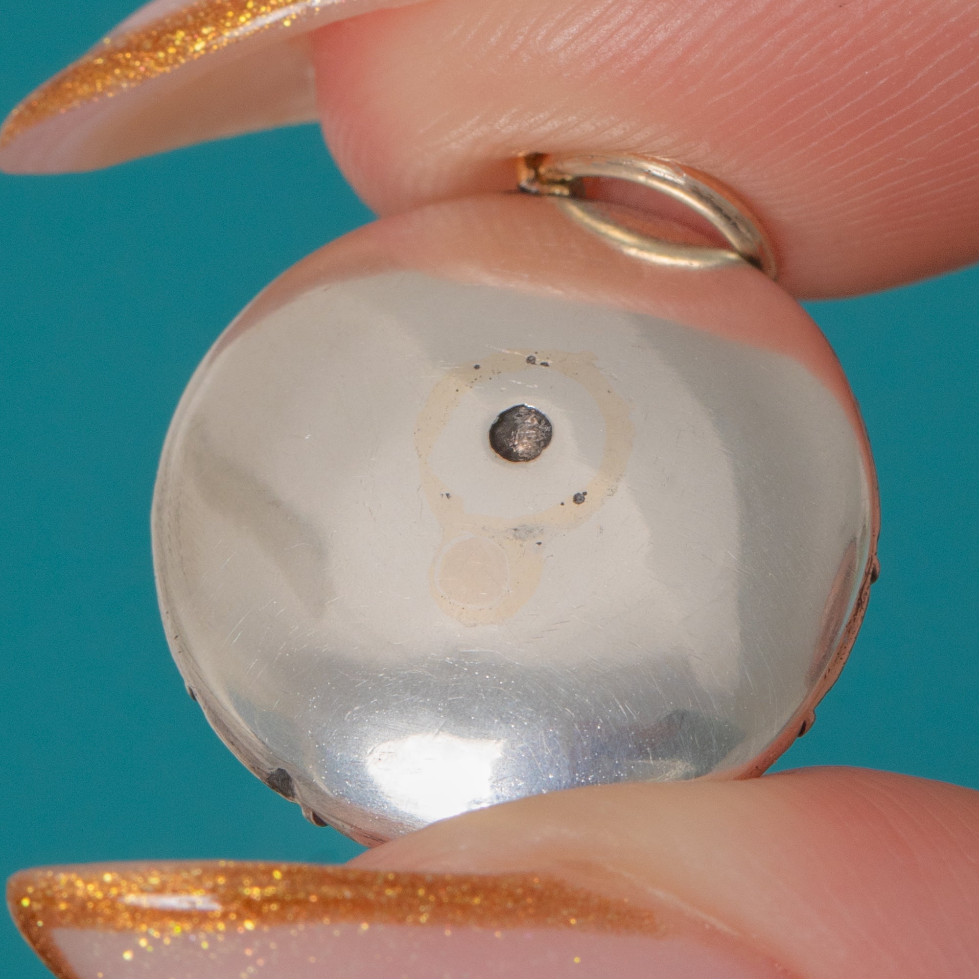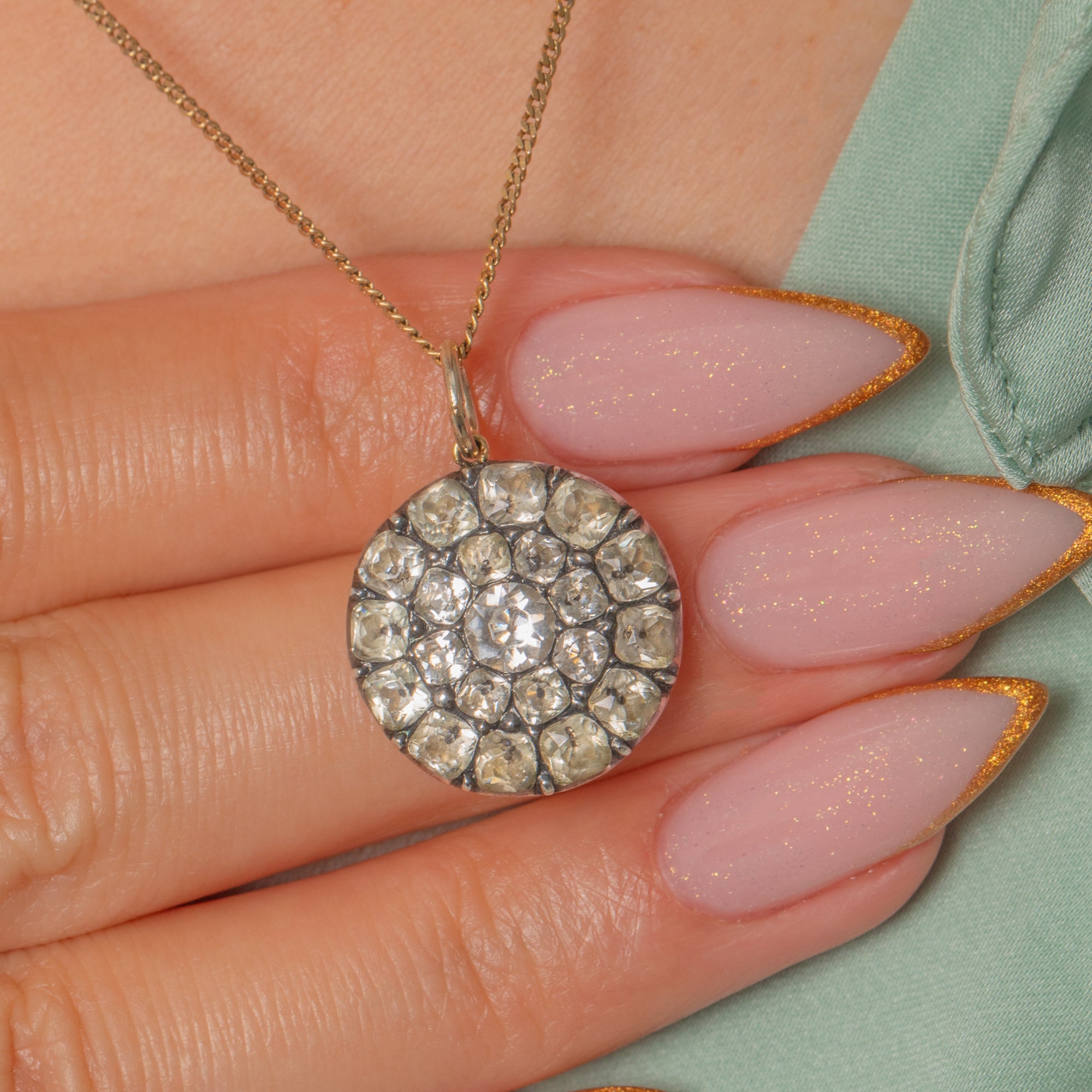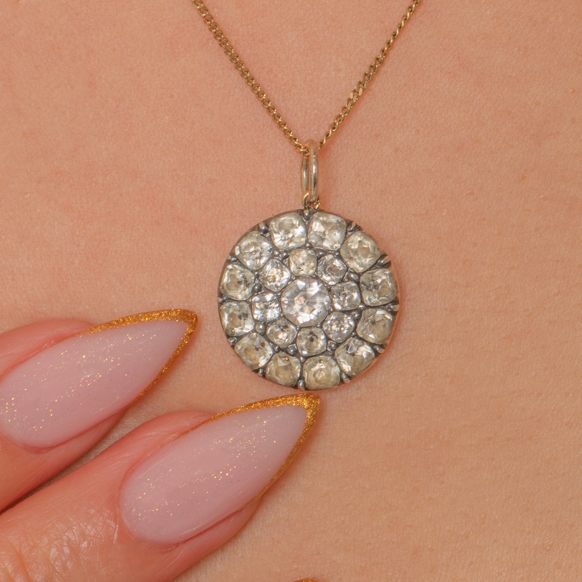This exquisite Georgian pendant shimmers with a halo of bright Black Dot Paste stones set in Silver. Arranged in a perfect circular cluster, the graduated stones create a mesmerising play of light reminiscent of early Diamond jewels. The foil-backed stones sparkle with depth and warmth, a hallmark of fine 18th-century craftsmanship.