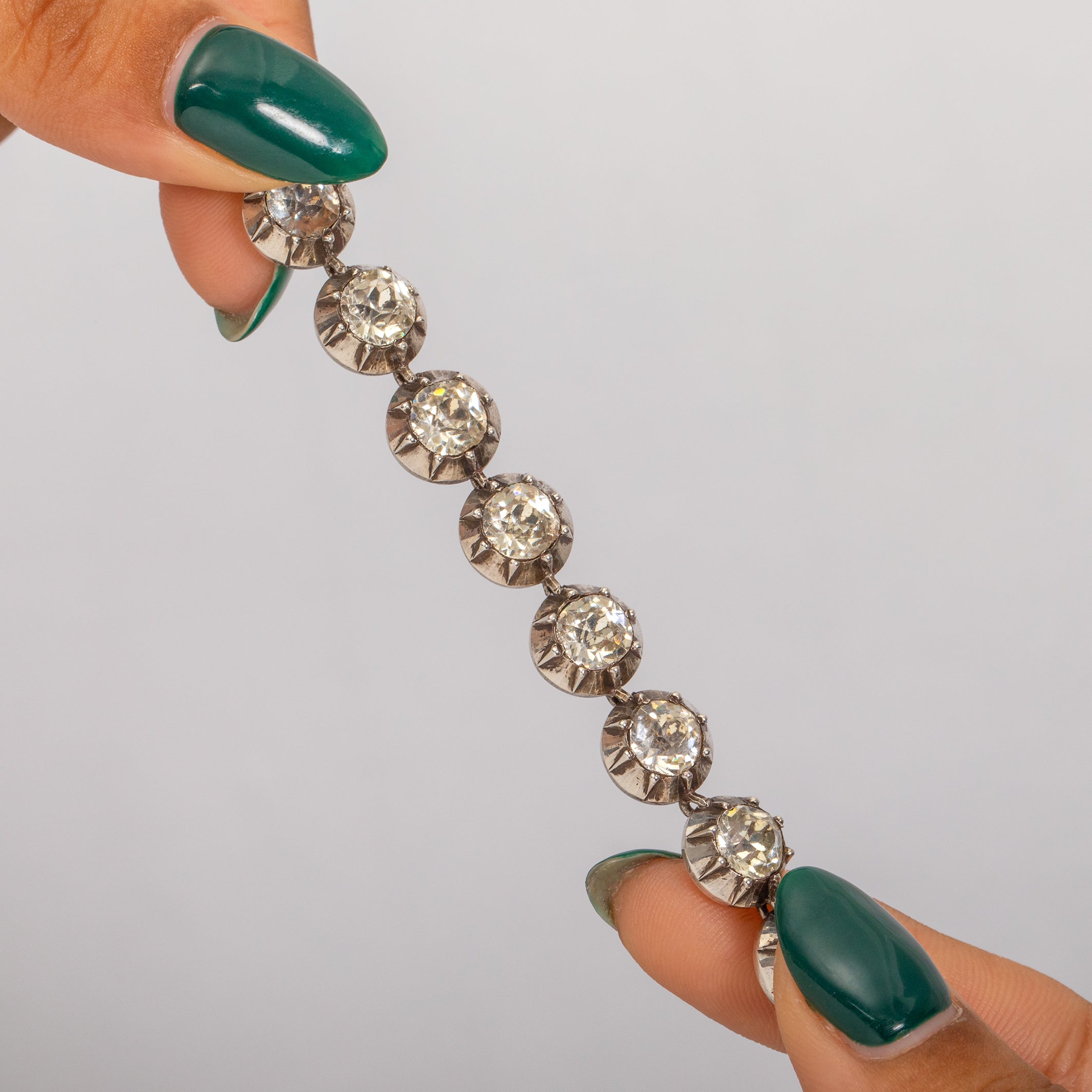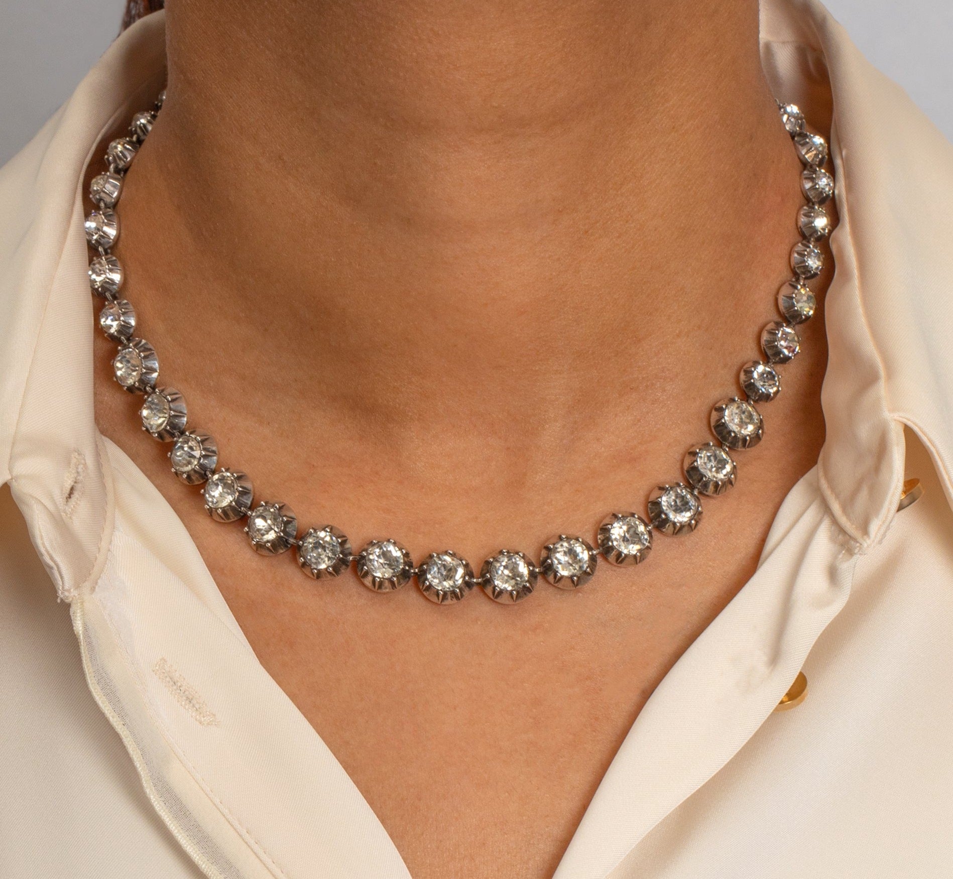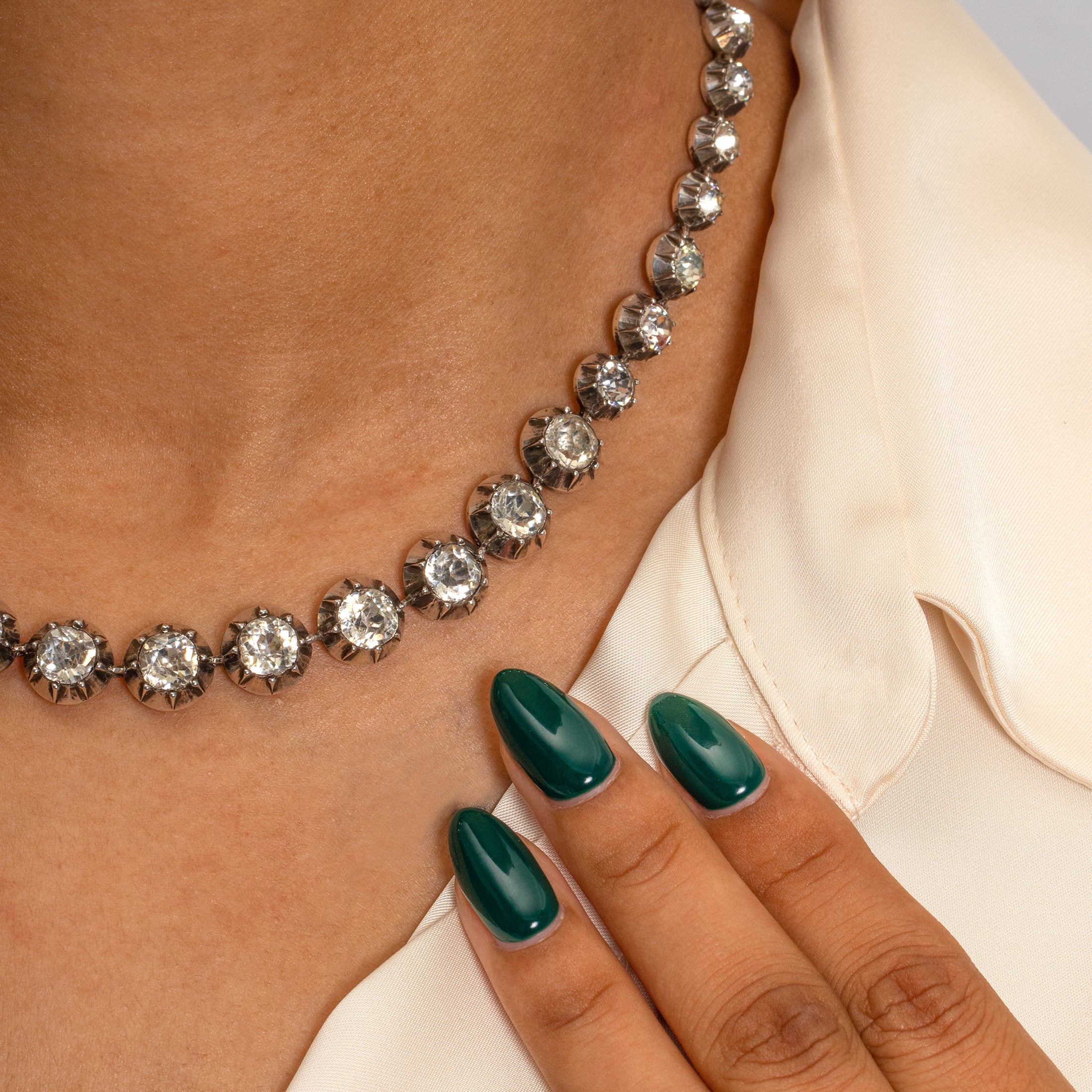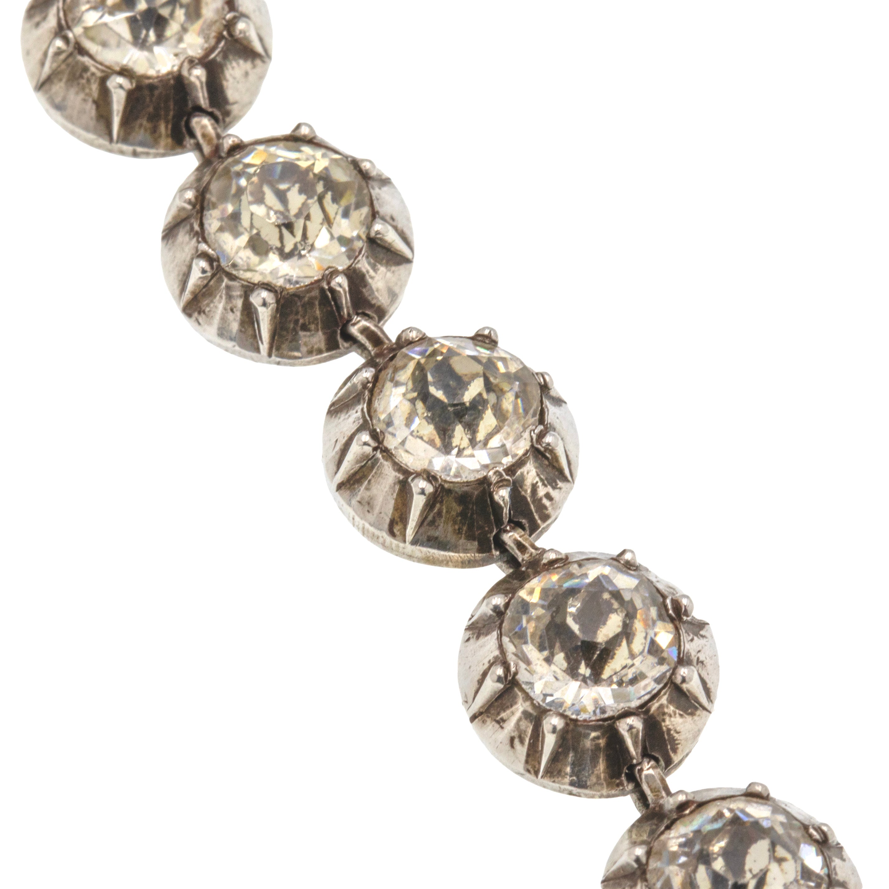 VERY GOOD. This Georgian Silver Paste rivière necklace is in very good antique condition. The Paste gemstones have reatined their scintillating sparkle and are all securely held within their collet settings. There is some light wear on the settings, commensurate with age, but this does not affect the integrity of the piece. The Silver is lustrous and has accrued an admirable patina creating a striking contrast. The tongue clasp is in fine working condition and promises years of wear and enjoyment!