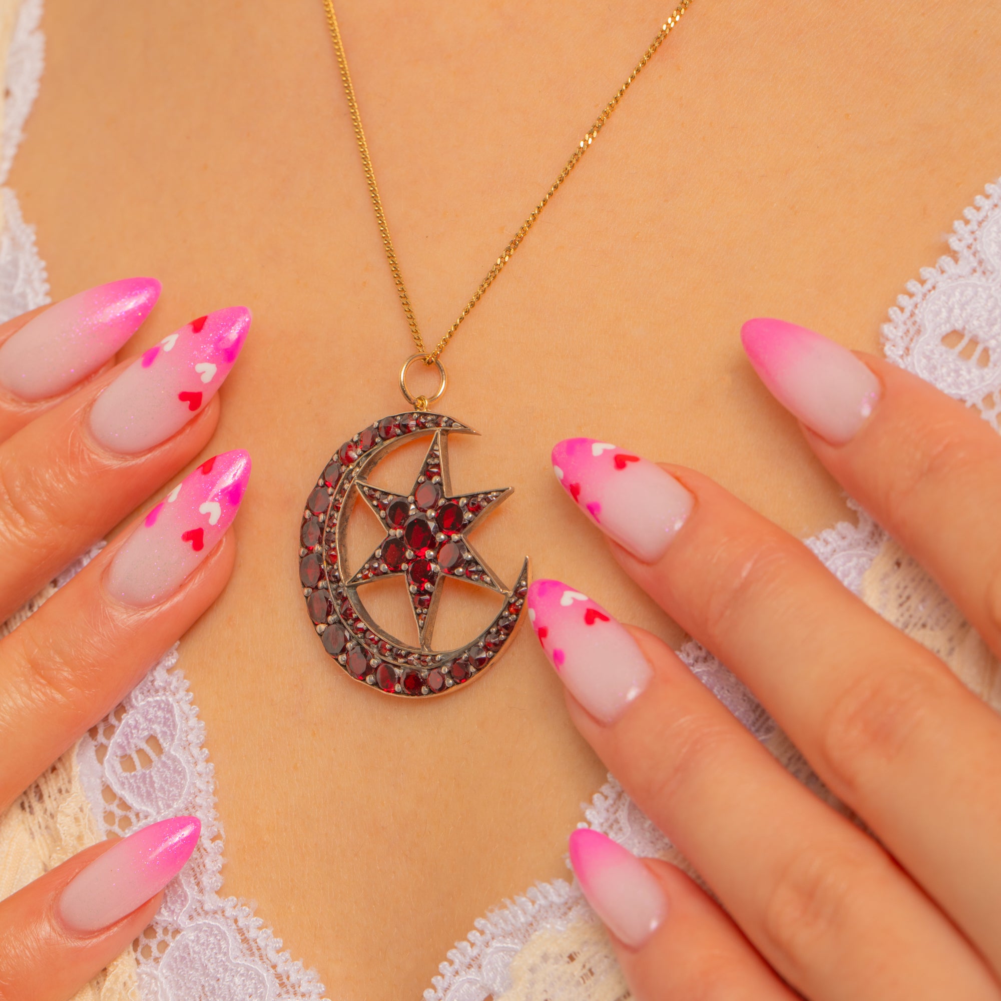 A romantic Victorian celestial pendant, this glossy crescent moon tenderly cradles a five-point star, all ablaze with deep wine-red Garnets. Each stone is neatly set in a beautifully executed openwork frame, creating a rich tapestry of sparkle and glow that feels both opulent and timeless.