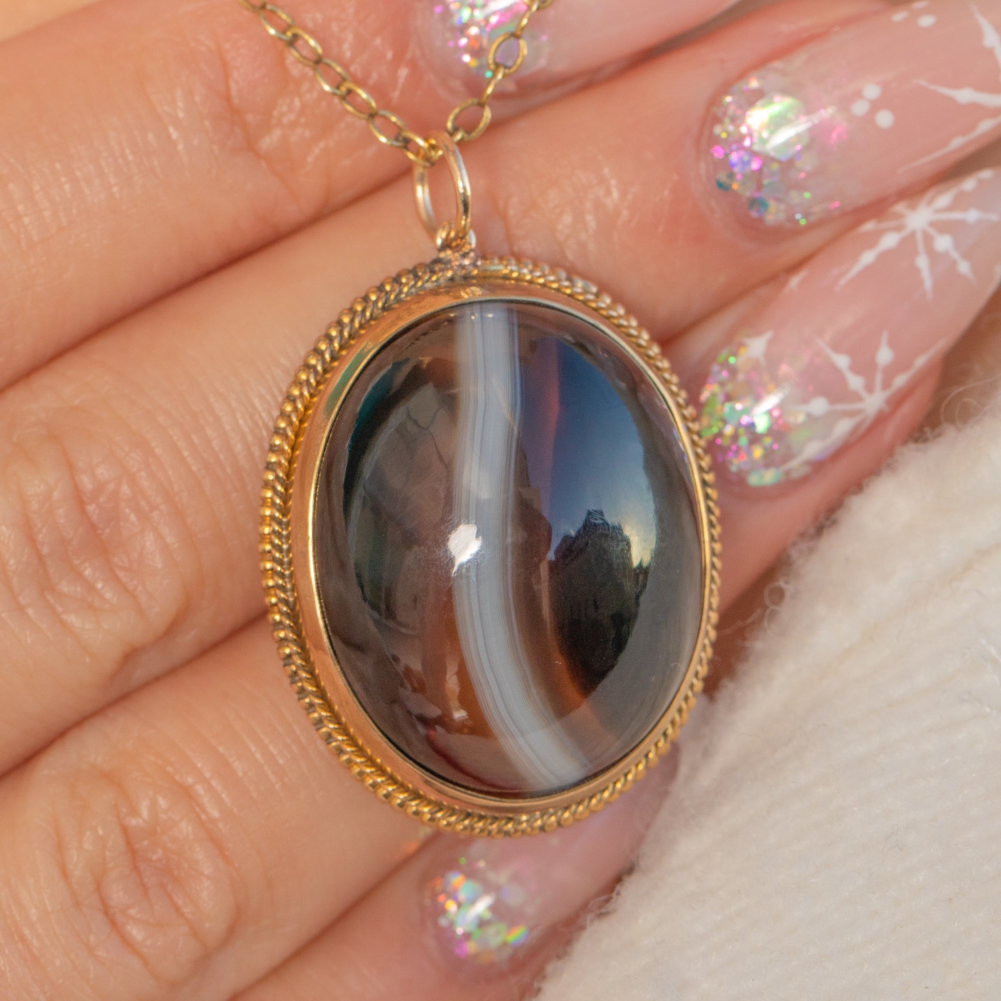 This glowing Victorian banded Agate charm pendant is a true miniature masterpiece. The richly striped cabochon shows dramatic flashes of fiery red, chocolate and inky black, cut en cabochon so the colours seem to roll across the surface as it moves. Framed in a rope-edged Gold-coloured mount, it has all the presence and romance you’d hope for from a 19th-century talisman.