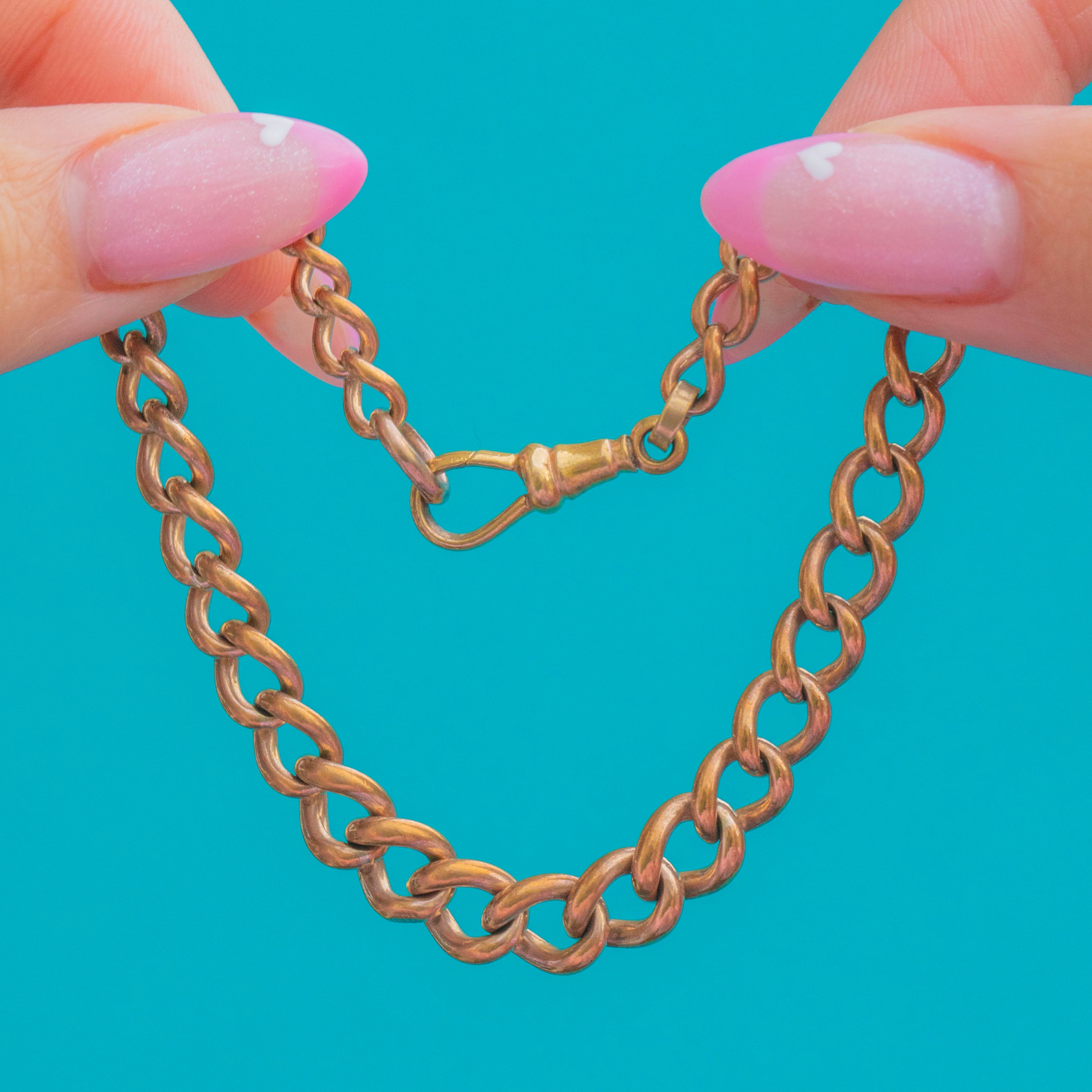 A lovely Victorian curb link bracelet with a warm Gold-toned finish and a classic dog-clip clasp. The solid, tactile links and subtle antique patina make this piece effortlessly wearable, whether stacked with other chains or suspending a charm from its dog clip.