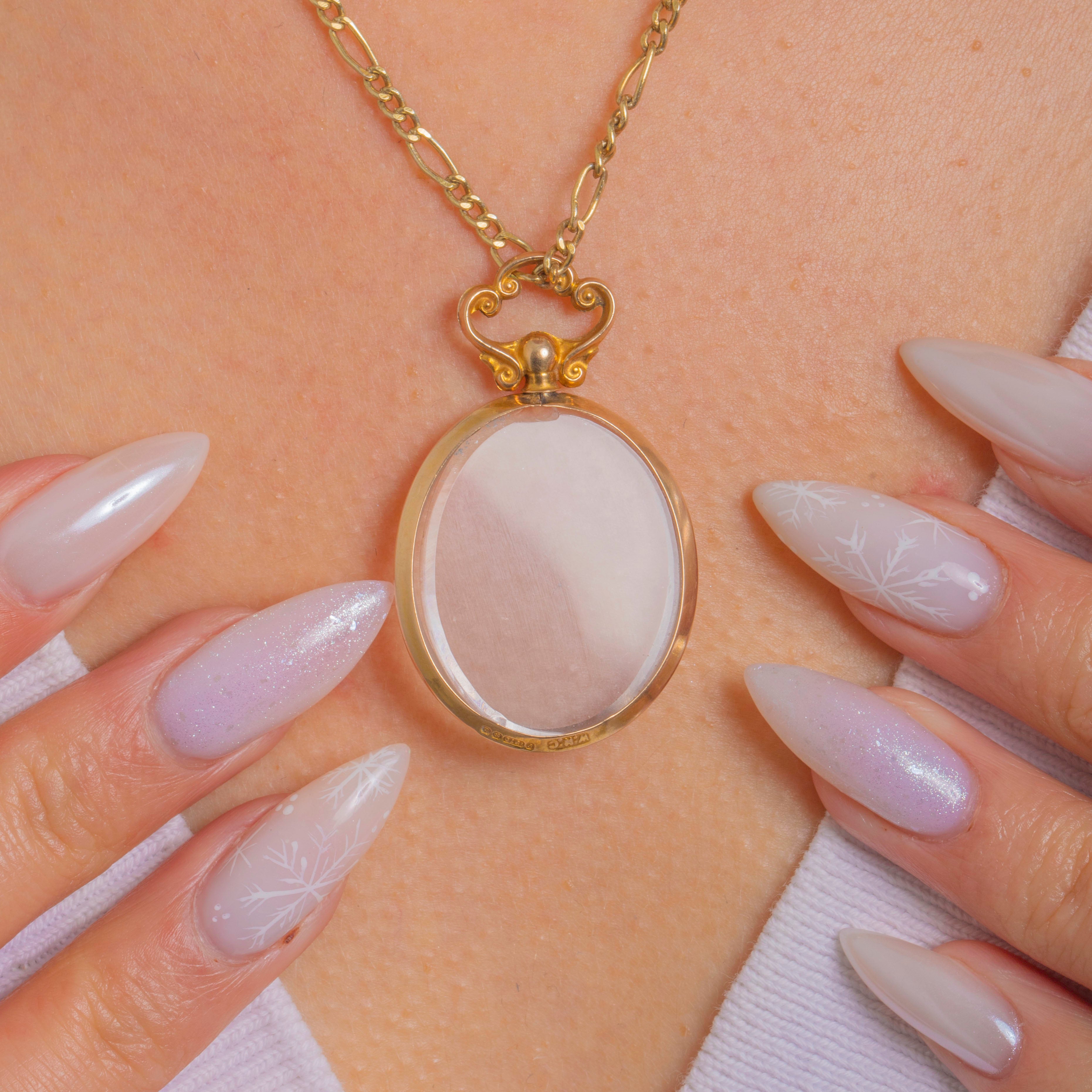 Elegantly minimalist with a flourish of ornament, this antique 9ct Gold oval portrait locket presents twin clear glass windows within a slim polished bezel, crowned by a delicate scrolled surmount. The integrated bail is joined by a neat knuckle, creating a graceful silhouette that feels both classic and refined.