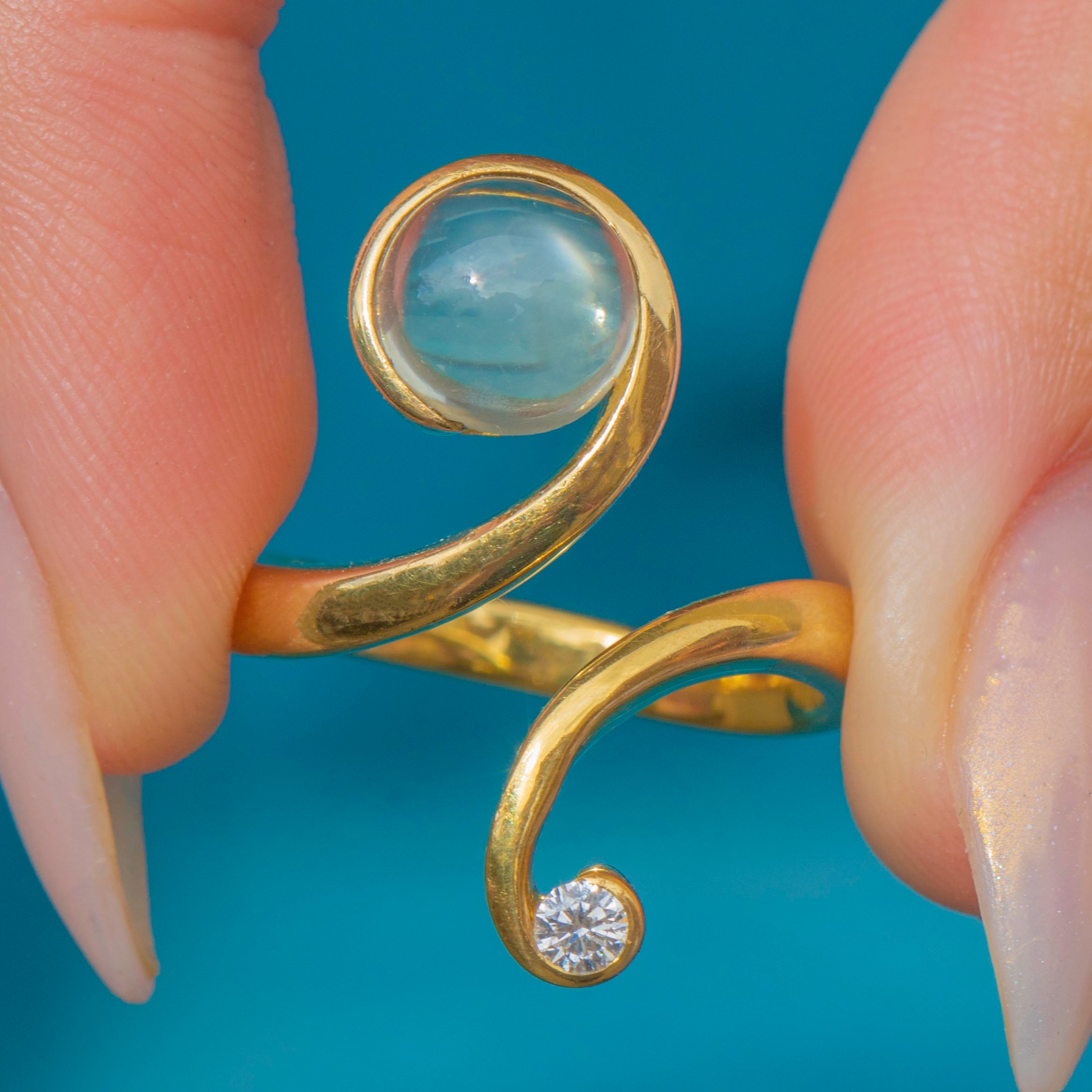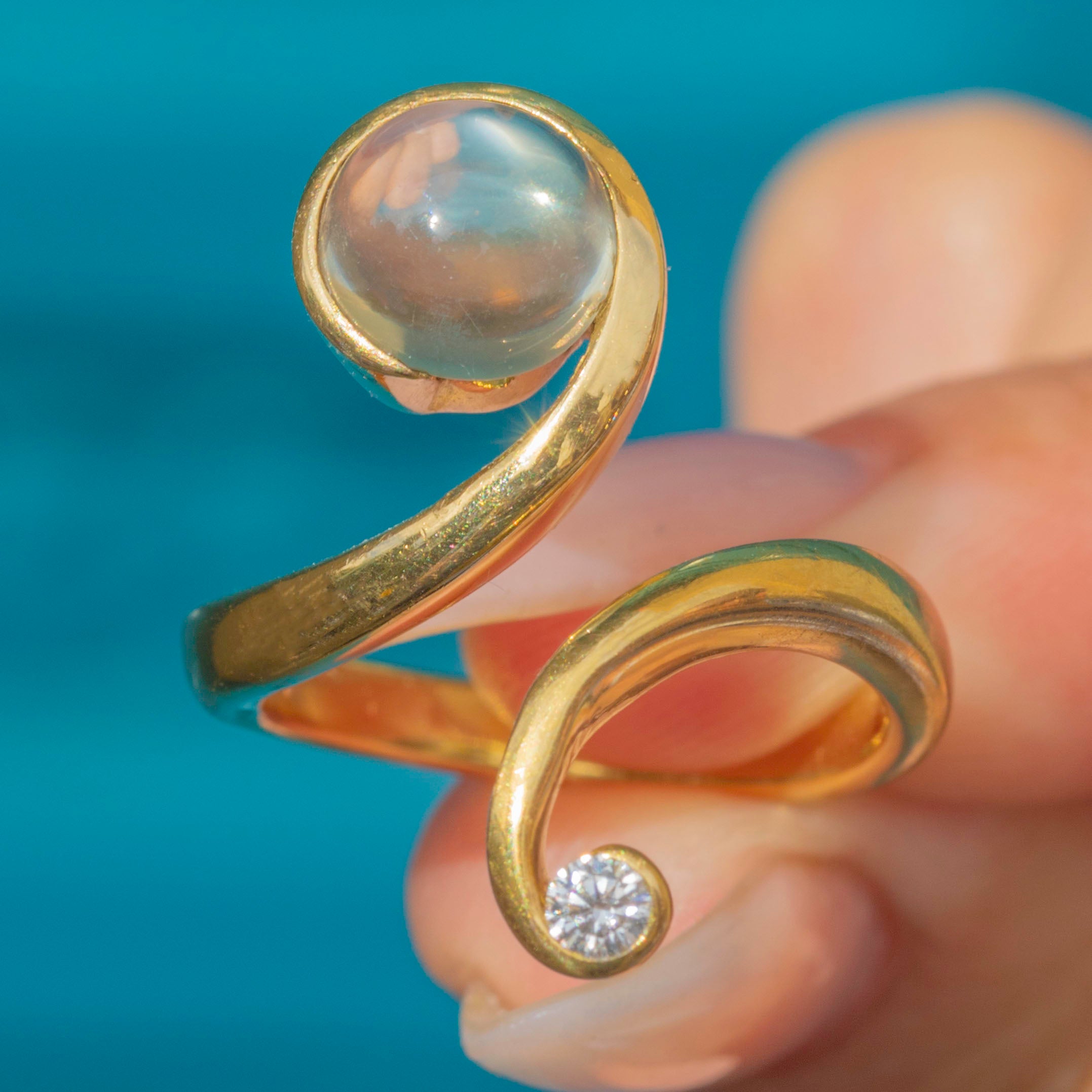 This bold contemporary “swirl” ring is crafted in solid 18ct Gold, set with a luminous high-dome Moonstone and a sparkling Diamond accent. The Moonstone displays a silvery-blue schiller that glows beautifully as the stone moves in the light.