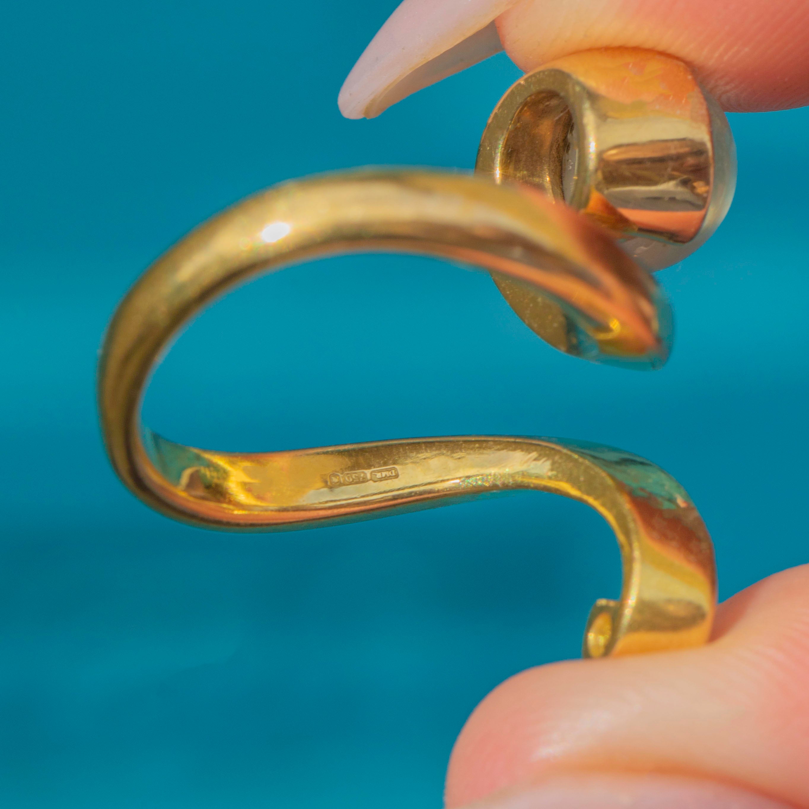 Opposite sits a crisp round brilliant cut Diamond, neatly bezel set into the Gold. The sculptural swirl design wraps fluidly around the finger, with a weighty feel at 9g. A modern and stylish statement piece.