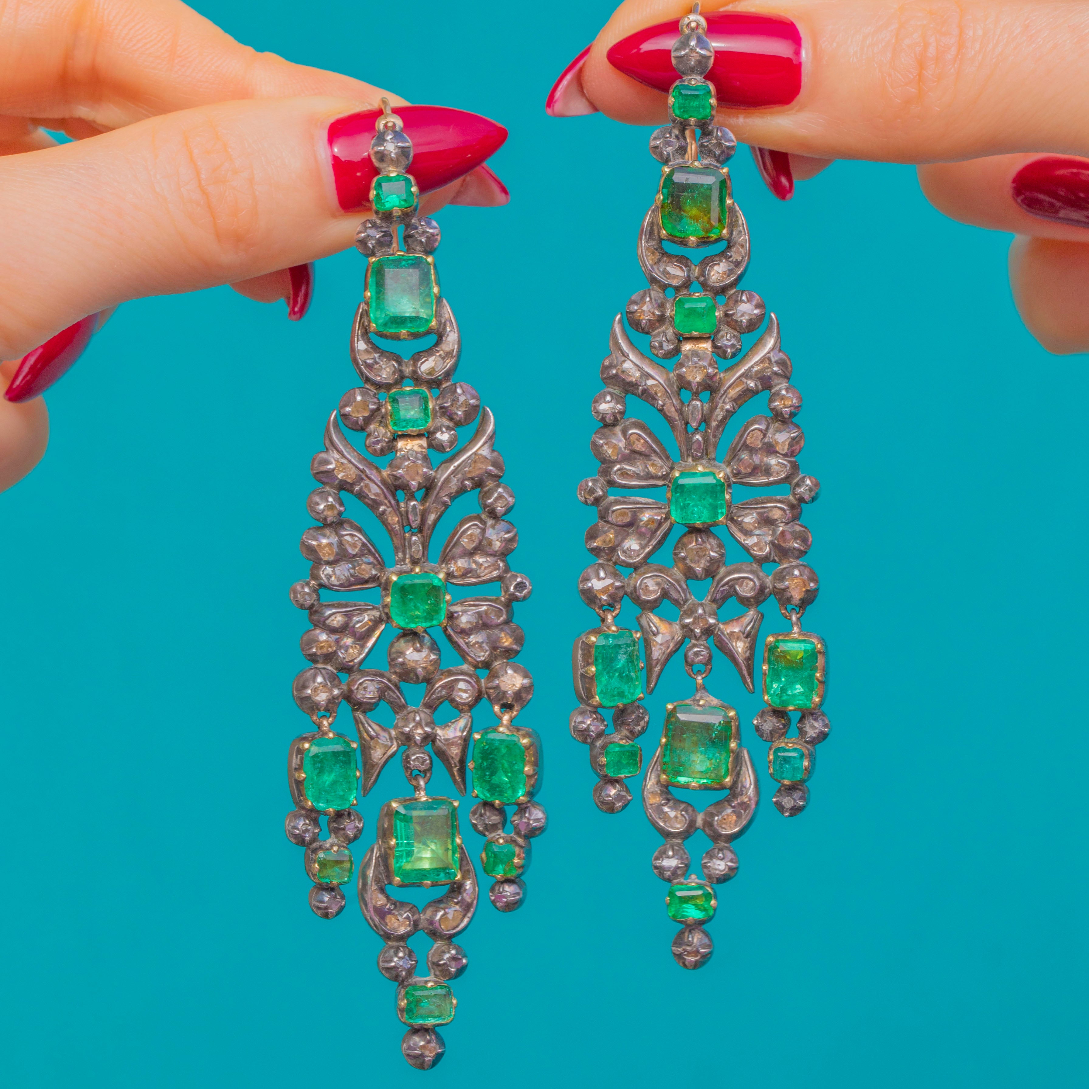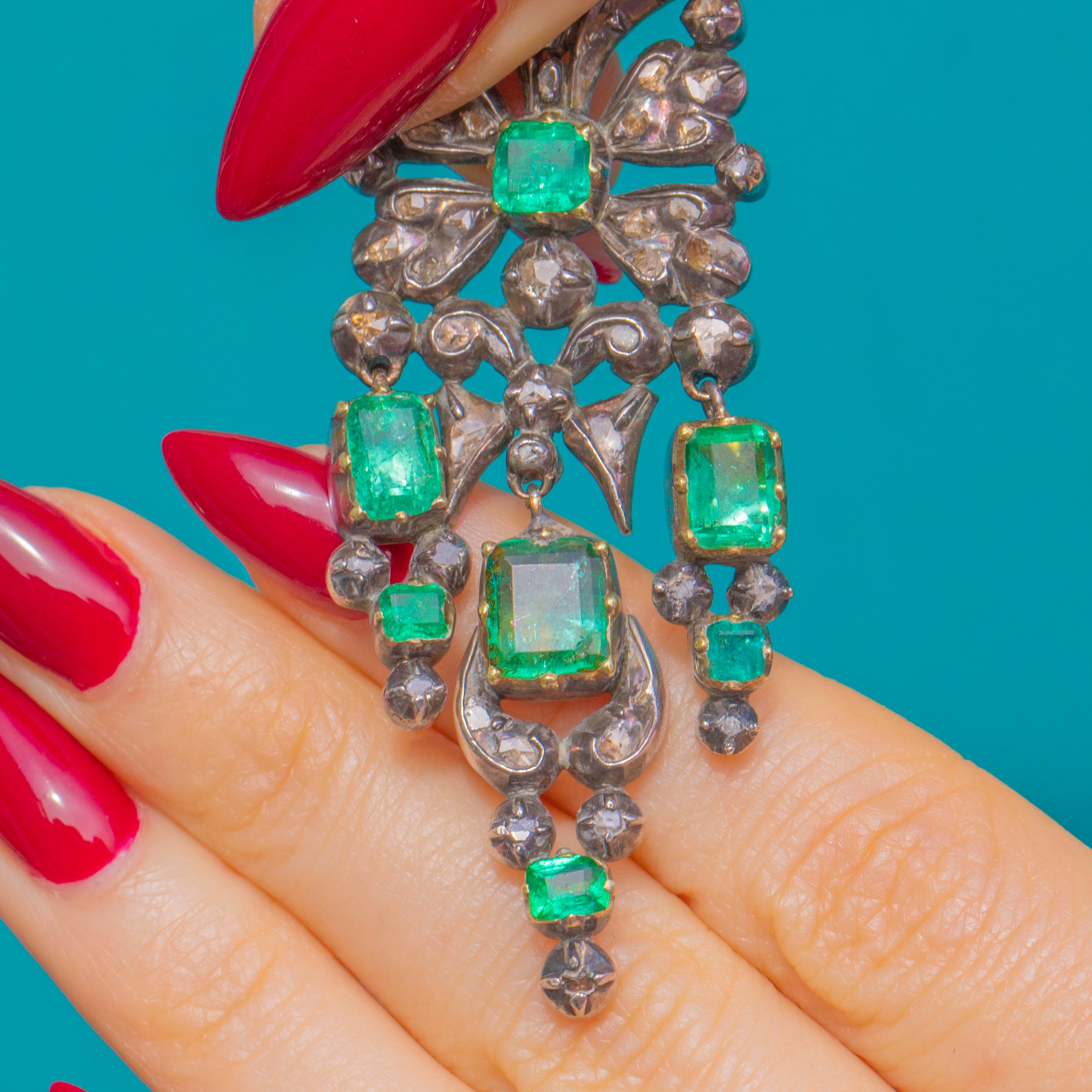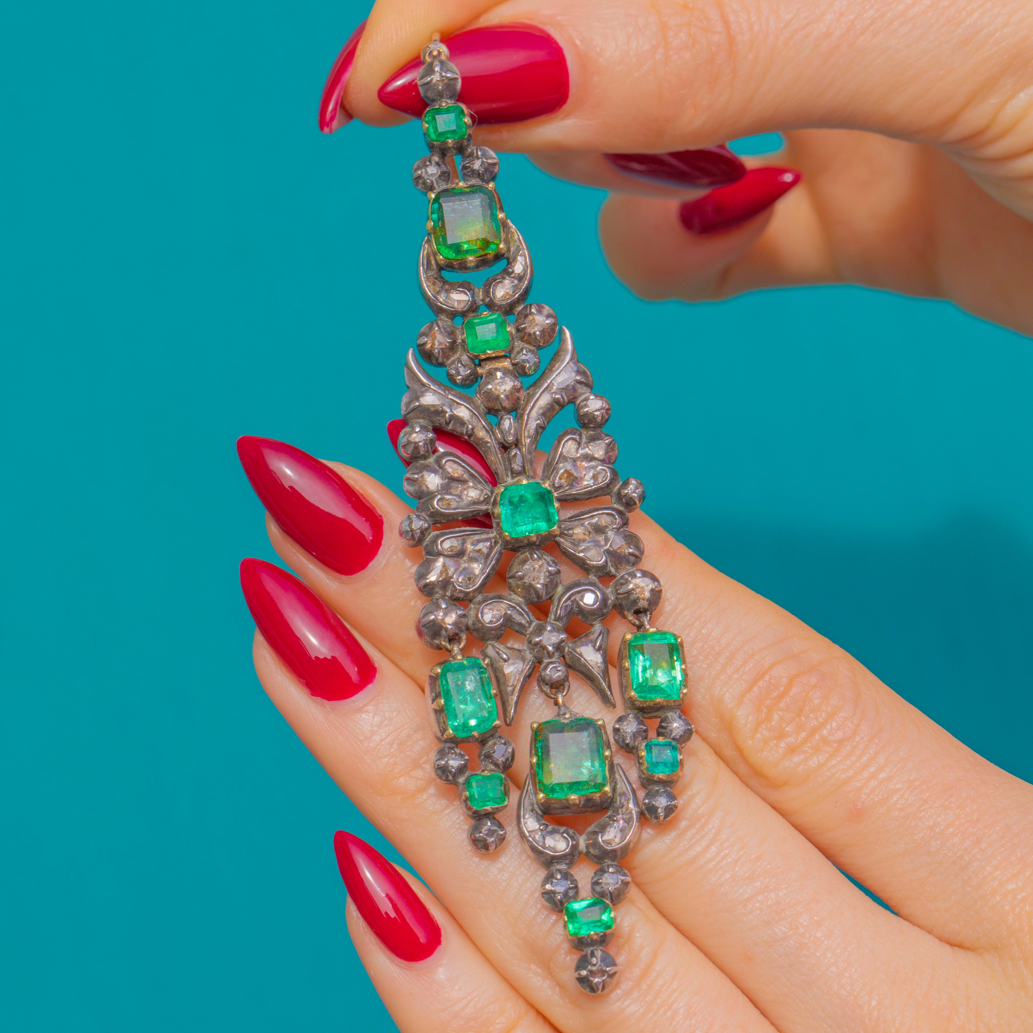 VERY GOOD: We are so excited to present this piece, an exquisite find of museum quality. The Emeralds show some age-consistent facet wear and small abrasions, with natural inclusions visible; one small Diamond is missing and several Rose-Cut Diamonds display gentle abrasion/cloudiness under magnification. The Silver settings and articulated links are secure with an attractive antique patina, and the 18ct Gold hooks are in good order. There is a small ding on the back of one of the earrings, not noticeable during wear. Overall wear is in keeping with an 18th-century jewel and the pair has been well cared for.