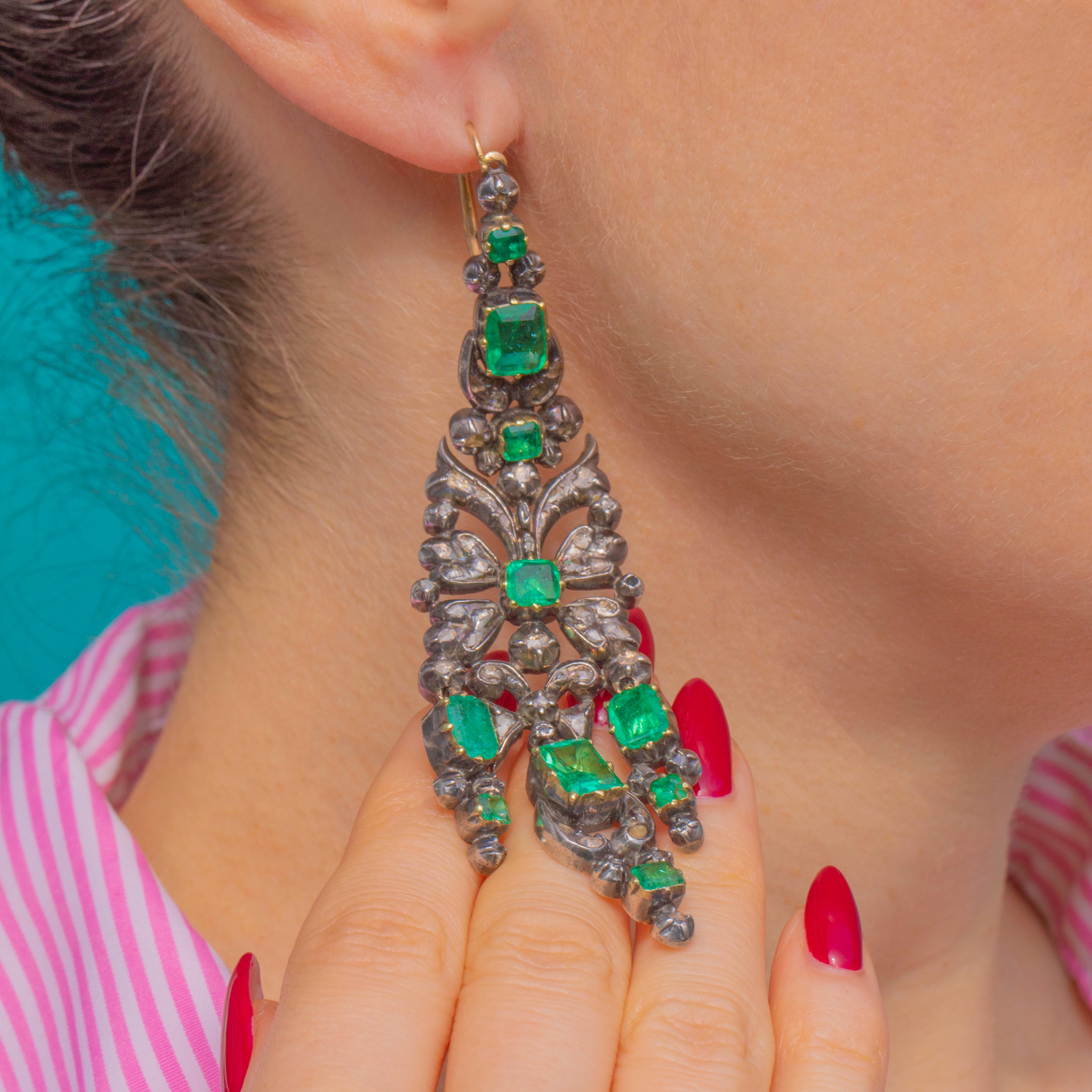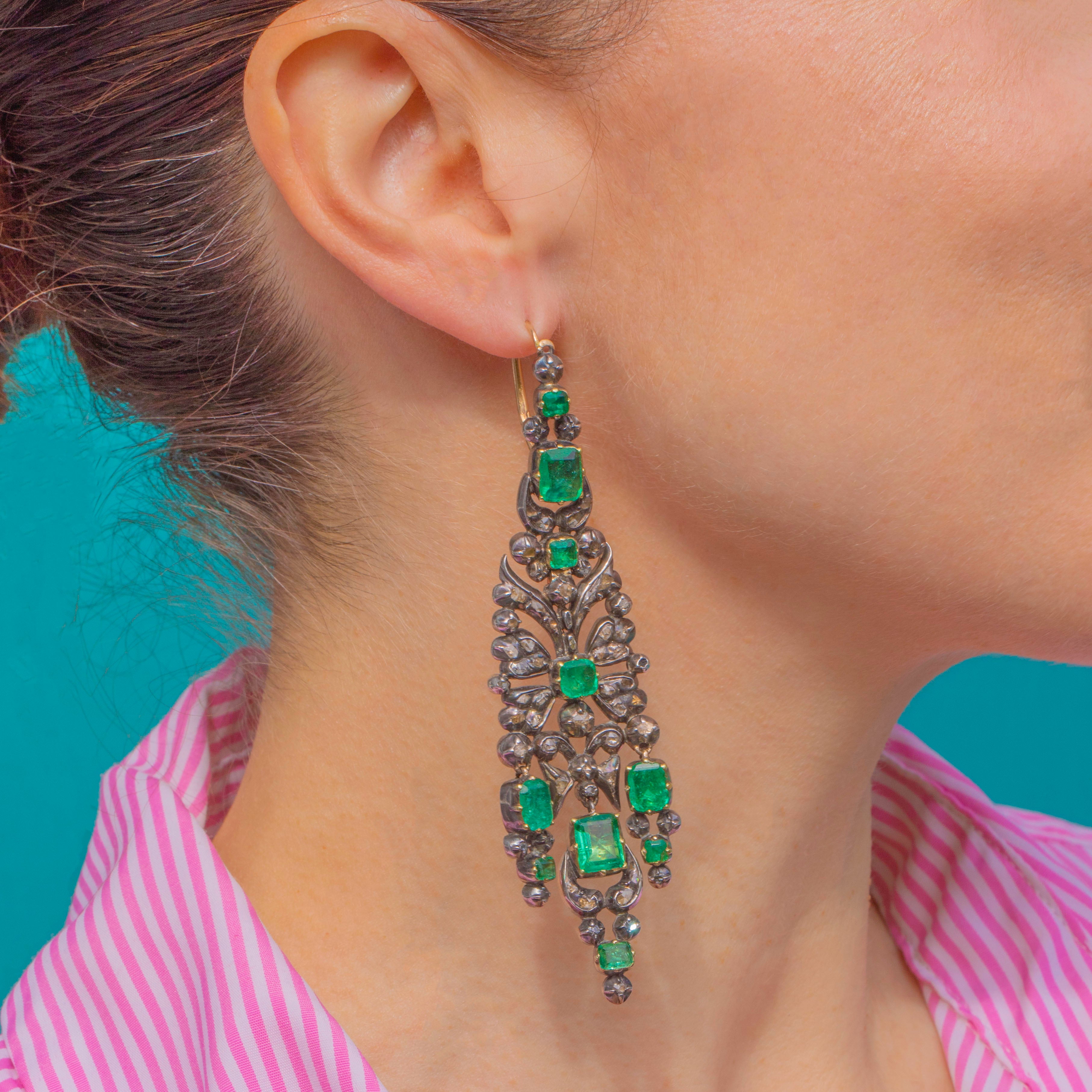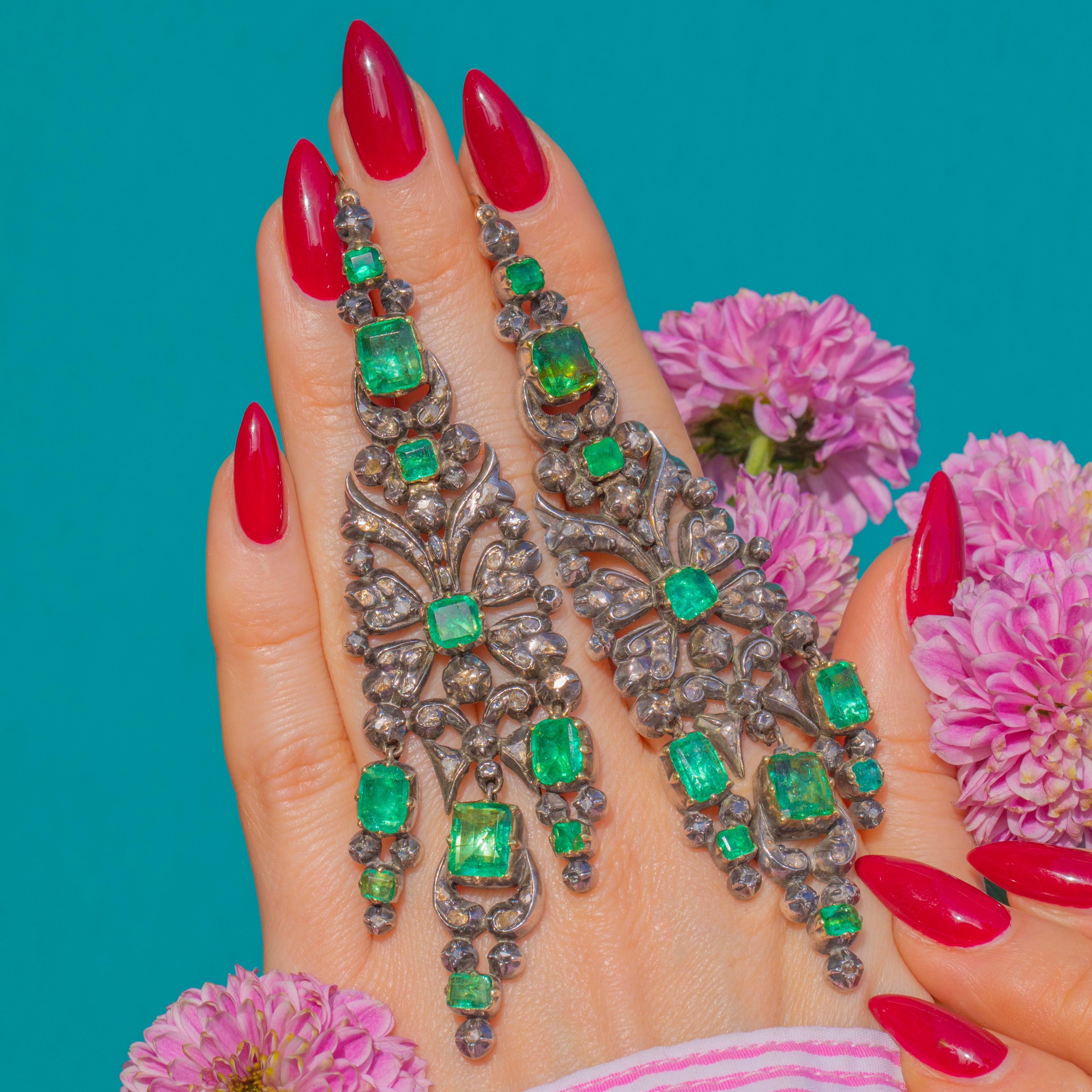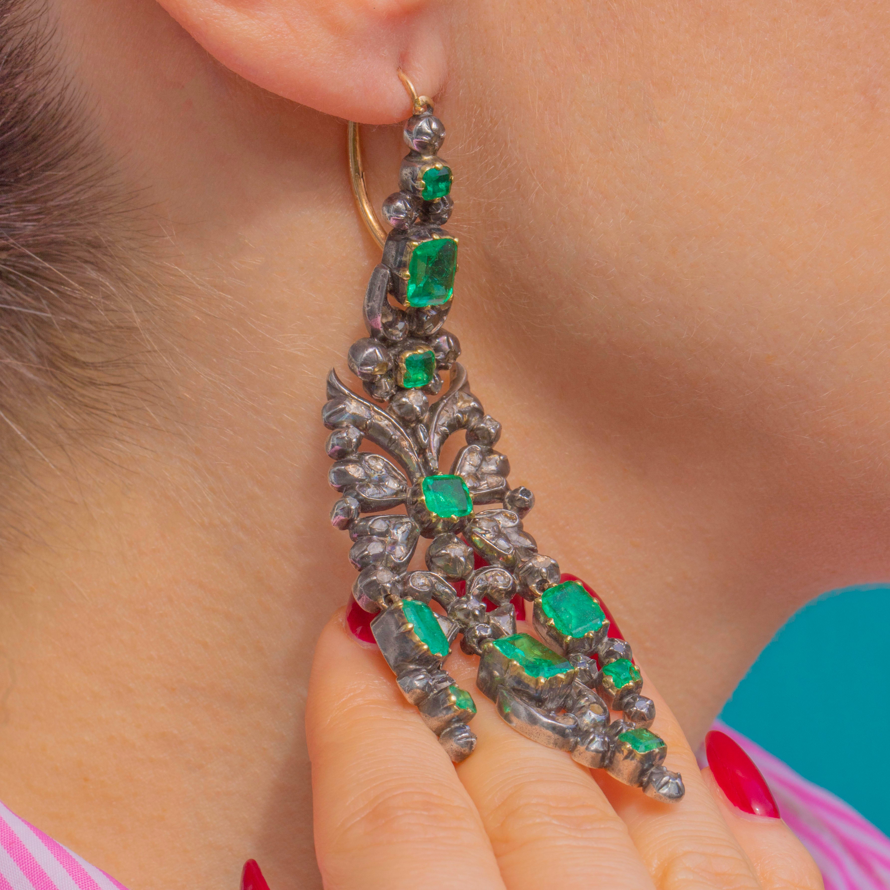 VERY GOOD: We are so excited to present this piece, an exquisite find of museum quality. The Emeralds show some age-consistent facet wear and small abrasions, with natural inclusions visible; one small Diamond is missing and several Rose-Cut Diamonds display gentle abrasion/cloudiness under magnification. The Silver settings and articulated links are secure with an attractive antique patina, and the 18ct Gold hooks are in good order. There is a small ding on the back of one of the earrings, not noticeable during wear. Overall wear is in keeping with an 18th-century jewel and the pair has been well cared for.