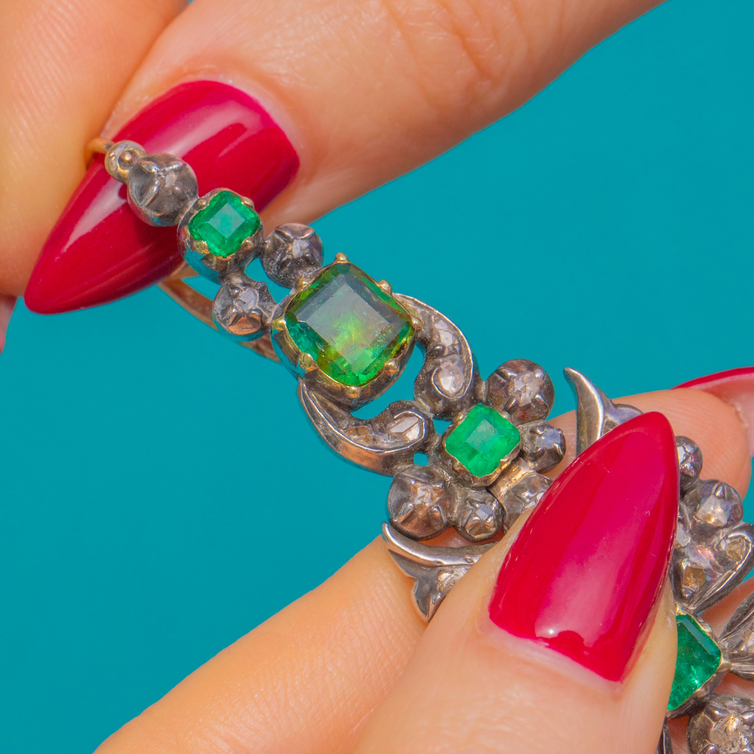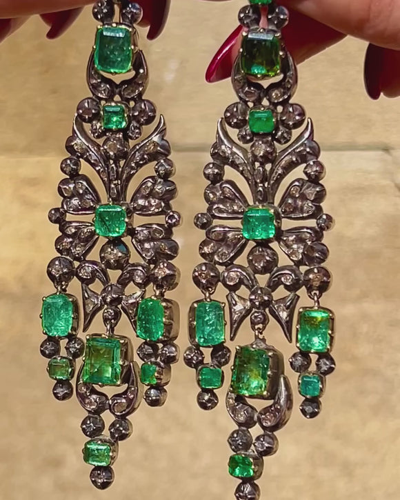 Radiant with Georgian splendour, these Iberian Emerald chandelier earrings cascade in articulated foliate panels, ablaze with 12.30ct of verdant Emeralds framed by twinkling Rose-Cut Diamonds. The two-tone palette—Silver settings with 18ct Gold to the hooks, backs and Emerald collets—heightens the drama, while the openwork scrolls and closed-back collets are quintessential 18th-century hallmarks.